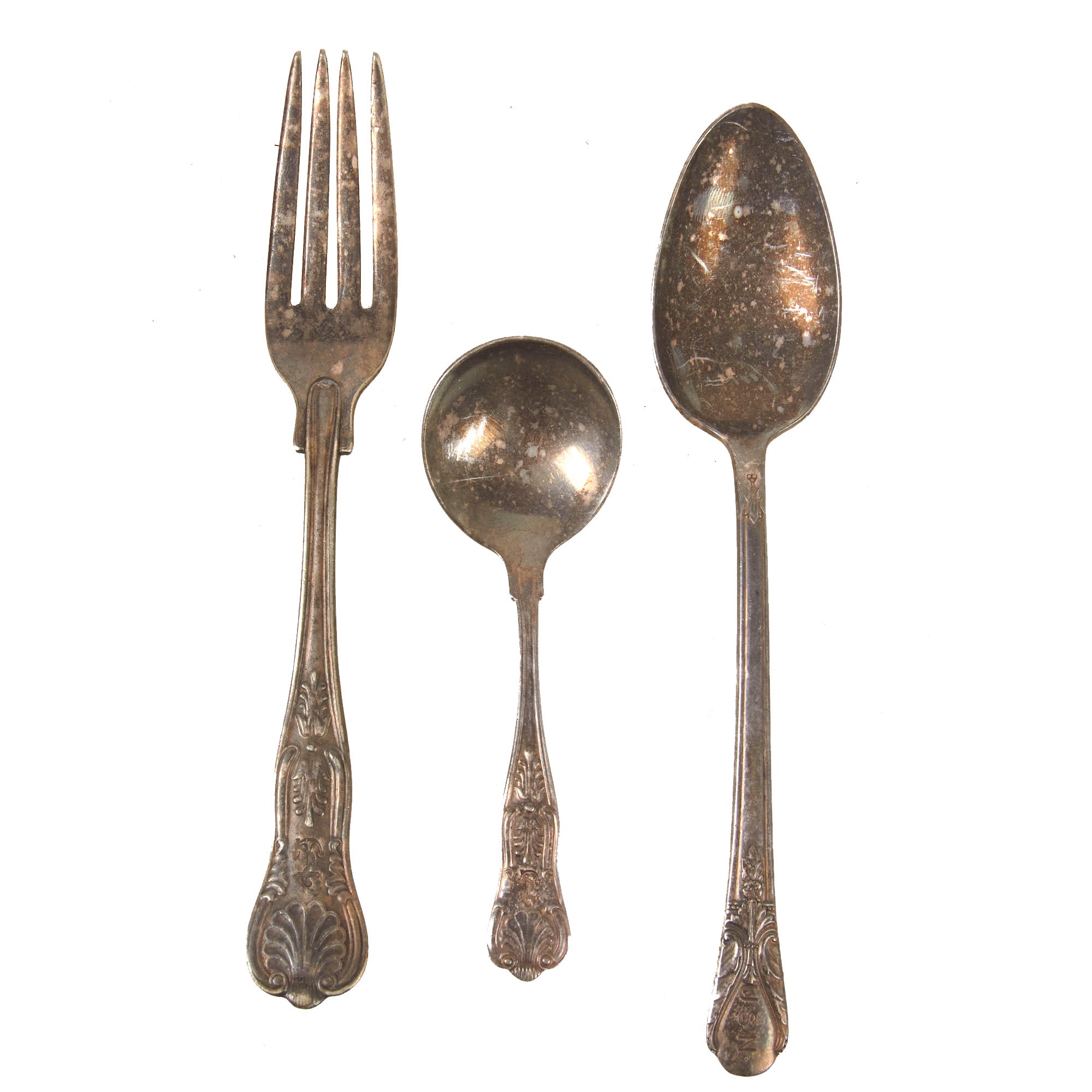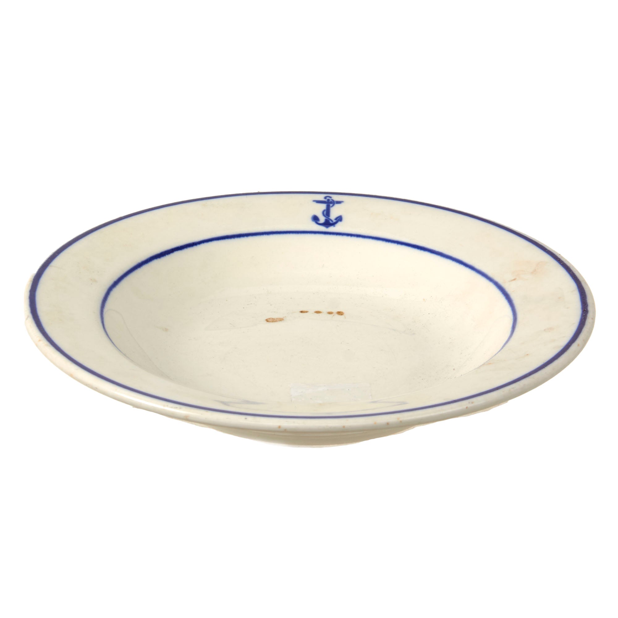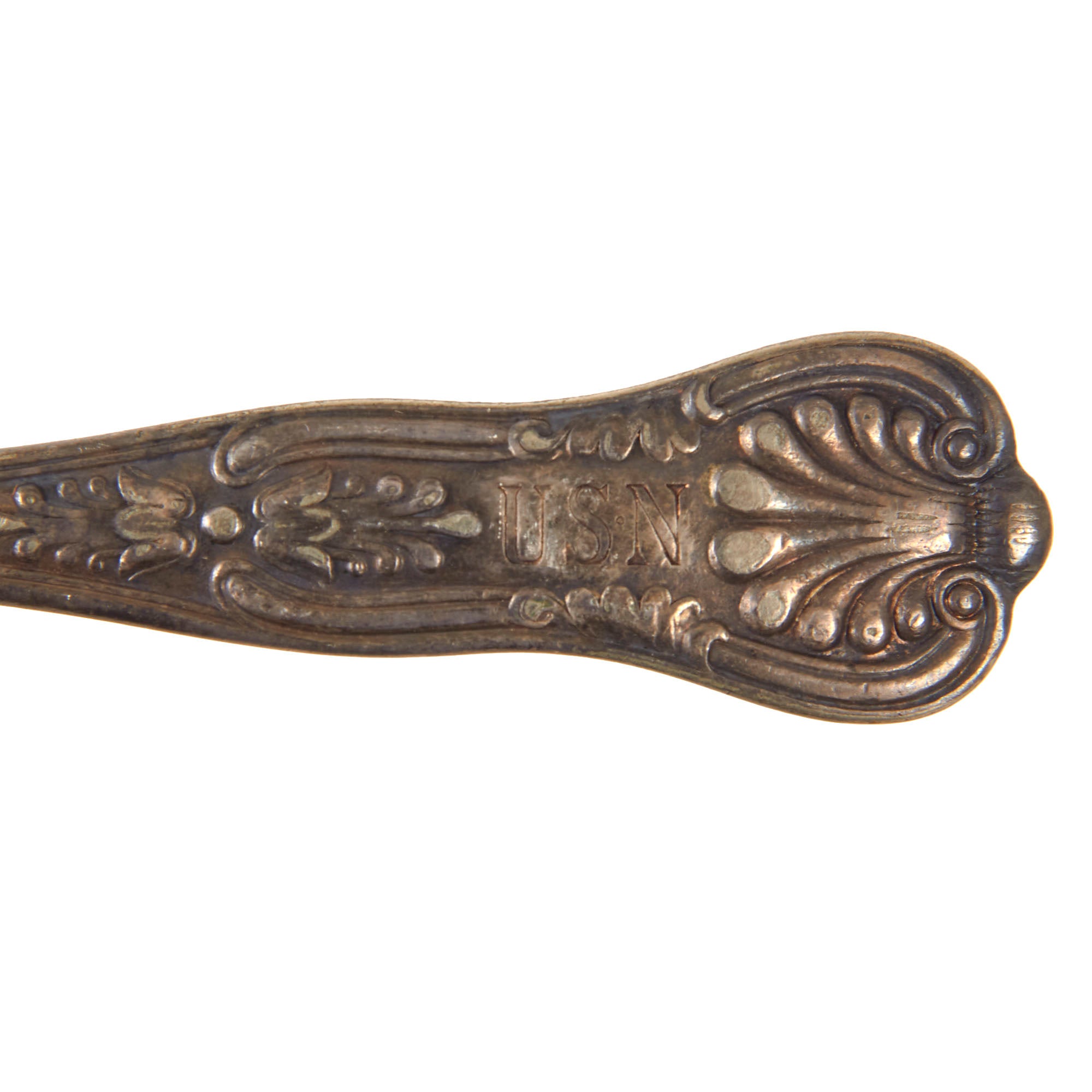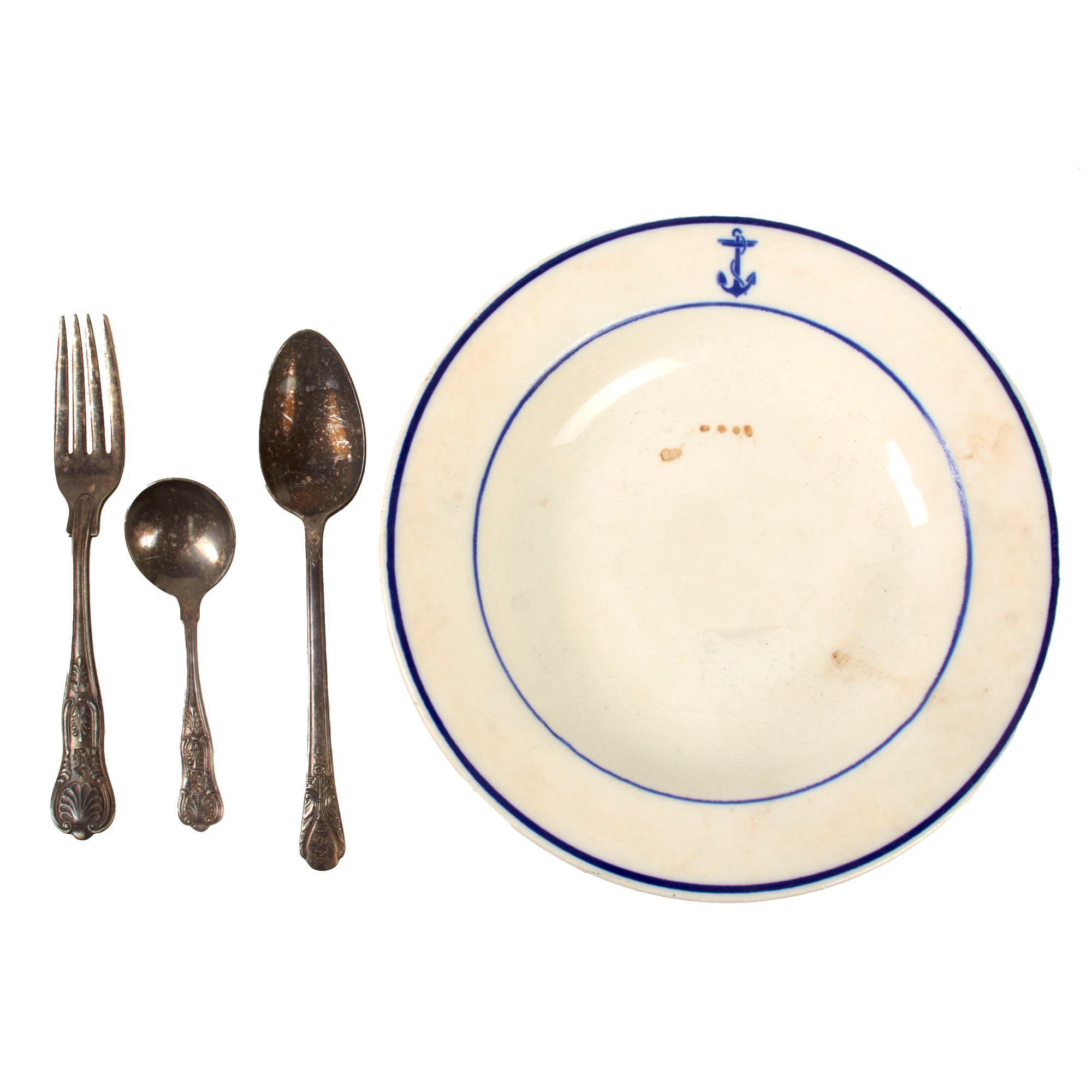- Outstanding U.S. Navy bowl 9” in diameter with three pieces of USN Silverware that were recovered from the wreckage of the USS Arizona, fantastic artifacts. Bowl is marked to Shenango China, Newcastle, Pennsylvania.