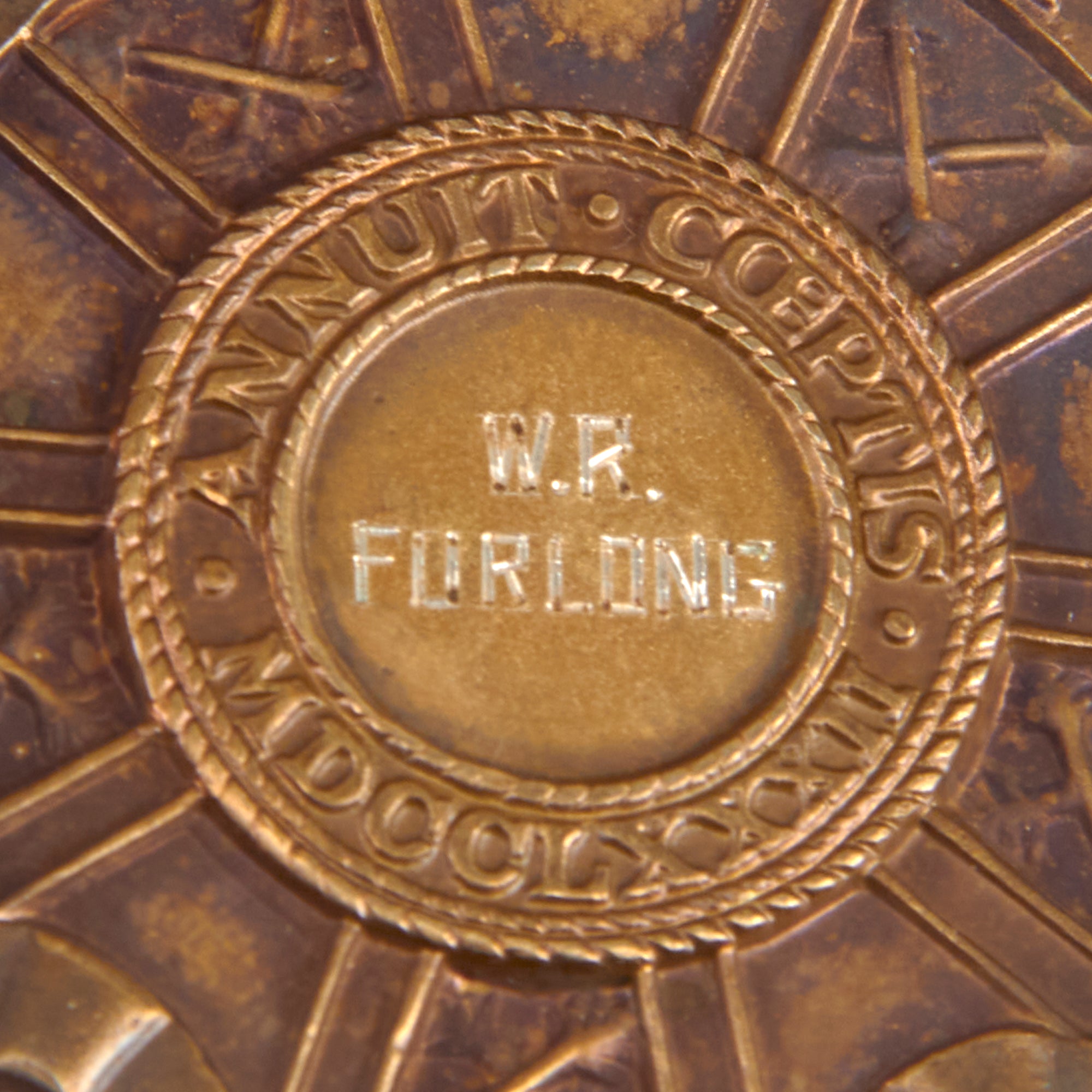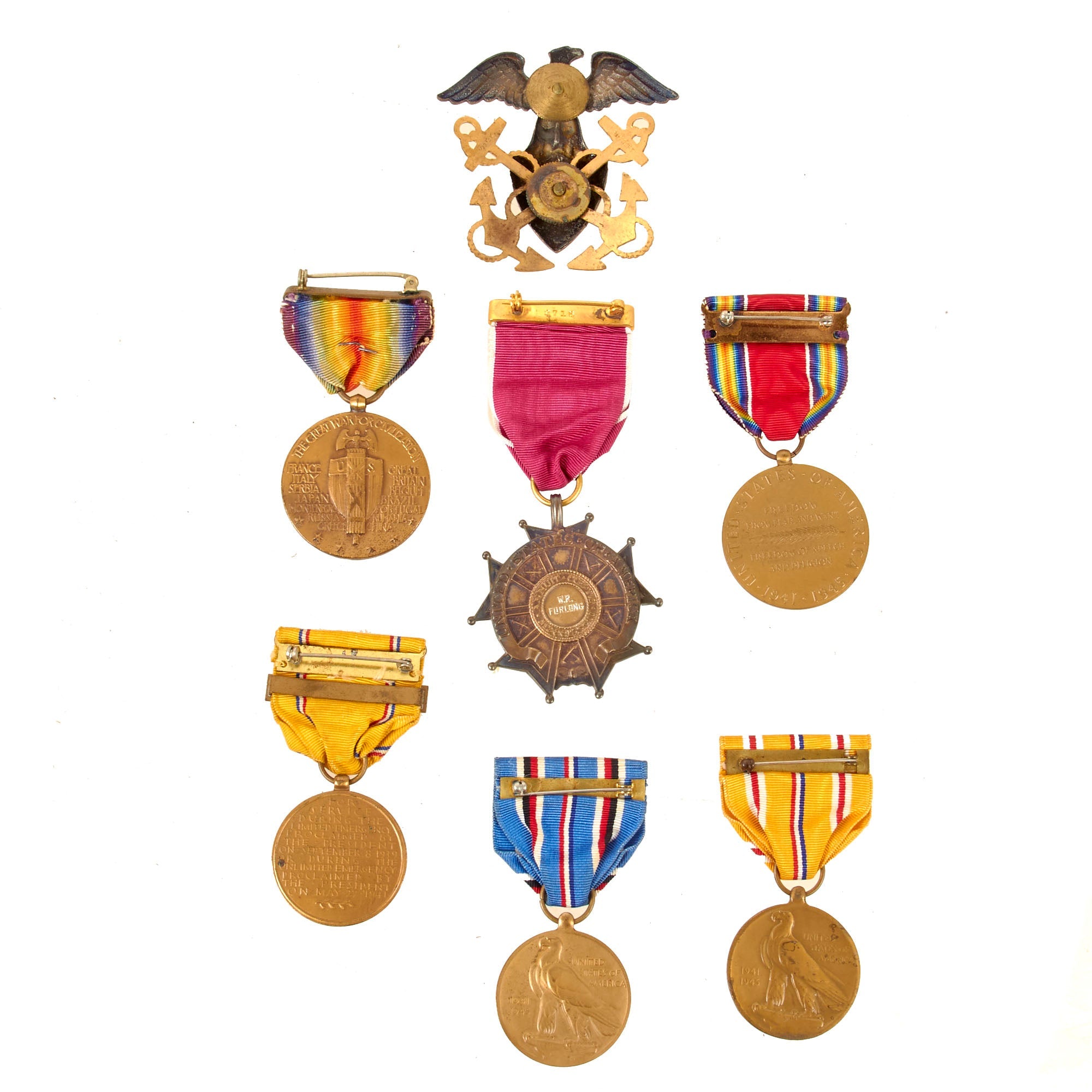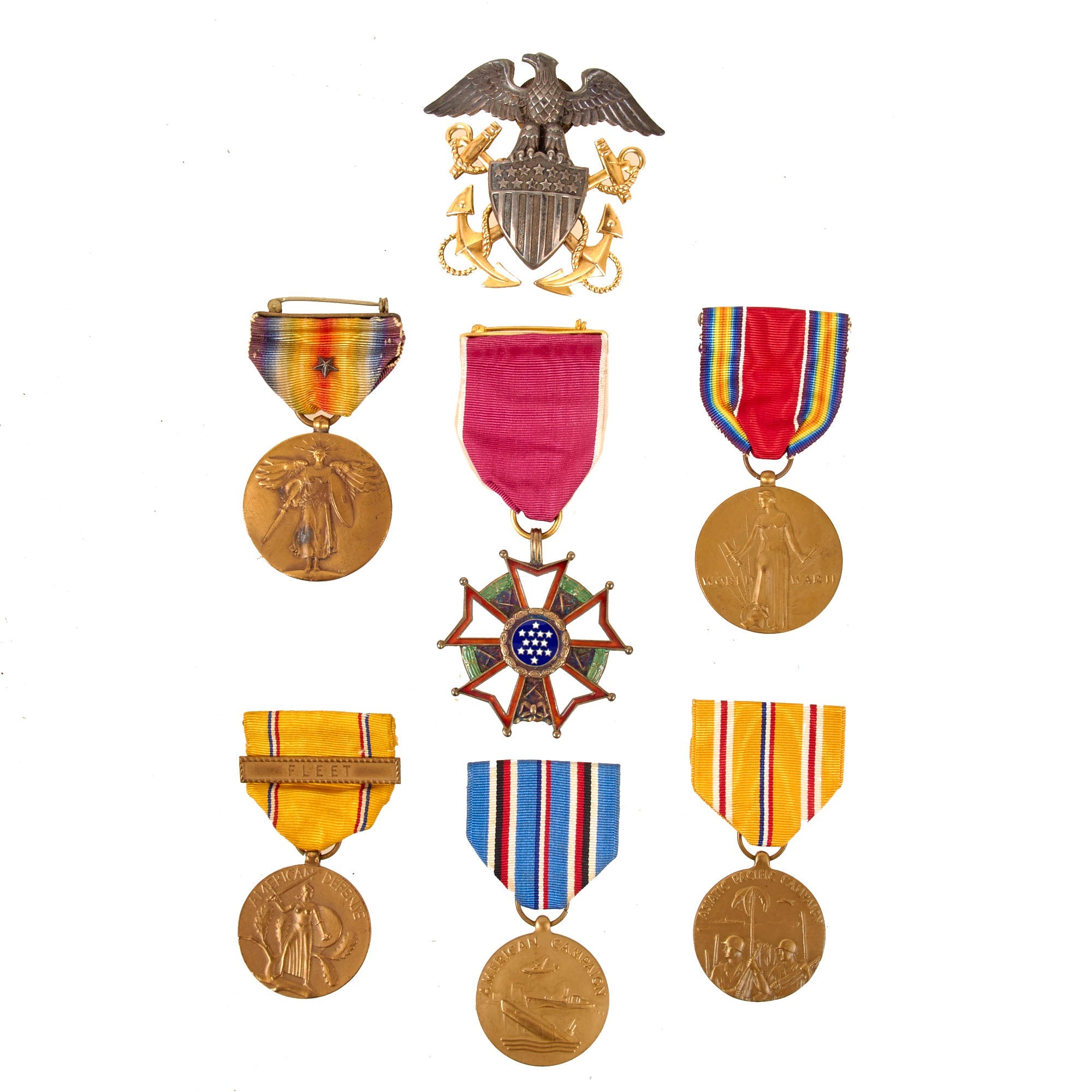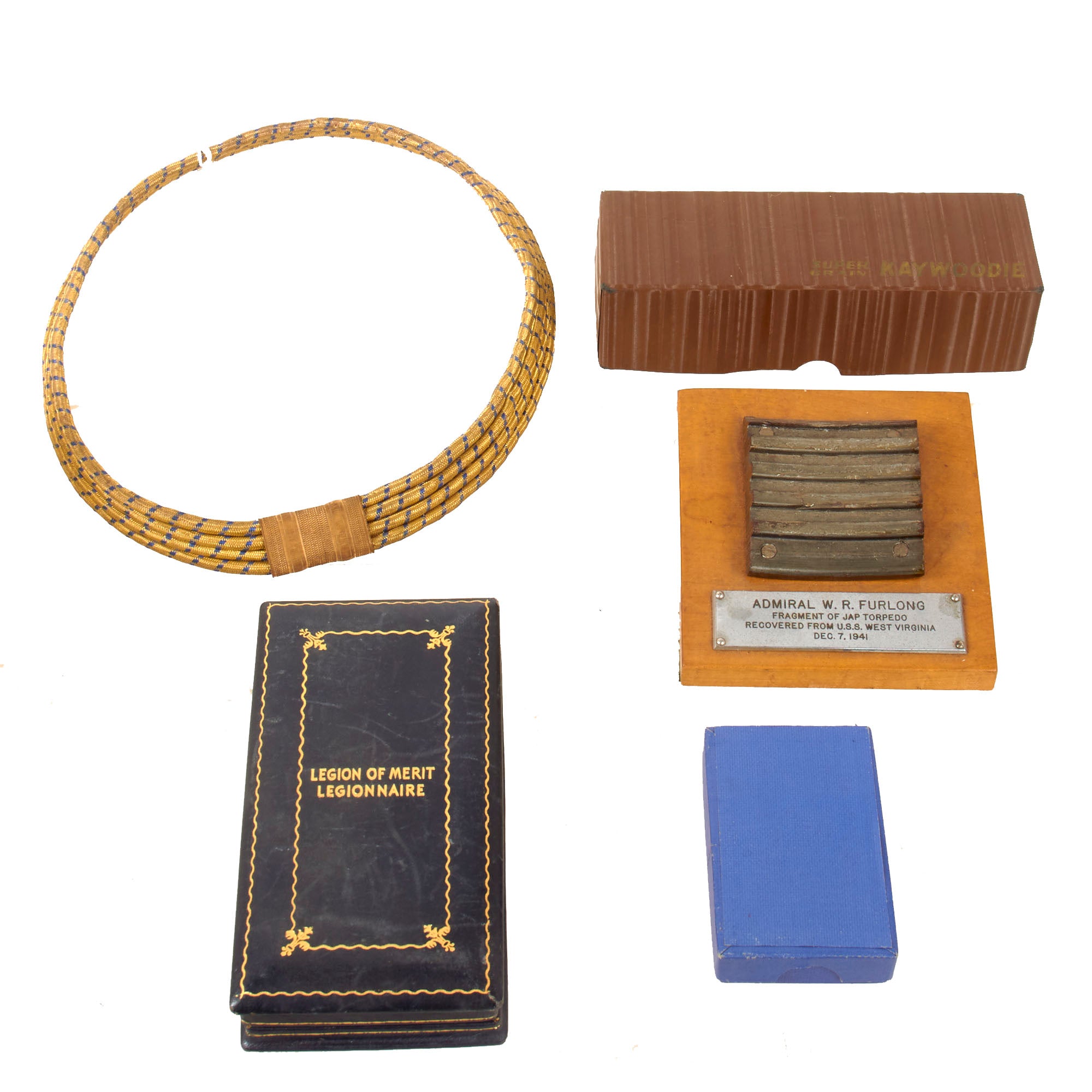 - Admiral Furlong’s medals including his Legion of Merit medal engraved “WM. R. FURLONG”, his US Navy WWI Victory Medal with a Silver Citation star, his WWII victory medal, his American Defense medal with “FLEET” bar, his American Campaign Medal, and his Asiatic Pacific Campaign medal. Also includes his officer’s visor cap badge.