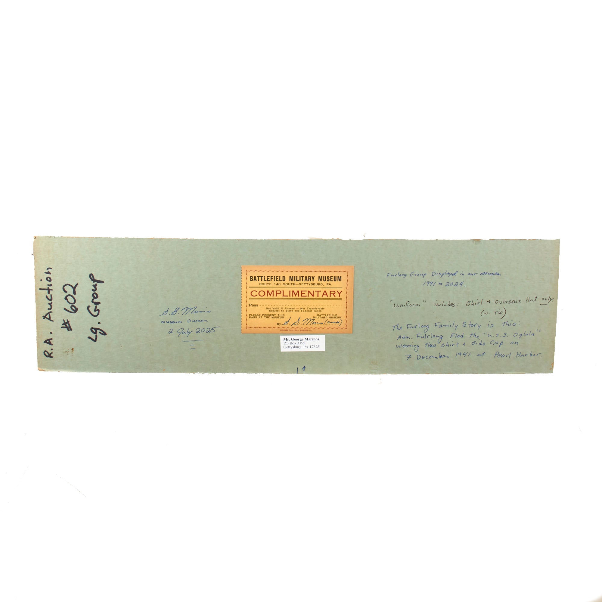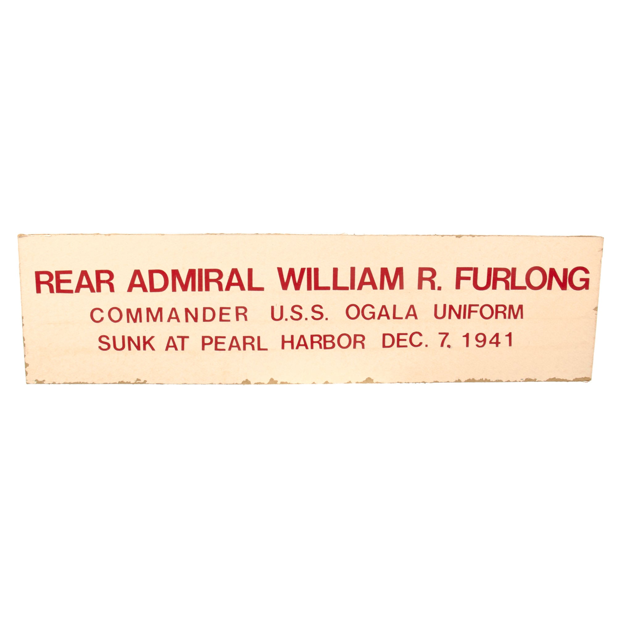 • Original Items. One-of-a-Kind. This is an unprecedented, once-in-a-lifetime offering: the personal grouping of Admiral William Rea Furlong, Commander of Minecraft, Battle Force at Pearl Harbor, Hawaii, from February to December 1941. Furlong was present during the attack on December 7, 1941, serving aboard his flagship, the minelayer USS Oglala, when it was strafed and torpedoed, ultimately capsizing at the pier. In the chaos of the surprise assault, Furlong directed anti-aircraft fire from the deck as the ship was sinking beneath him—one of the most dramatic first-person command experiences of the event.
