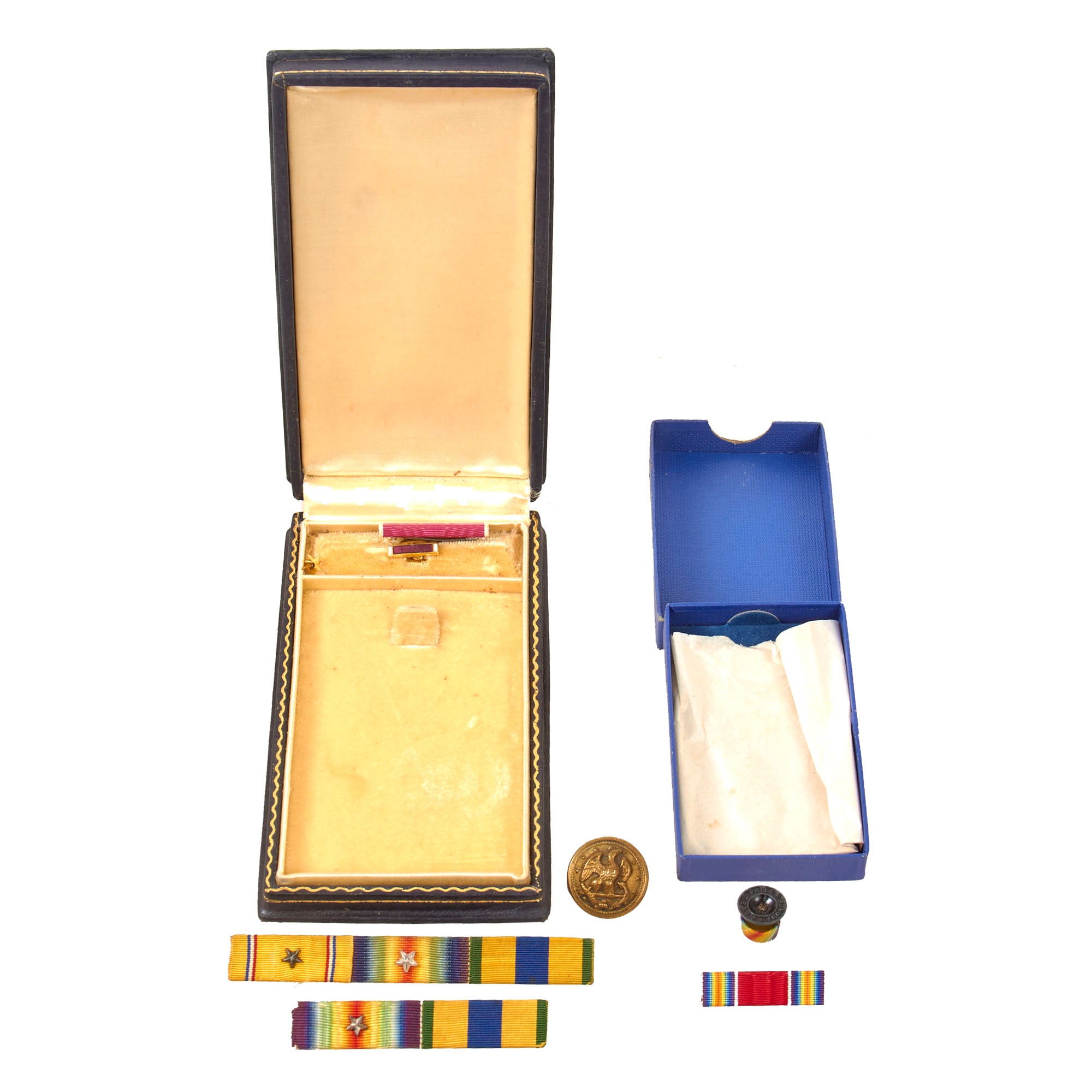 - Furlong’s WWII victory medal box with ribbon and rare rosette by BB&B.