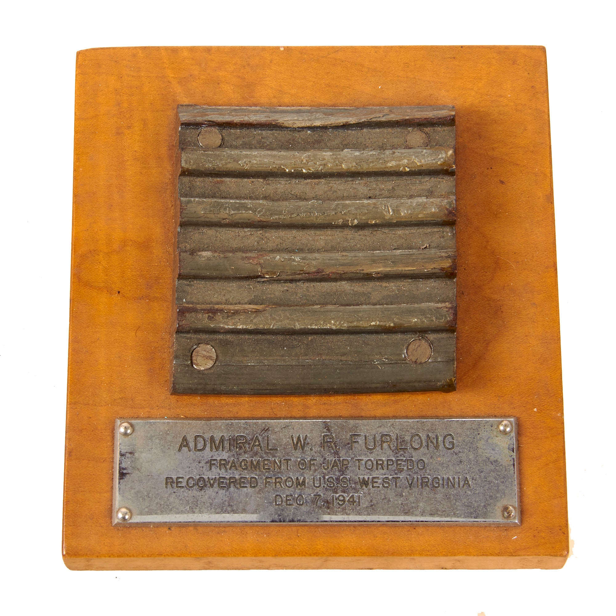 - Fragment of Japanese Torpedo recovered from the USS West Virginia on December 7th, 1941, presented to Admiral W.R. Furlong, on base measuring 4 ½ x 4 ⅞ x 1 ¼”.