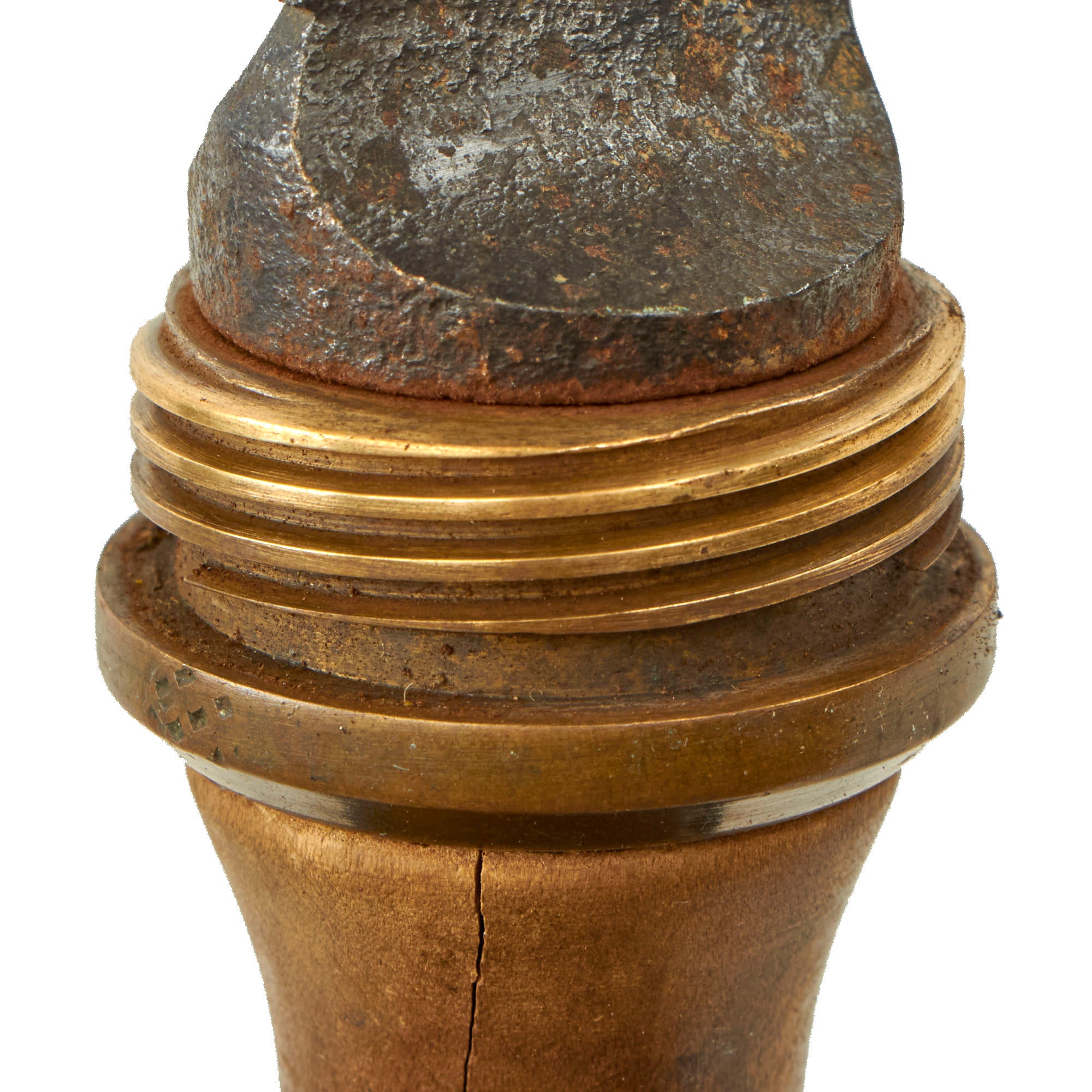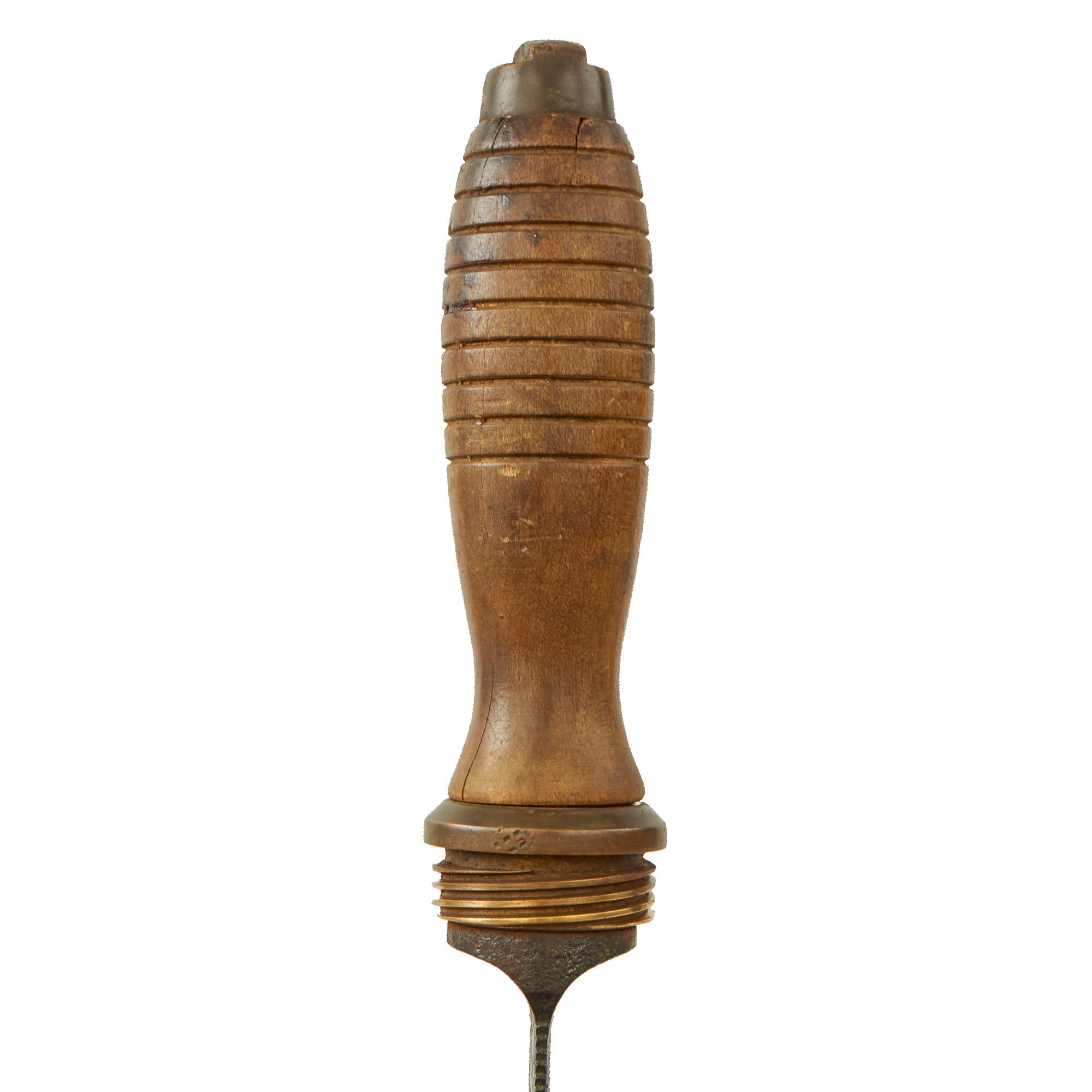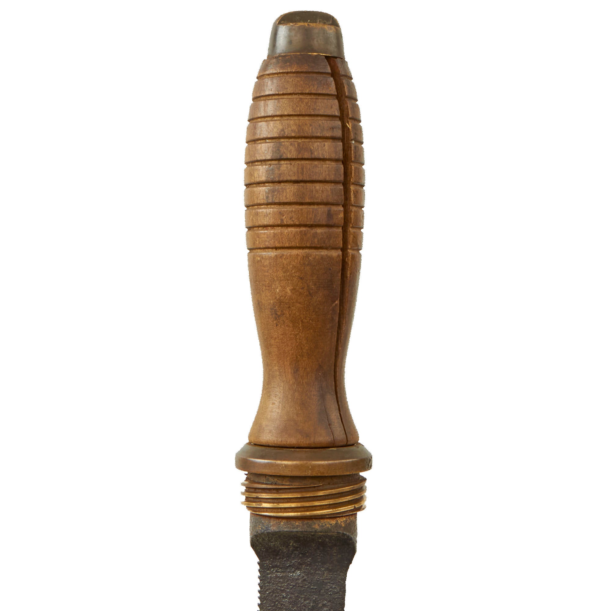Offered in rough service-used condition, this rare WWII example has the standard 6 1/2" blade with saw teeth on one edge. The blade has extremely heavy oxidation. The grip is turned hardwood and the hilt has a brass pommel. The wooden grip has a very heavy crack in one side and is loose as a result. The knife screws into a heavy brass cylindrical scabbard, which is maker marked: