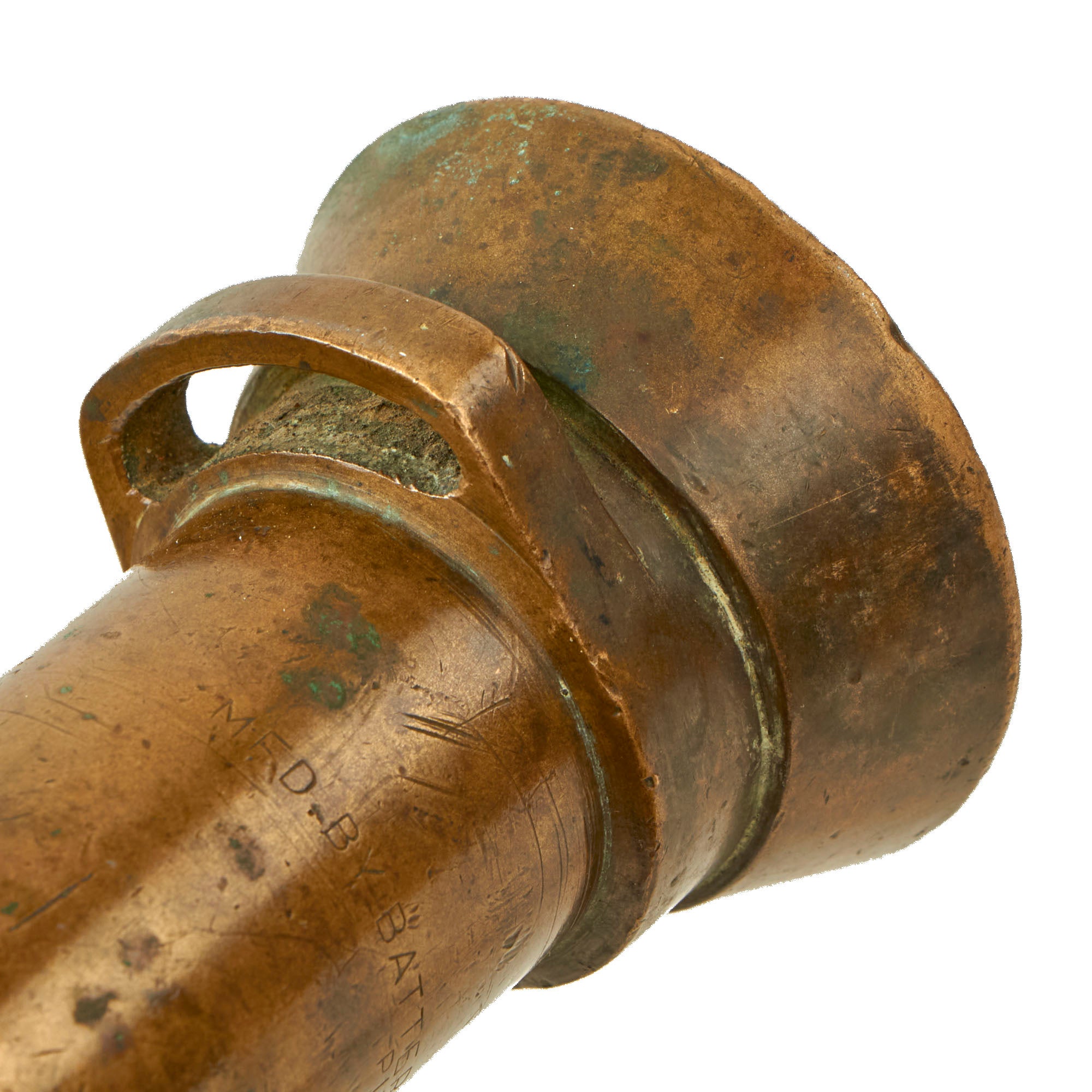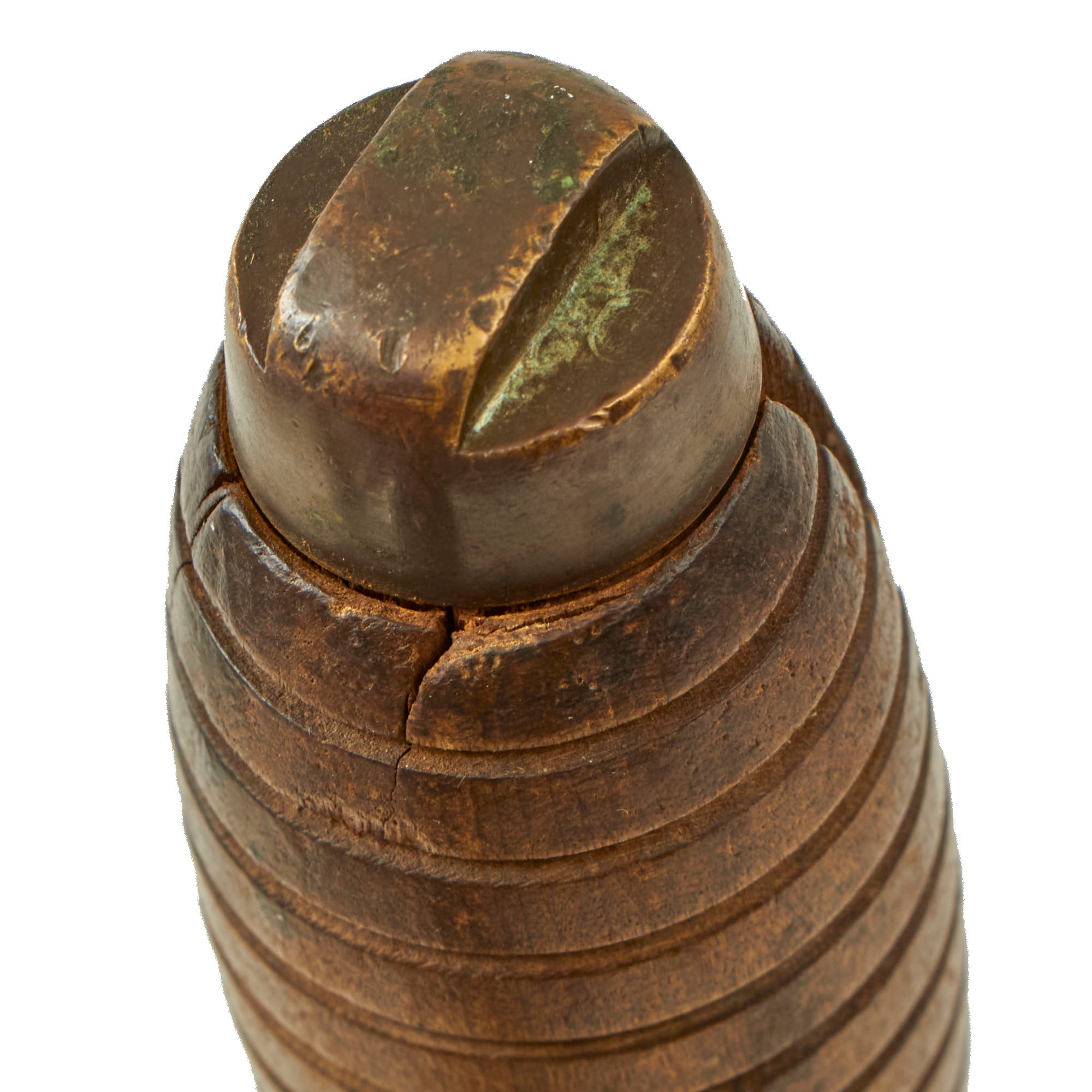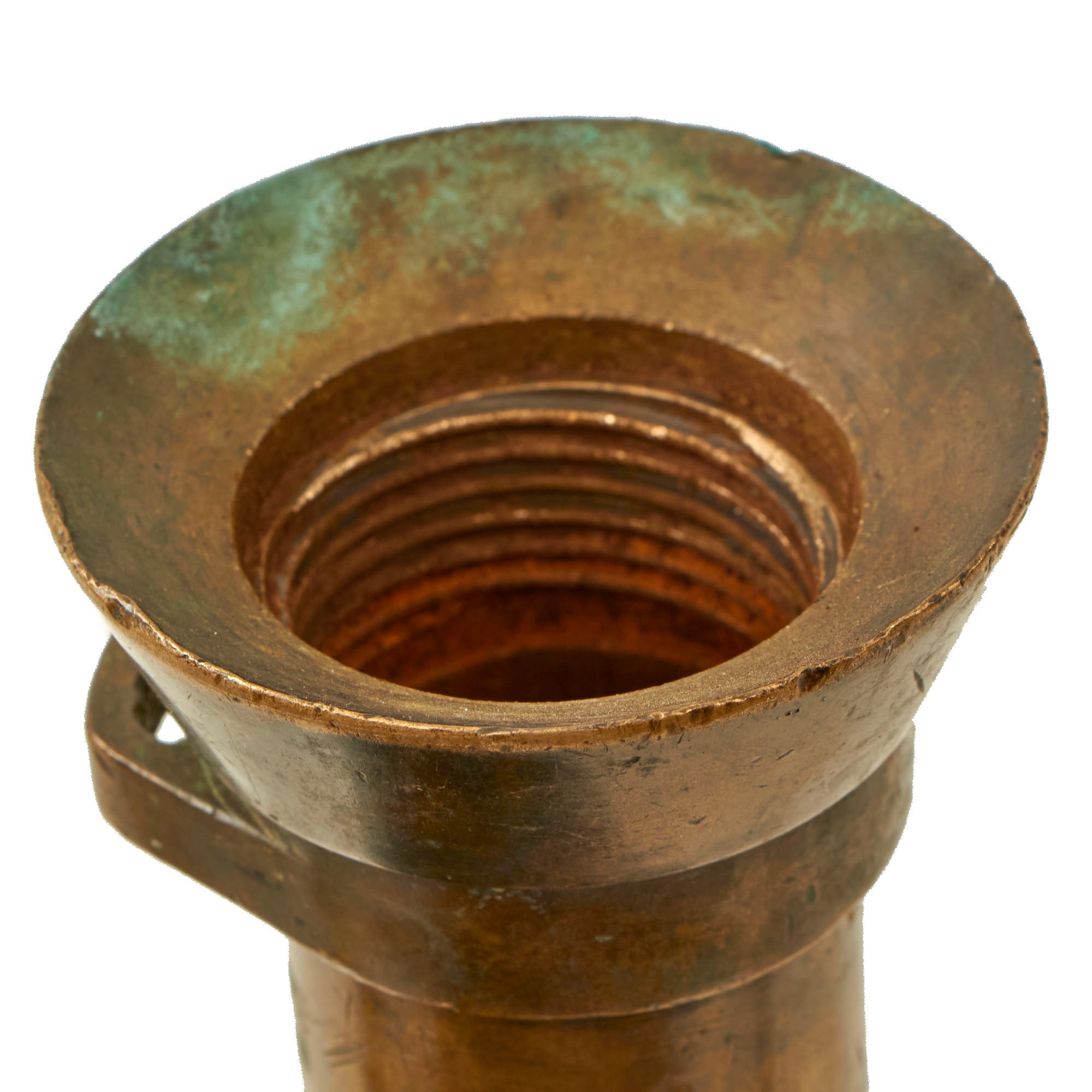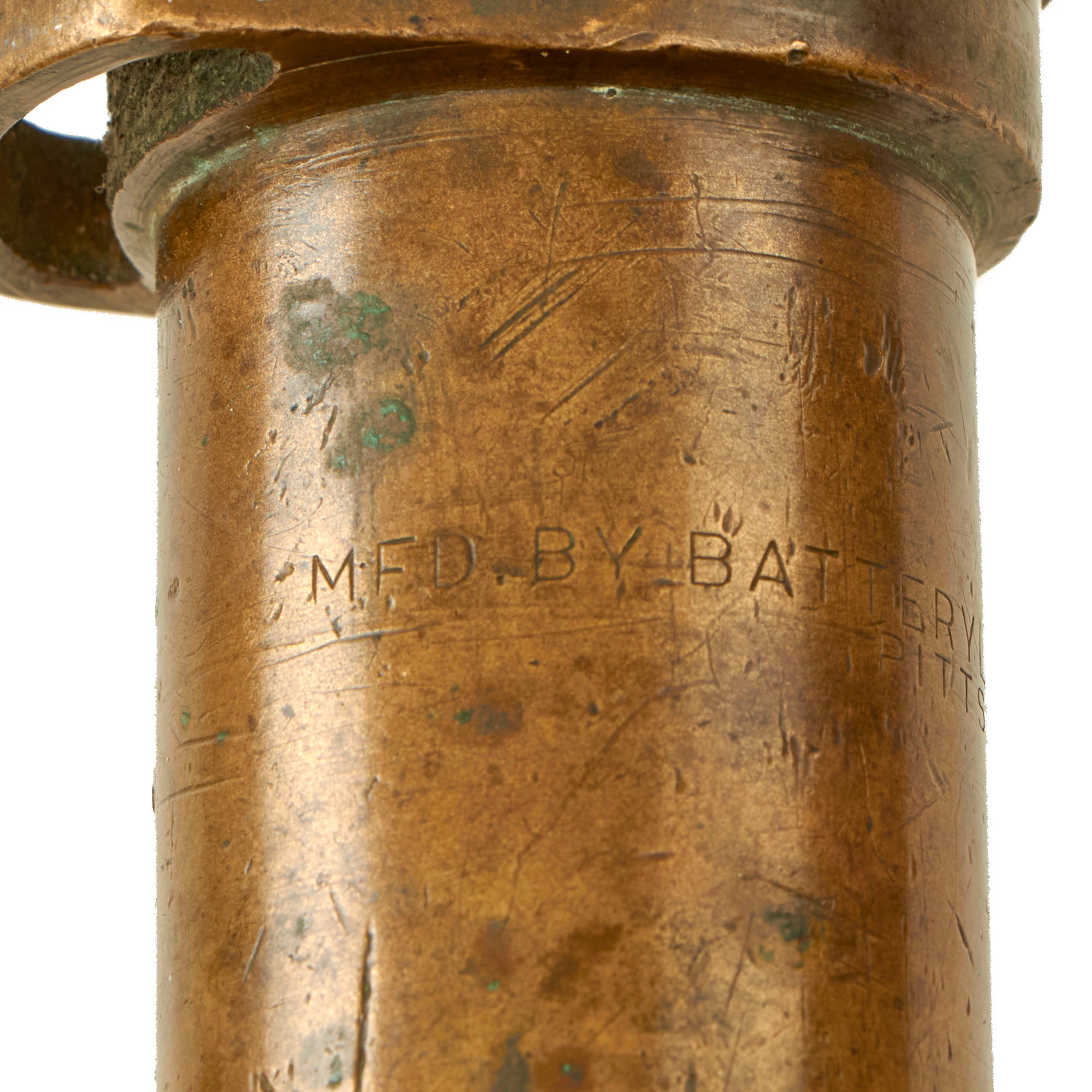 Offered in rough service-used condition, this rare WWII example has the standard 6 1/2" blade with saw teeth on one edge. The blade has extremely heavy oxidation. The grip is turned hardwood and the hilt has a brass pommel. The wooden grip has a very heavy crack in one side and is loose as a result. The knife screws into a heavy brass cylindrical scabbard, which is maker marked: