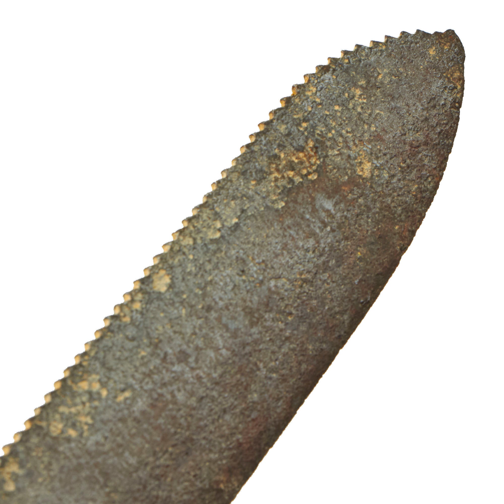 This example was acquired from a collector, and shows signs of faithful wartime use. There is extreme wear to the blade in the form of heavy oxidation from water, which is likely what caused the grip to crack. A great used example, ready to display!