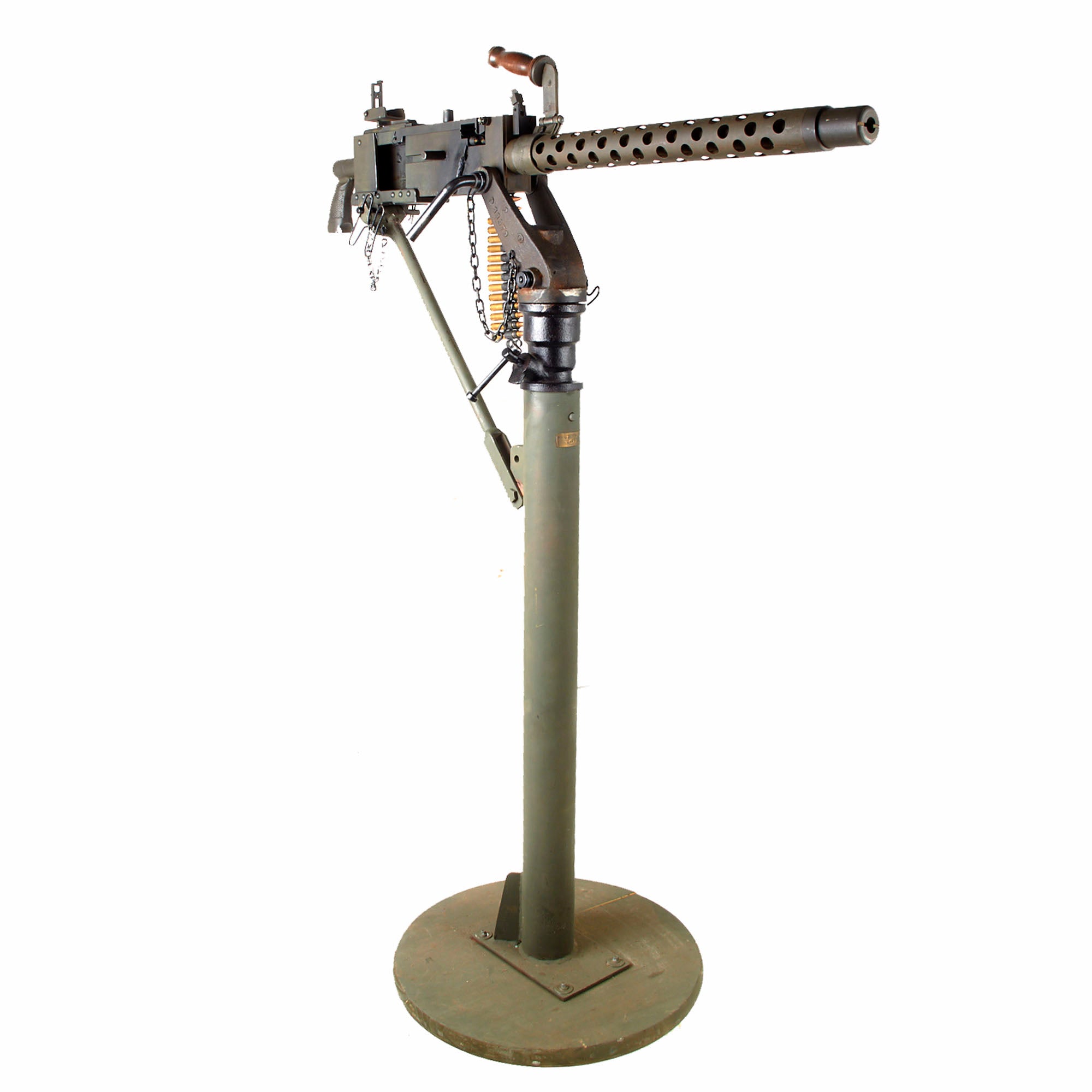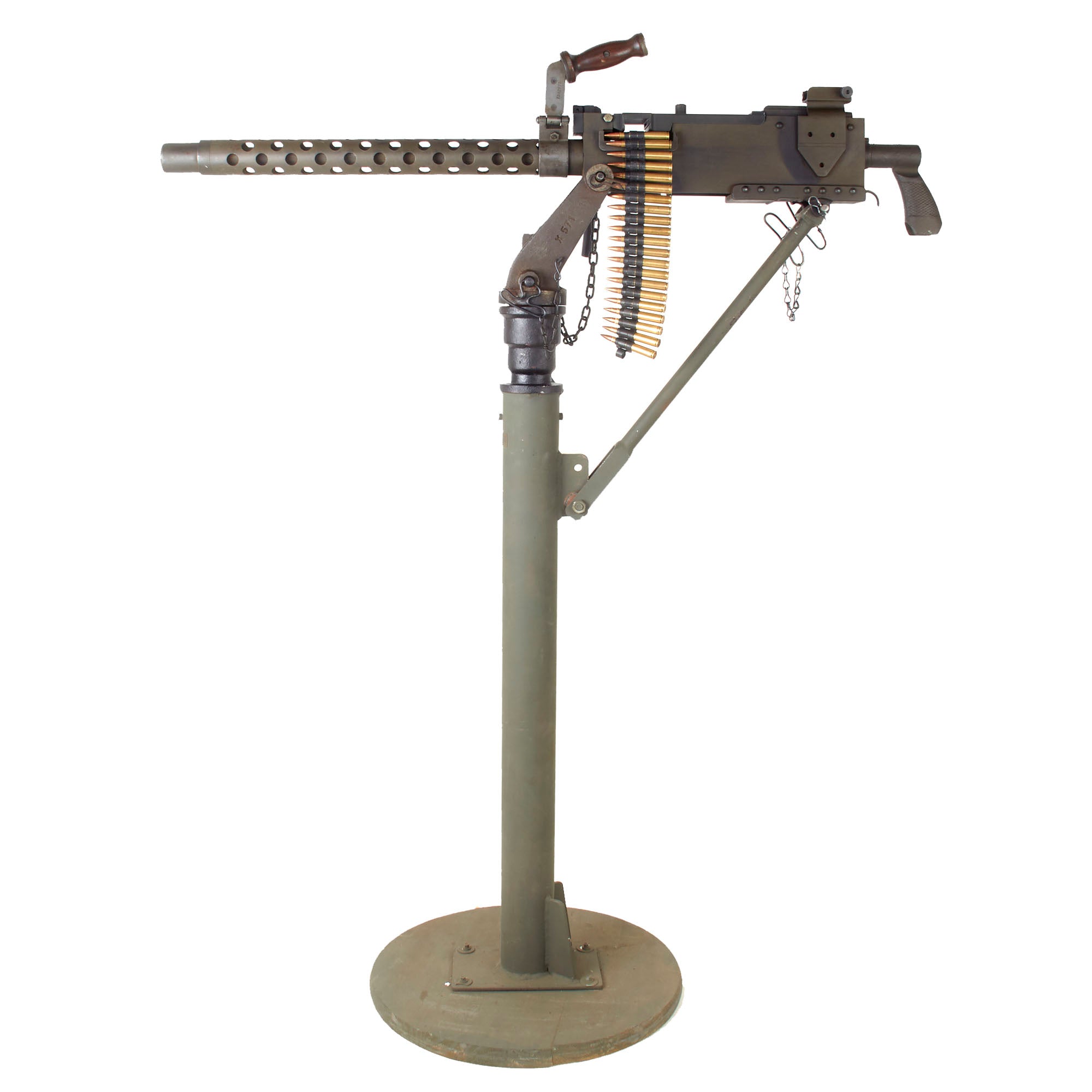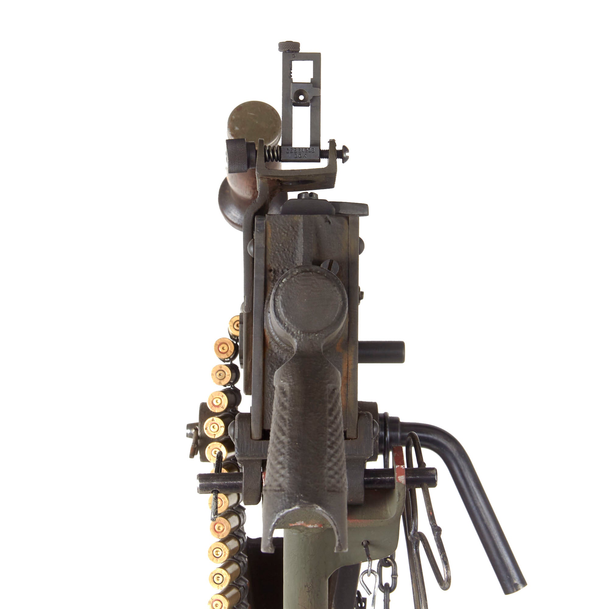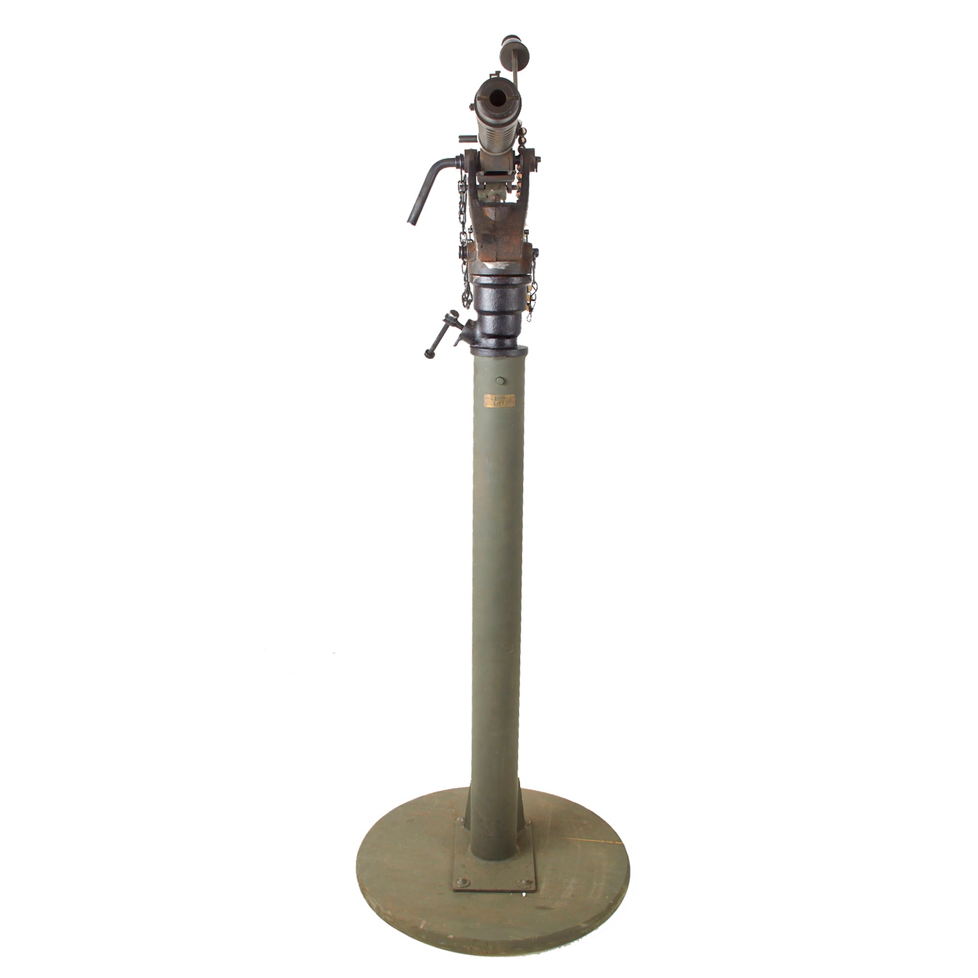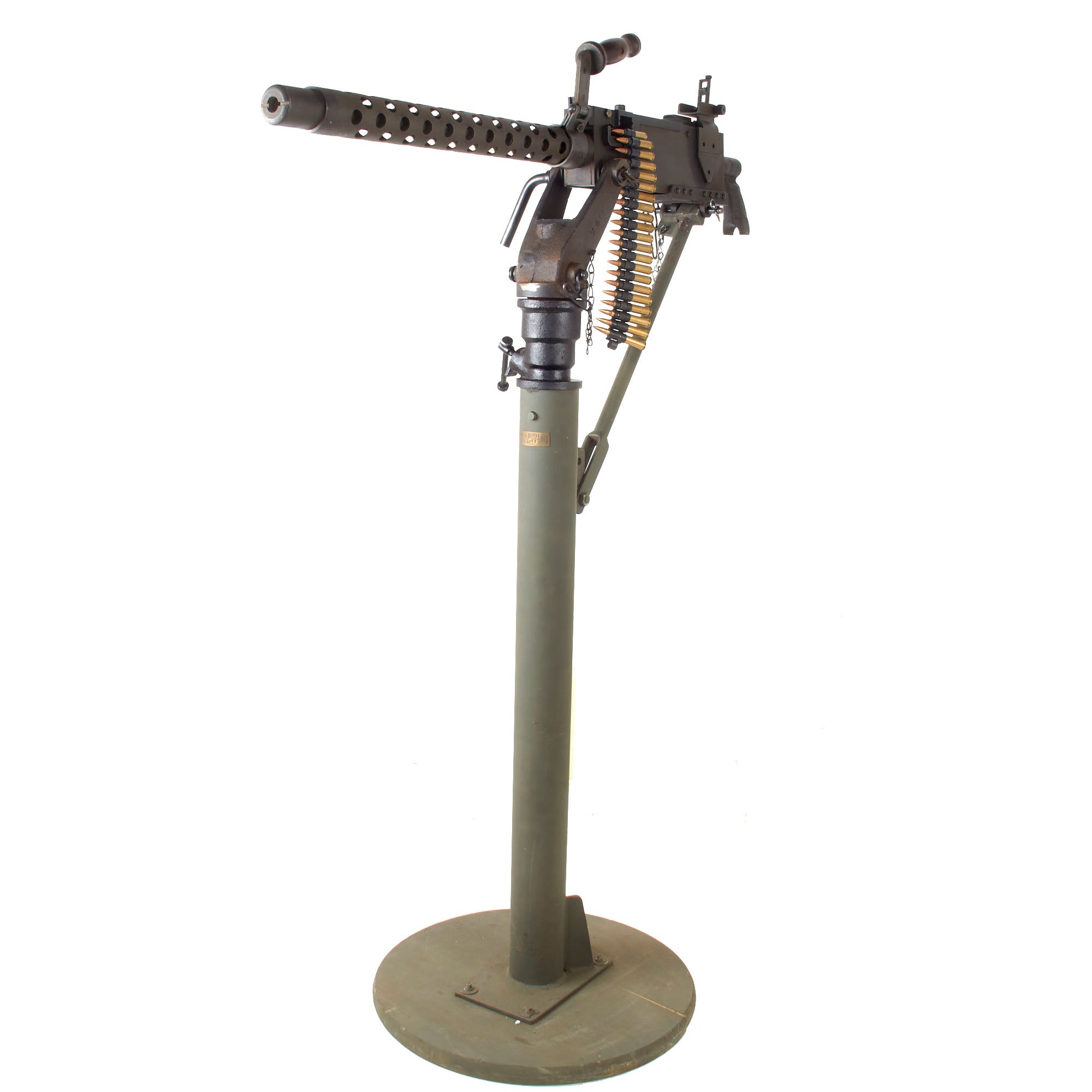 IMA is proud to offer a totally non-firing display machine gun, built using some original parts into a BATF compliant non-firing dummy gun. The top cover opens, and many original markings remain on the individual components, this is a very appealing display gun. Both the front and rear sight are fully functional, and condition overall is excellent, showing very little wear or damage from service. The display gun has an original carry handle fitted around the barrel jacket, and is fitted on a lovely custom made M25 vehicle pedestal mount, which is attached to a round wooden base. It shows a high level of fabrication, utilizing most likely an aftermarket pedestal socket and forkhead.
