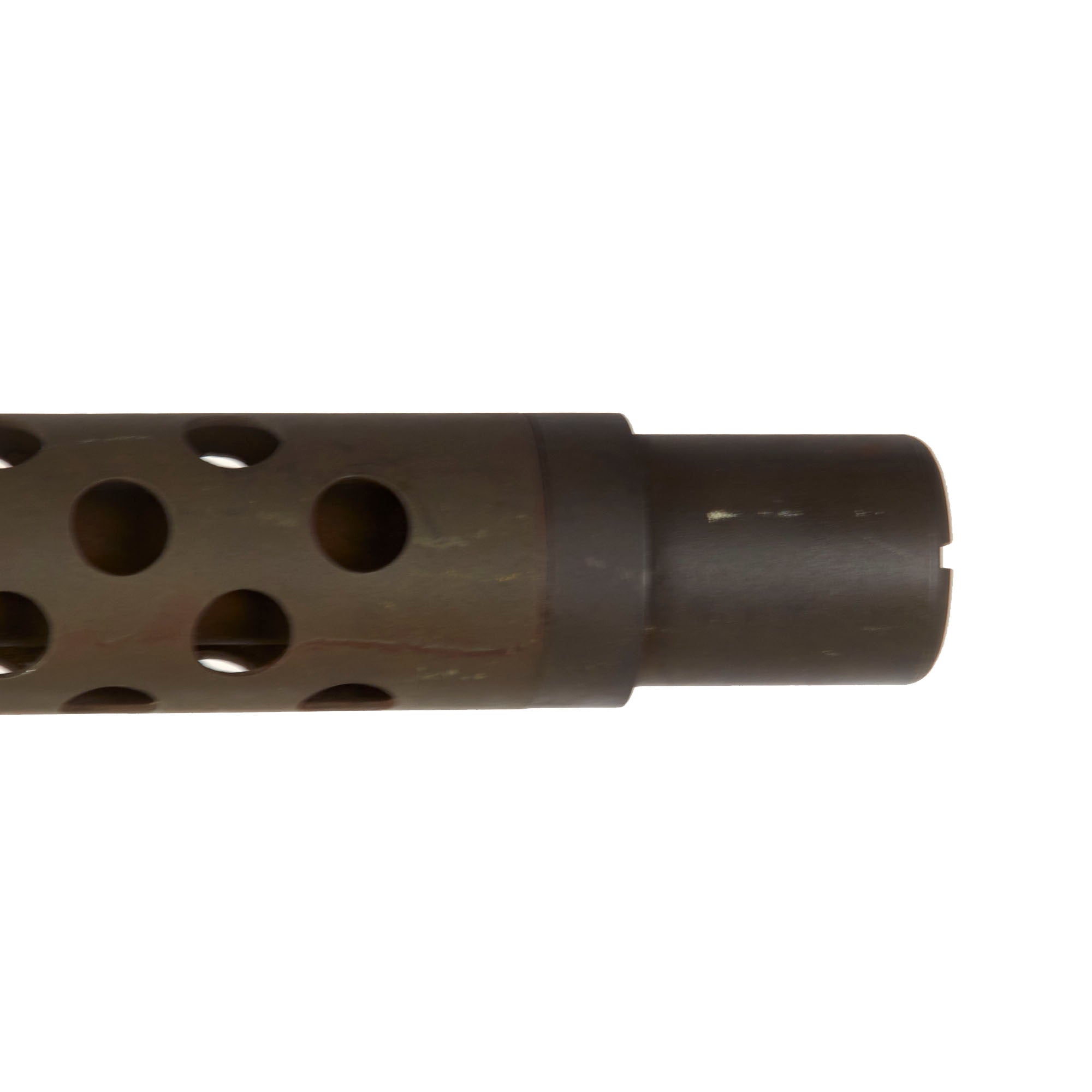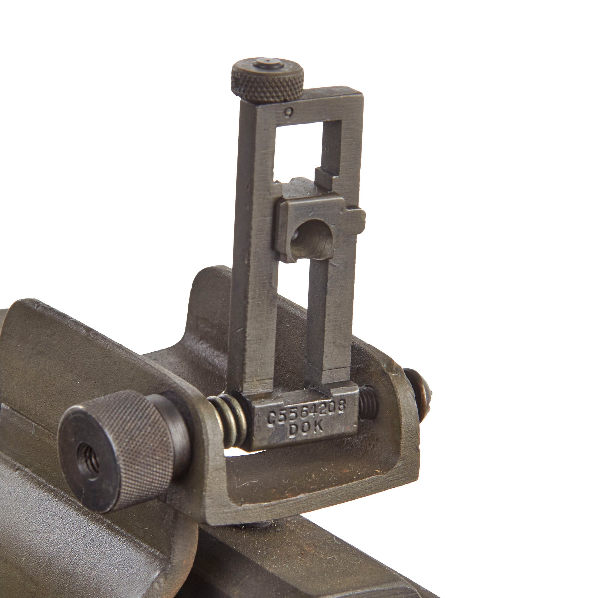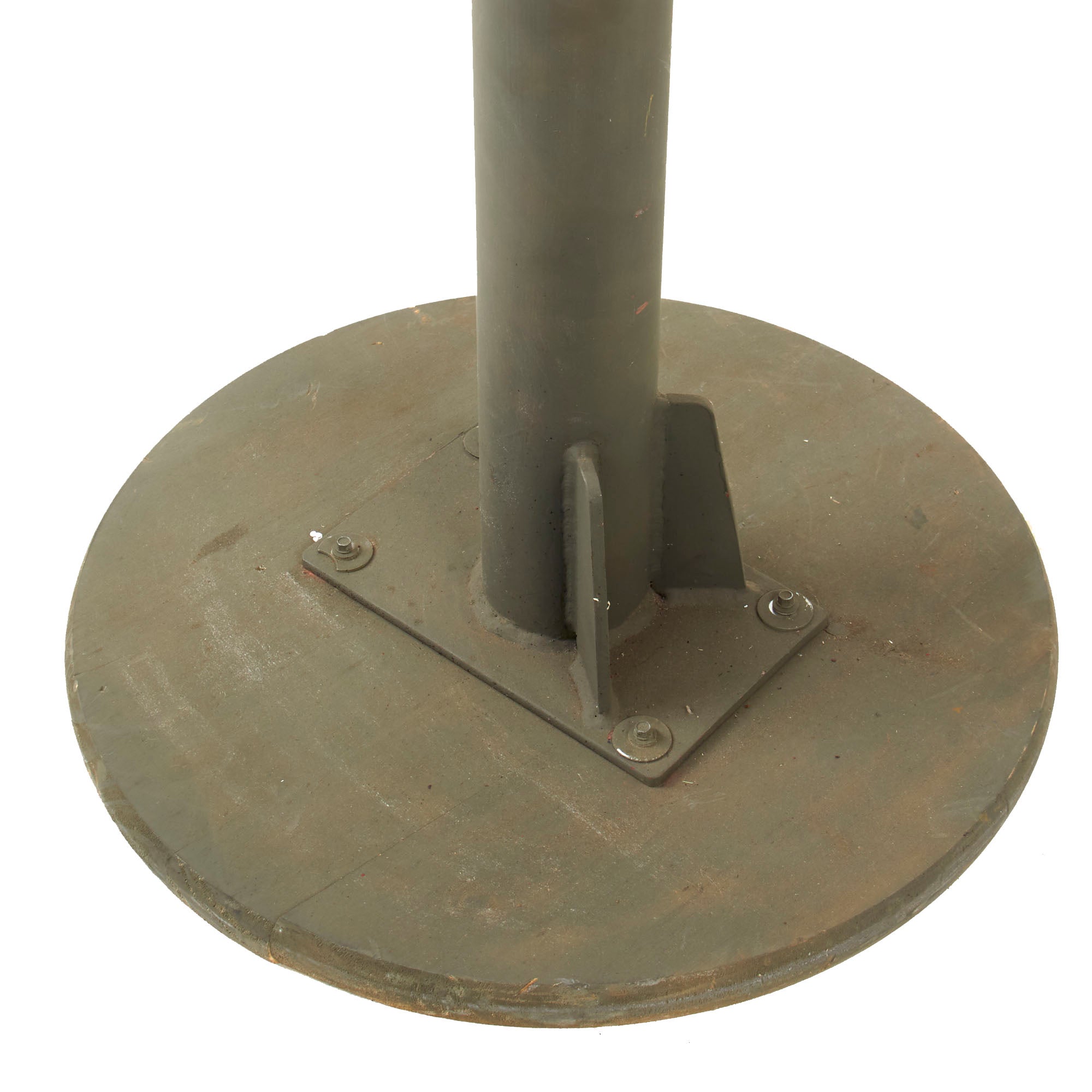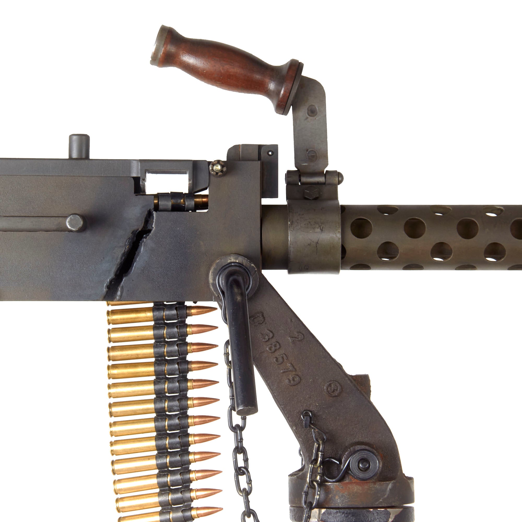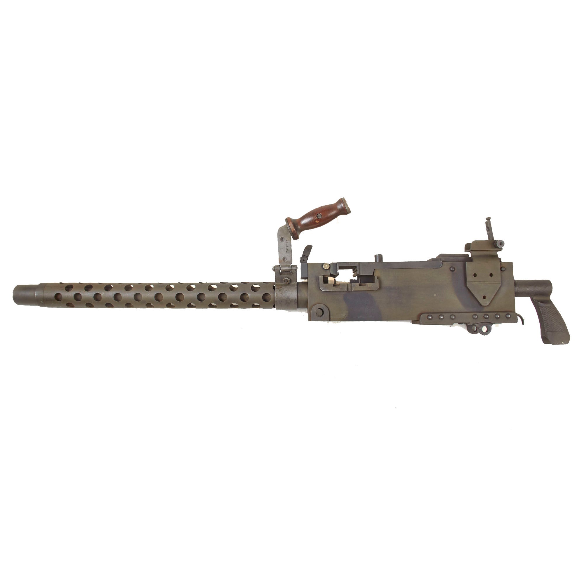 IMA is proud to offer a totally non-firing display machine gun, built using some original parts into a BATF compliant non-firing dummy gun. The top cover opens, and many original markings remain on the individual components, this is a very appealing display gun. Both the front and rear sight are fully functional, and condition overall is excellent, showing very little wear or damage from service. The display gun has an original carry handle fitted around the barrel jacket, and is fitted on a lovely custom made M25 vehicle pedestal mount, which is attached to a round wooden base. It shows a high level of fabrication, utilizing most likely an aftermarket pedestal socket and forkhead.