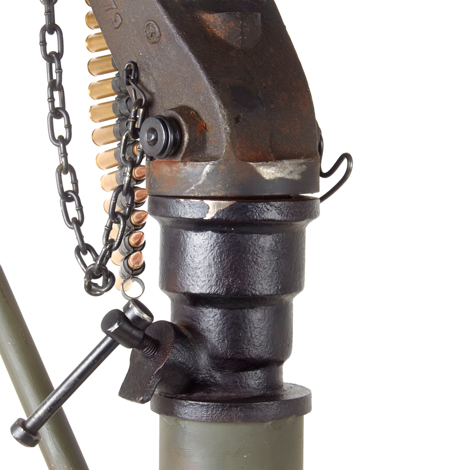 Original Item: Only One Available. This is a wonderful original M1919A4 display gun vehicle setup, complete with a custom made M25 Vehicle Mount with Support Bar, Carry Handle, and a short belt of inert ammo. It was built using original WWII Type issue parts on a BATF compliant non-firing display receiver, making this a 100% legal display machine gun. This receiver was created using an original barrel trunion, rear plate, floor plate, and top covers, combined with sheet steel inert side plates. The interior has a faux bolt and charging handle, but no other real components. The barrel jacket is original, however the "barrel" inside is a hollow steel tube. The right hand dummy side plate was cut and part removed prior to obtaining this to ensure that it is fully inert. As such it is totally legal to own without a license of any kind.