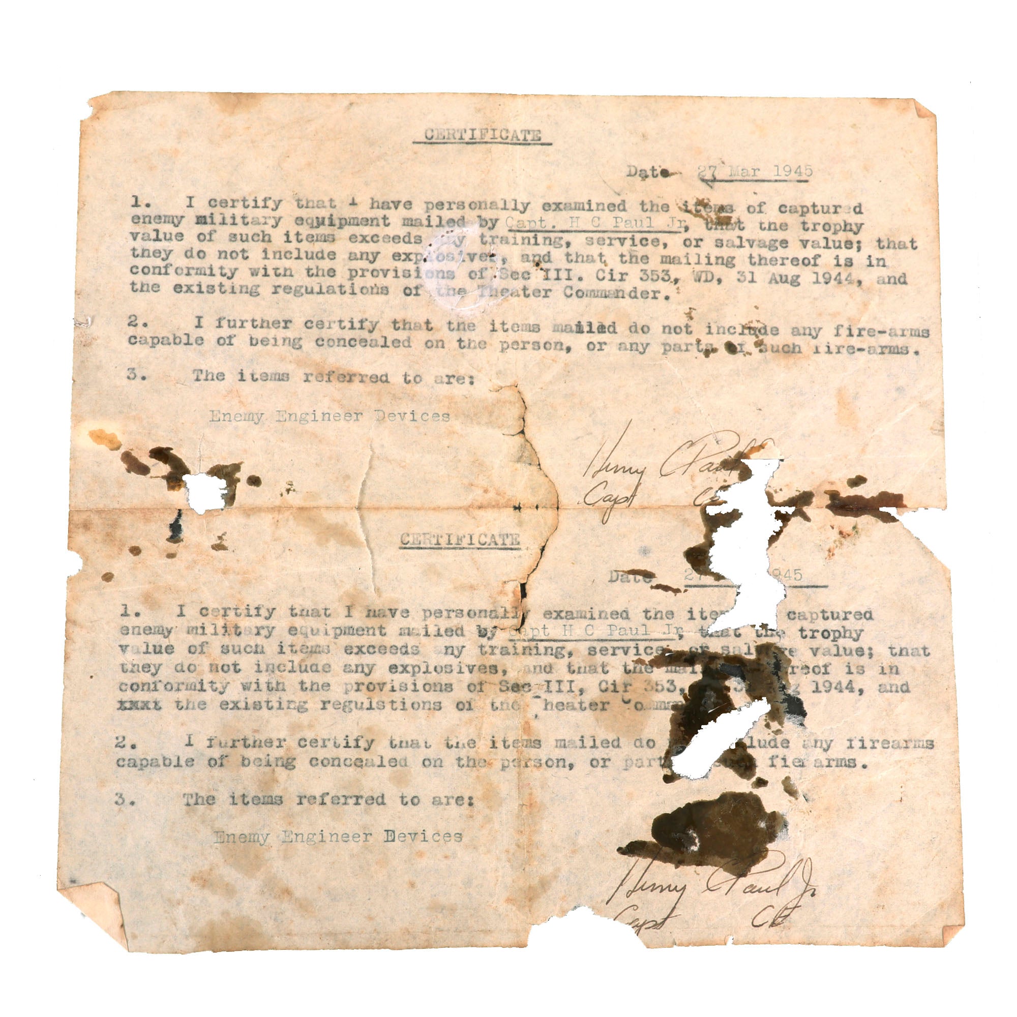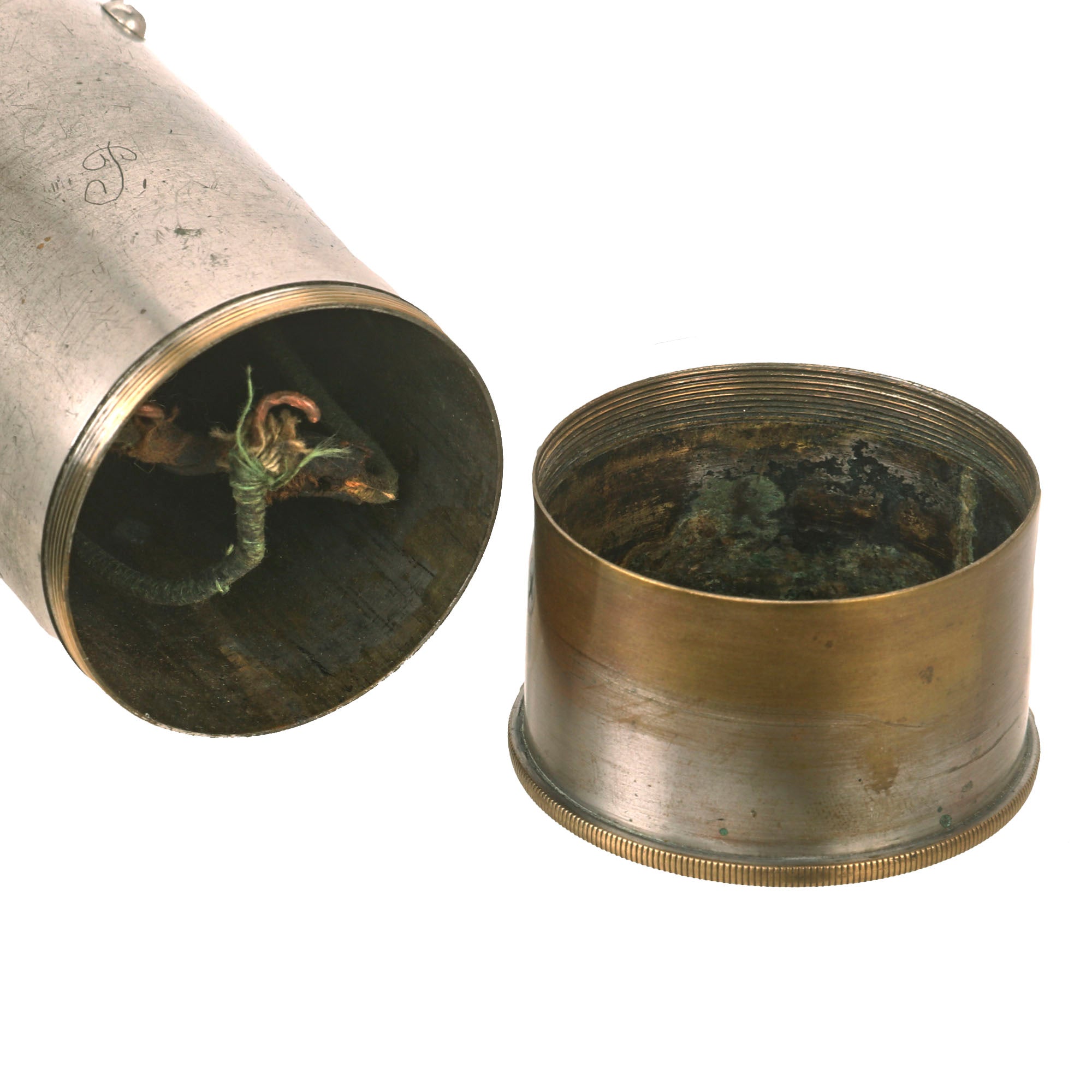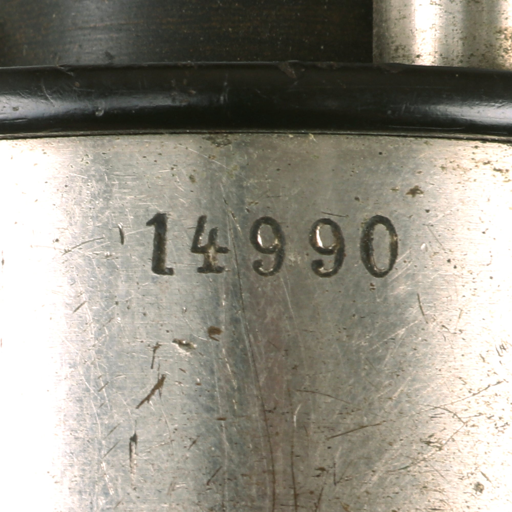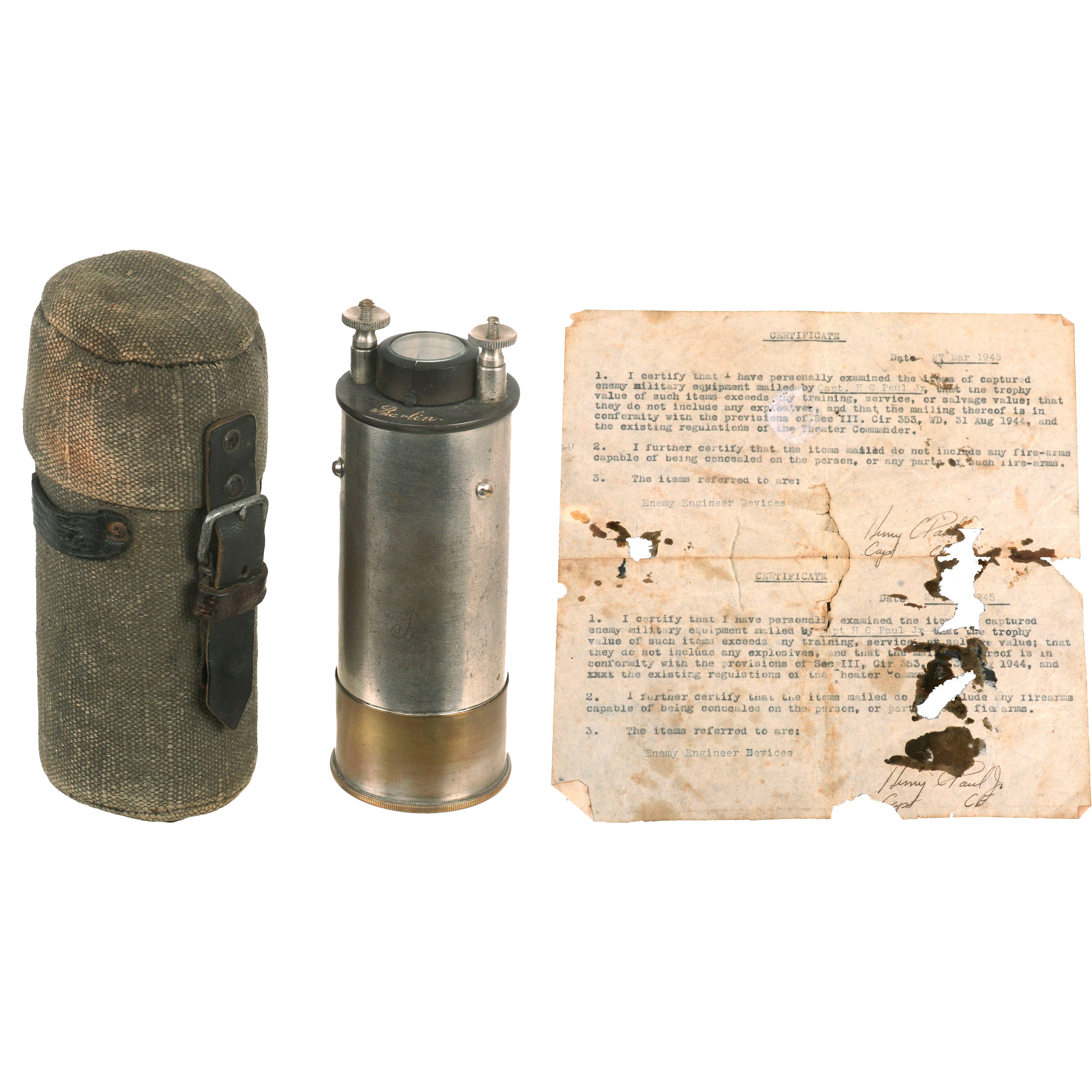 The certificate states that on March 27th, 1945, Captain Henry C. Paul Jr. examined the items he brought back, including “Enemy Engineer Devices”. The device is marked 14990 on the side, and PBT4 on the bottom. The original case is in great shape and retains its original leather securing strap. The device measures roughly 5½” with a 2” base diameter.