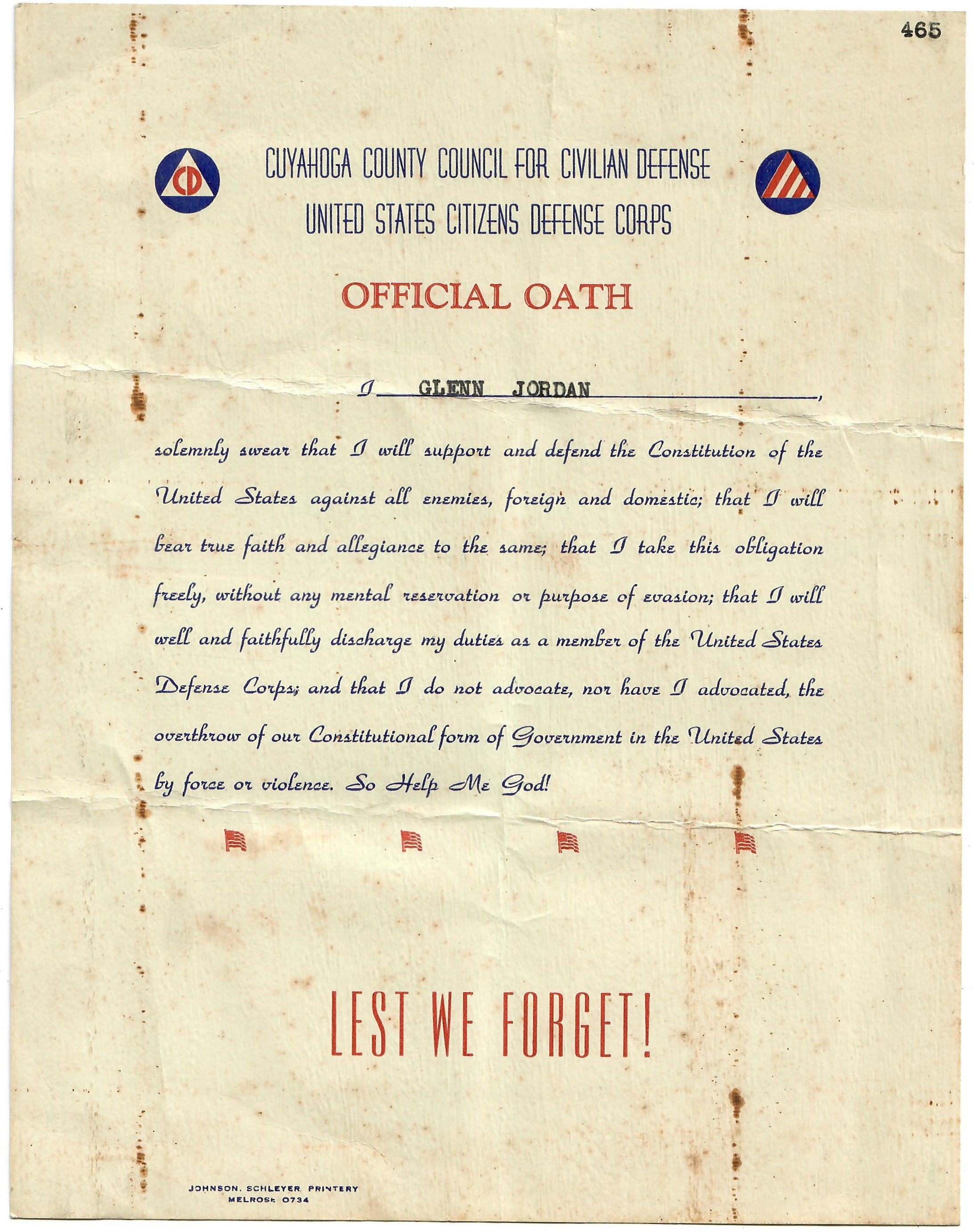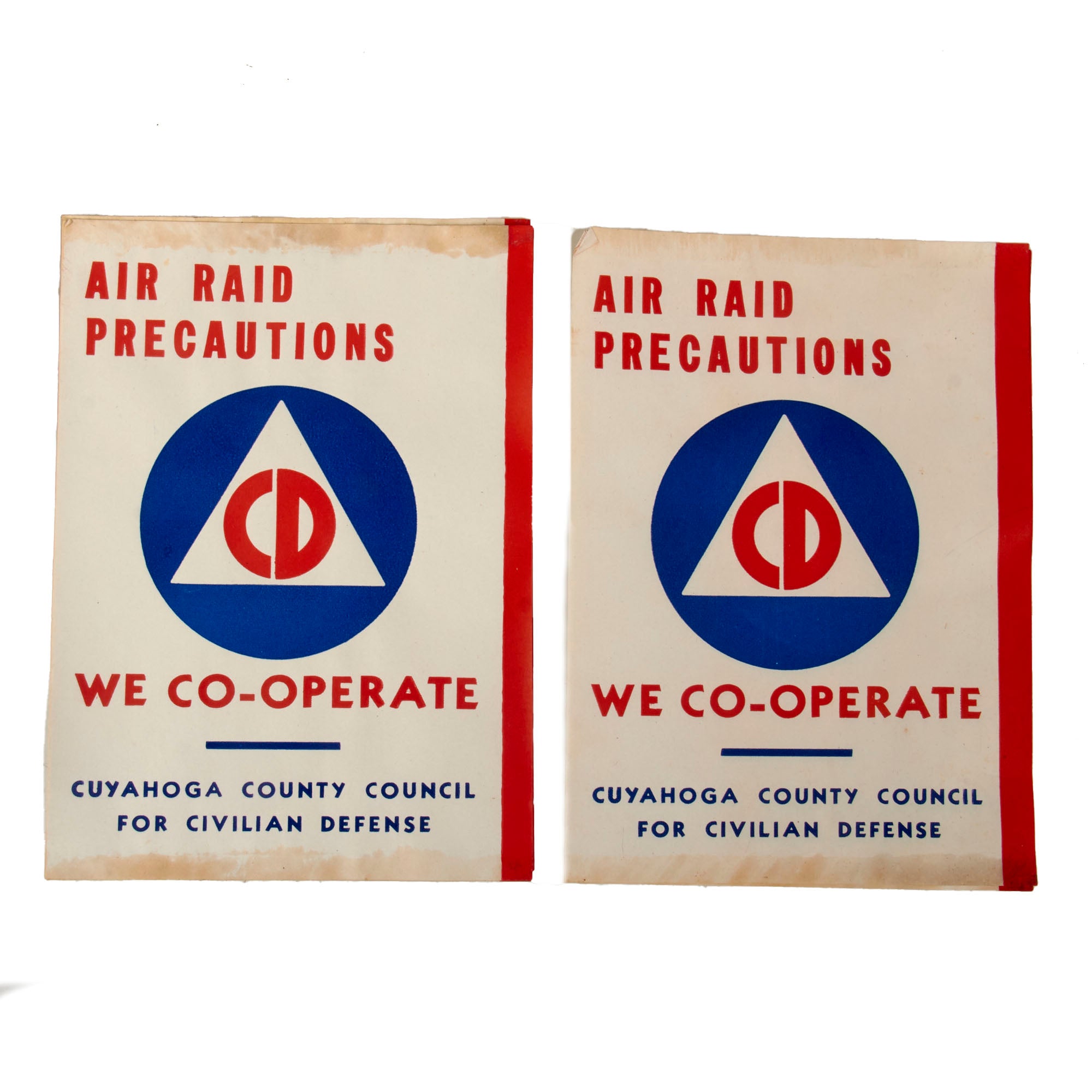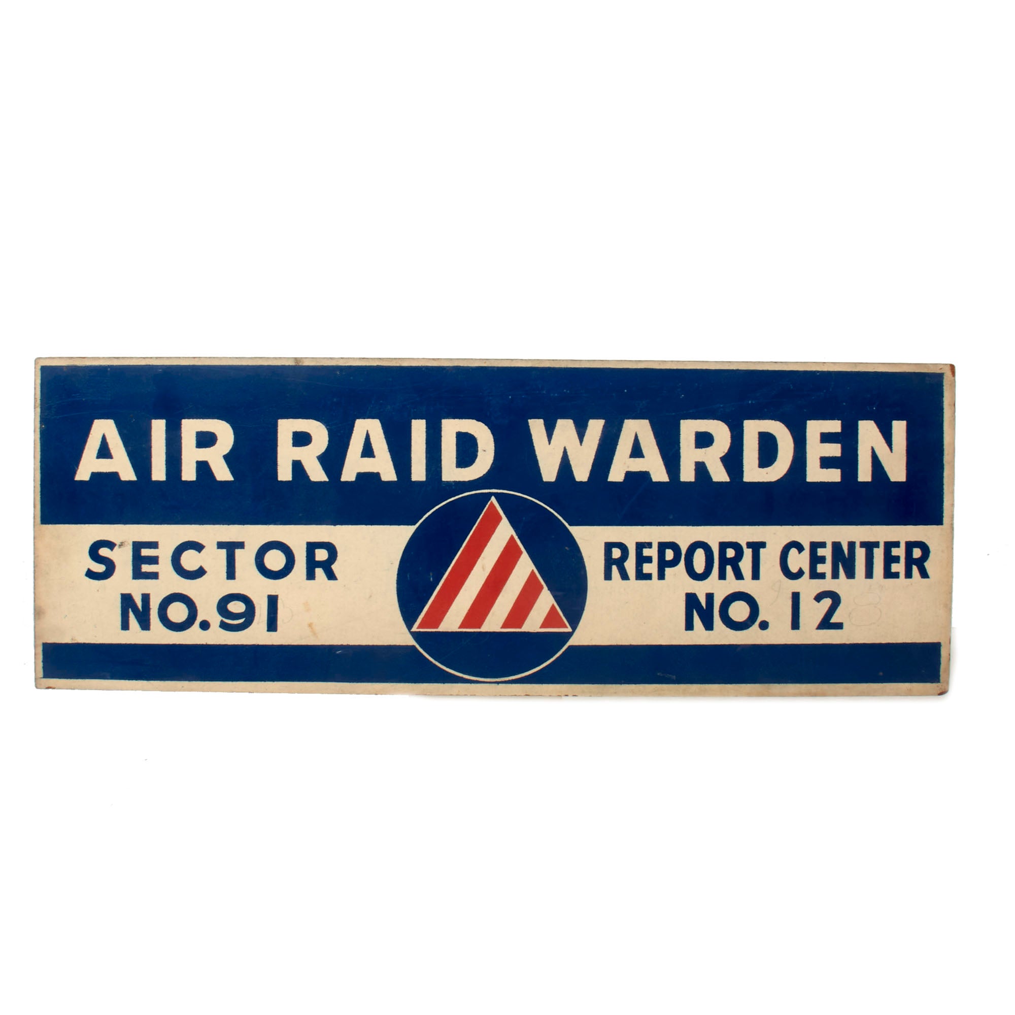 Original Items. One-of-a-Kind Group. This is an outstanding set including a 9 x 24” Air Raid Warden Report Office sign and the briefcase of Air Raid Warden Glenn Jordan of Cuyahoga County, Ohio, with all his original paperwork, certificates, armbands, and more.