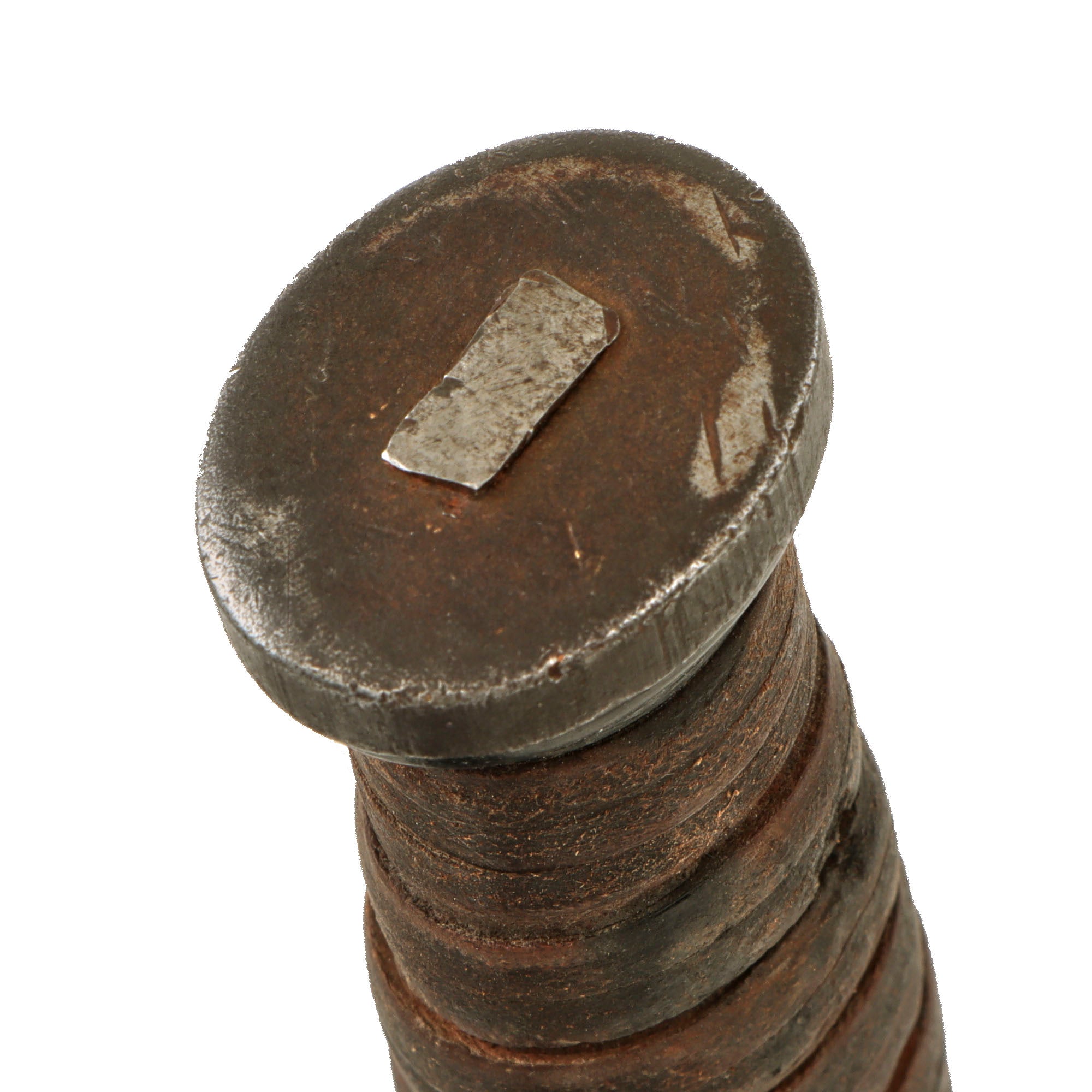 • Original Item. Only One Available. This is an interesting M3 fighting knife which is void of any markings and has black bakelite spacers at each end of the stacked leather grip. There is no flaming bomb proof mark. It comes in a private purchase M6 scabbard which is missing the belt hook and is also void of markings, however its construction suggests that it could be a Barwood-produced example.