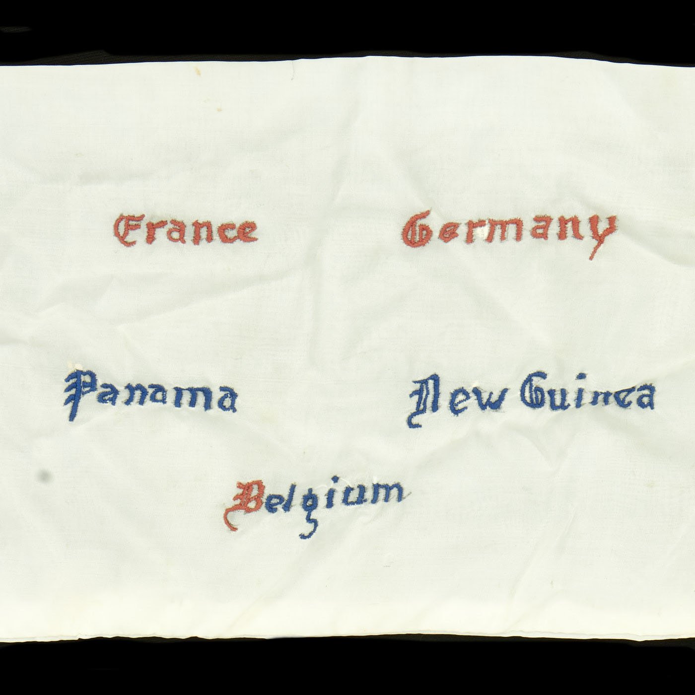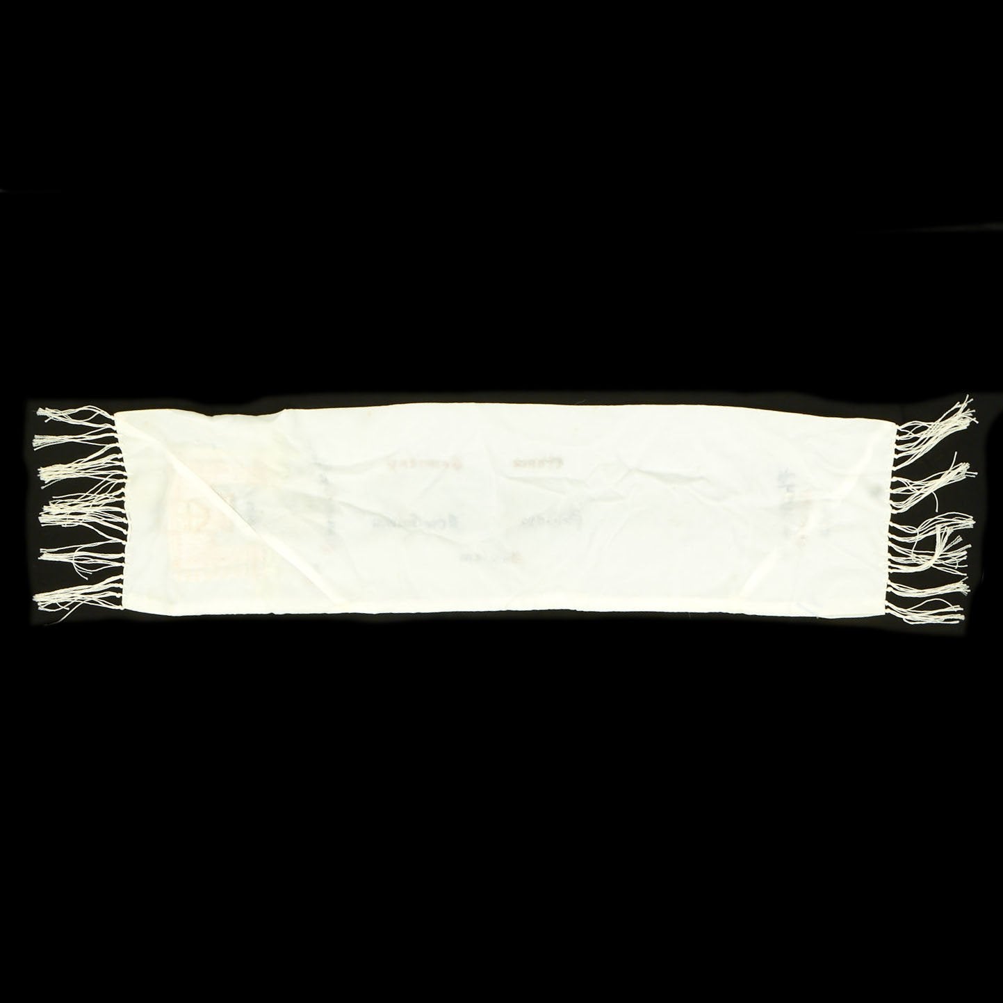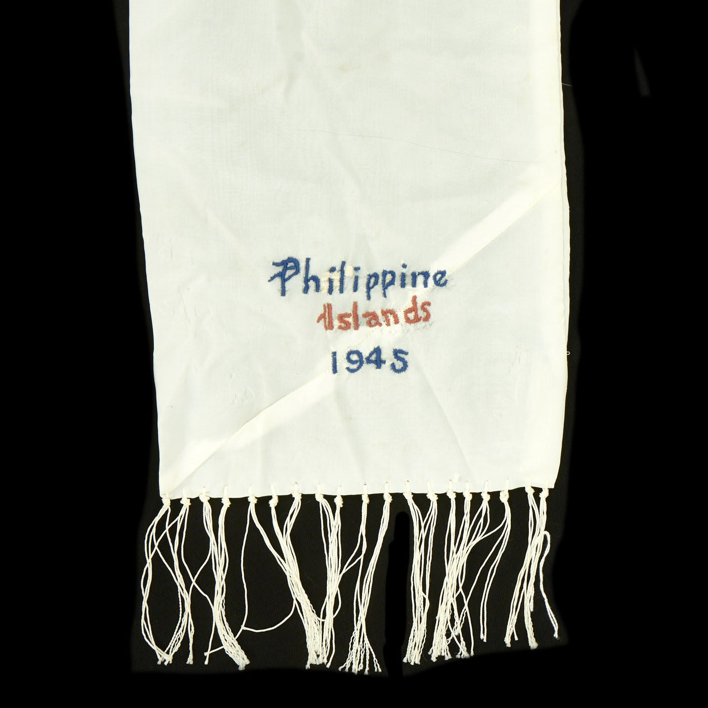 Original Item: One of a Kind. This is a fantastic WWII Commemorative scarf from from hand embroidered white fabric, measuring approximately 39"L x 10"W. It is possibly made from parachute canopy material. The Scarf has some tassels on the end, and lists many of the locations visited by Company A of the U.S. Army 1637th corps of Engineers. The travels of of this group were chronicled in the book The Story of the 1637th Engineers...The Willing Globetrotters by Robert Schumacher of Floral Park, NY, published on October 1946.