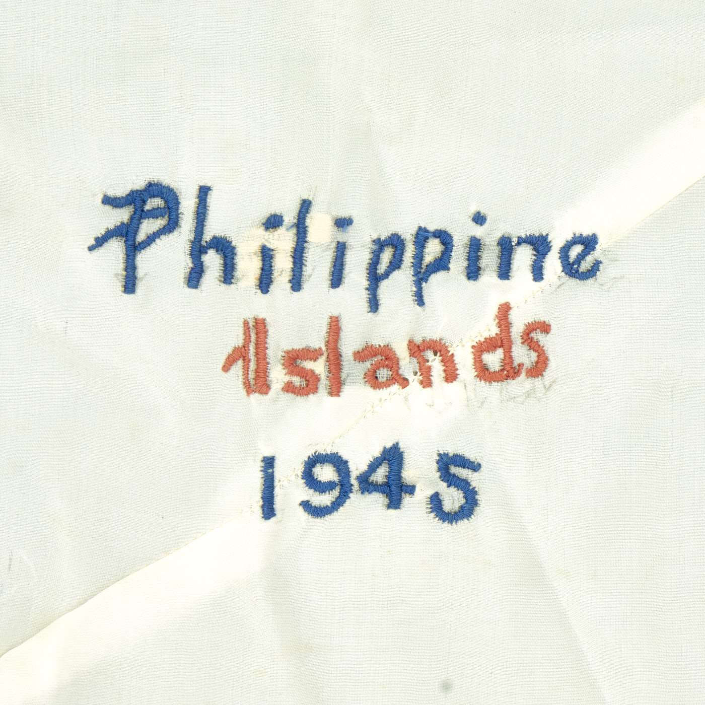 One end of the flag has a large embroidered "castle" emblem, the symbol of the Army Engineering Corps, and has 1637 above and Co. A below. Above this it there is The Glove Trotters embroidered as well, which does have a spelling error. The other end has Philippine Islands 1945 marked. Between these are listed other locations visited by the 1637th: France, Germany, Panama, New Guinea, Belgium. This really was a unit that "Trotted the Globe" during their service during WWII.