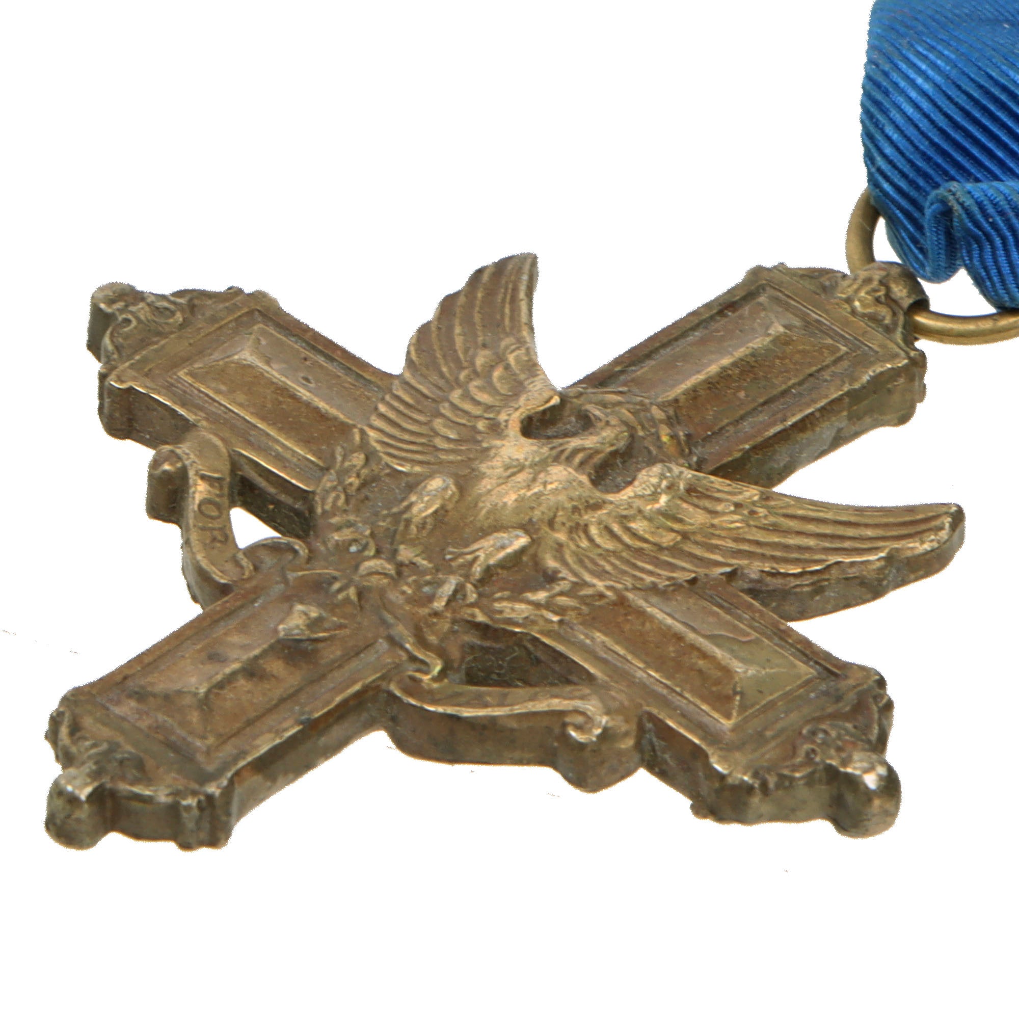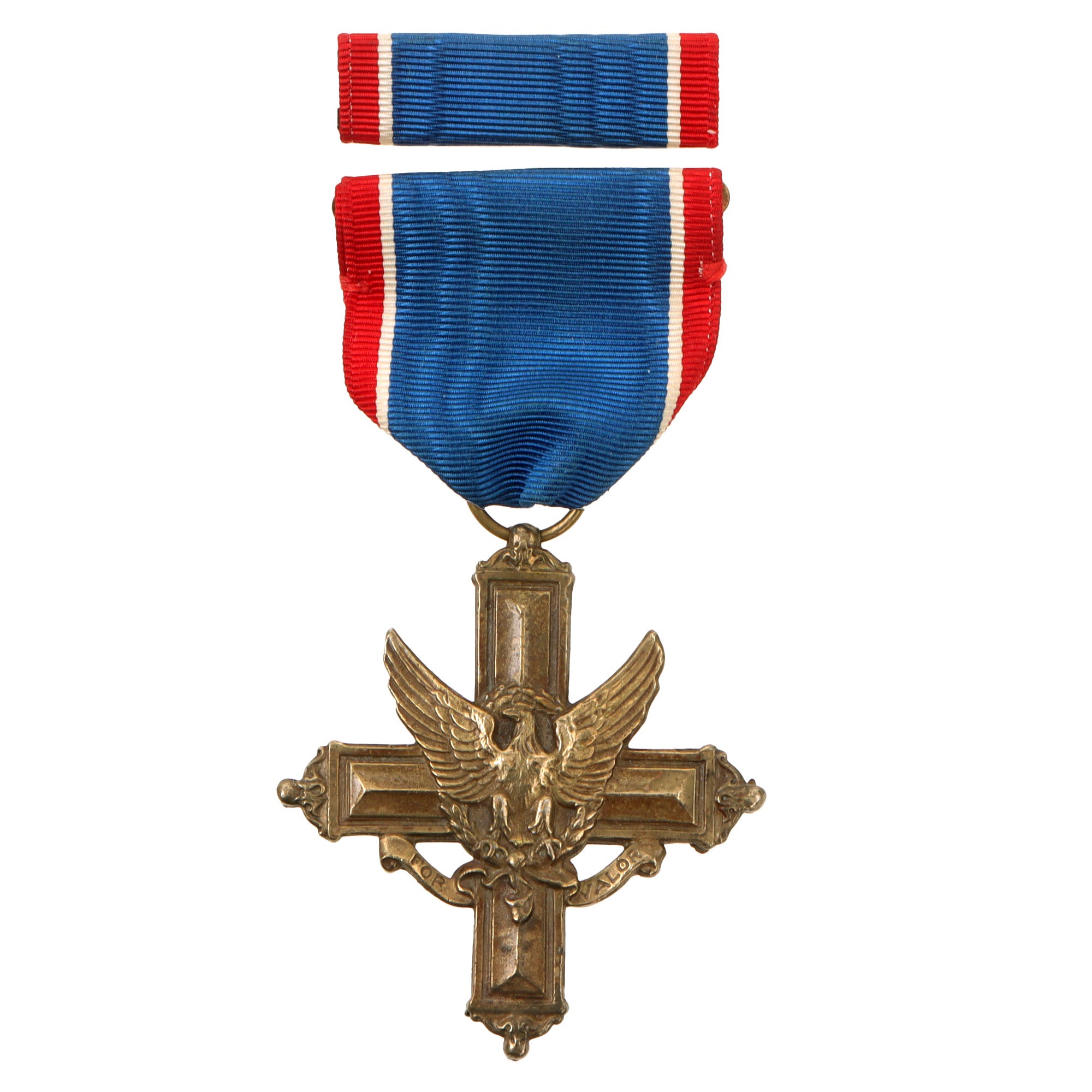 The award is a cross of bronze, 2 inches (5.1 cm) high and 1+13⁄16 inches (46 mm) wide with an eagle on the center and a scroll below the eagle bearing the inscription "FOR VALOR". On the reverse side, the center of the cross is circled by a wreath with a space for engraving the name of the recipient.