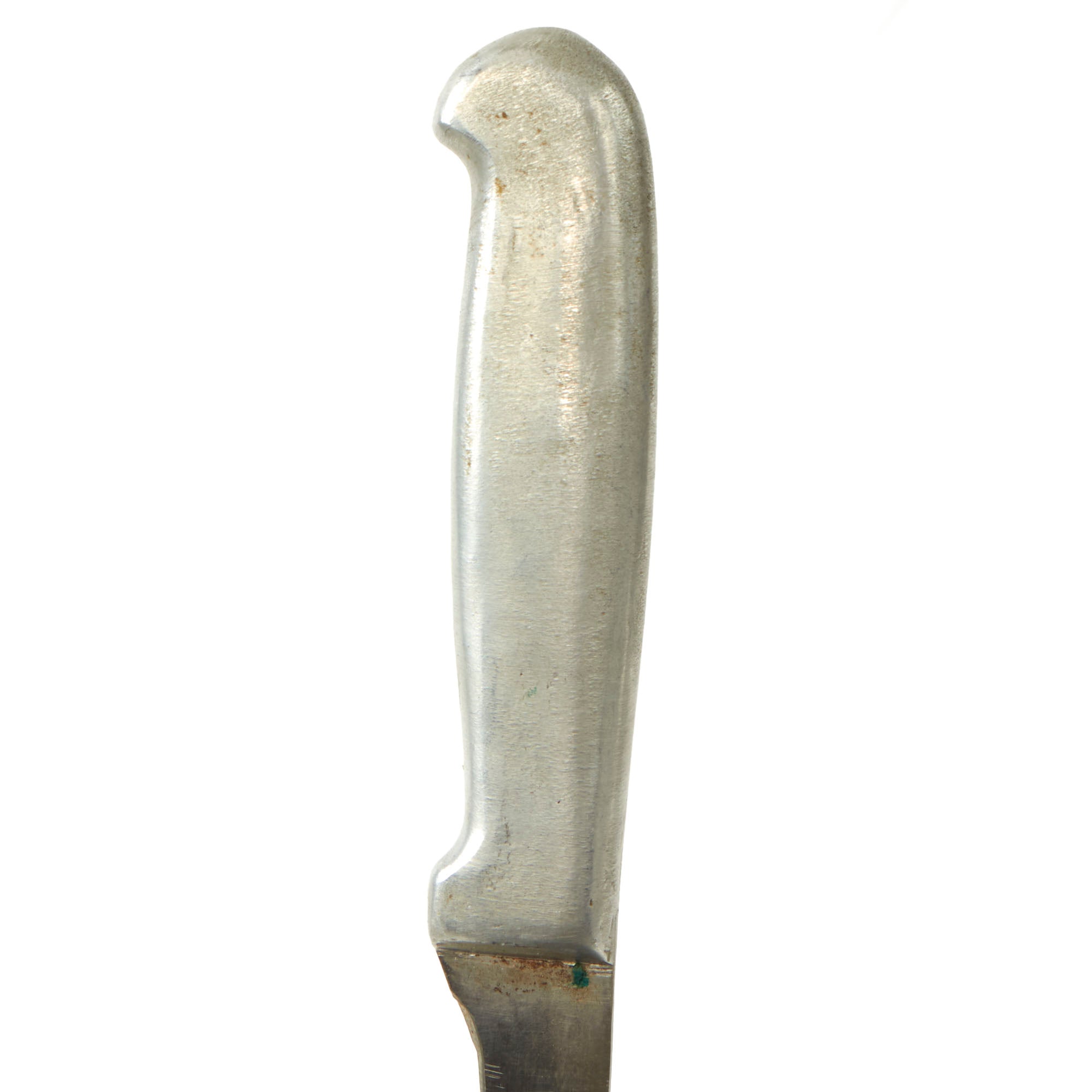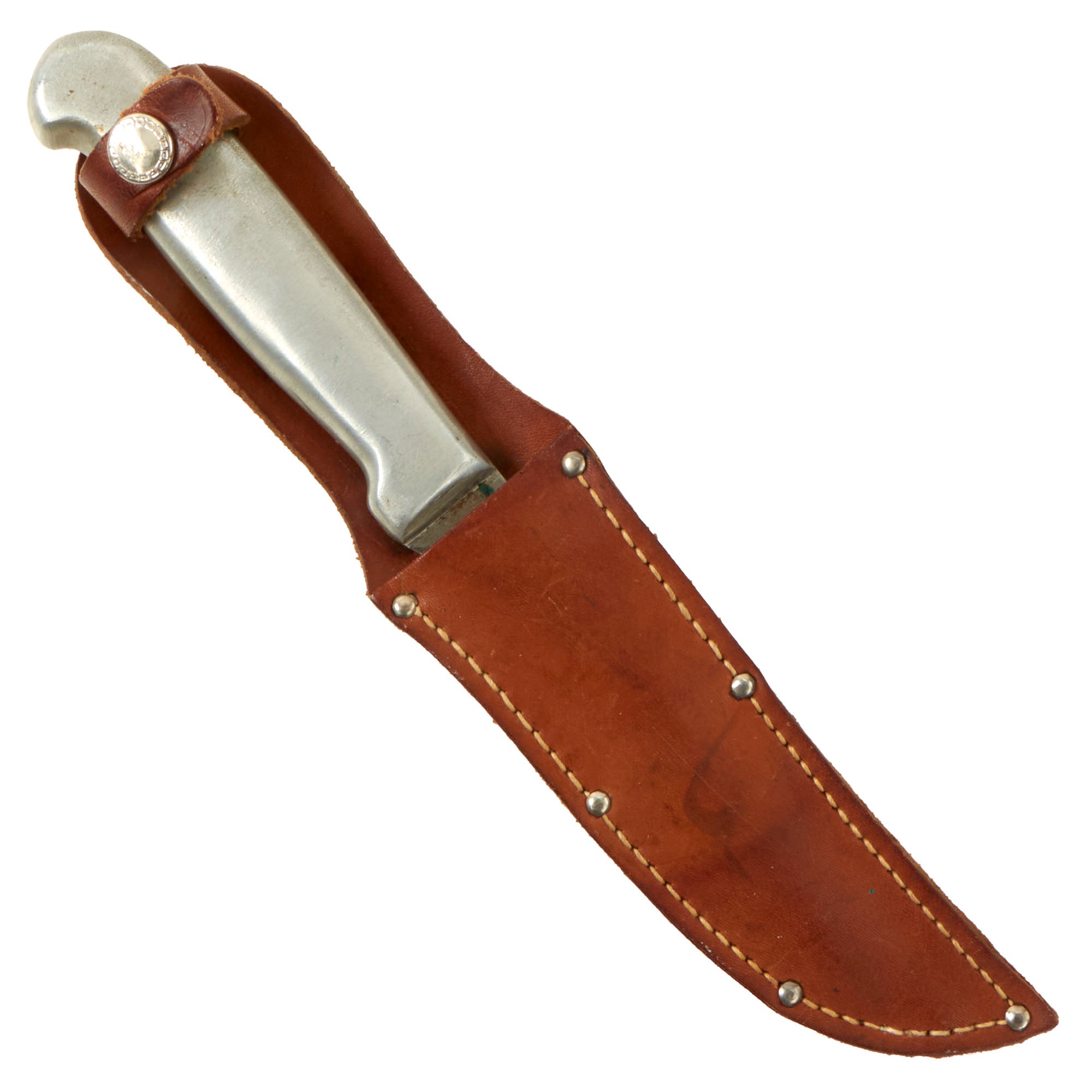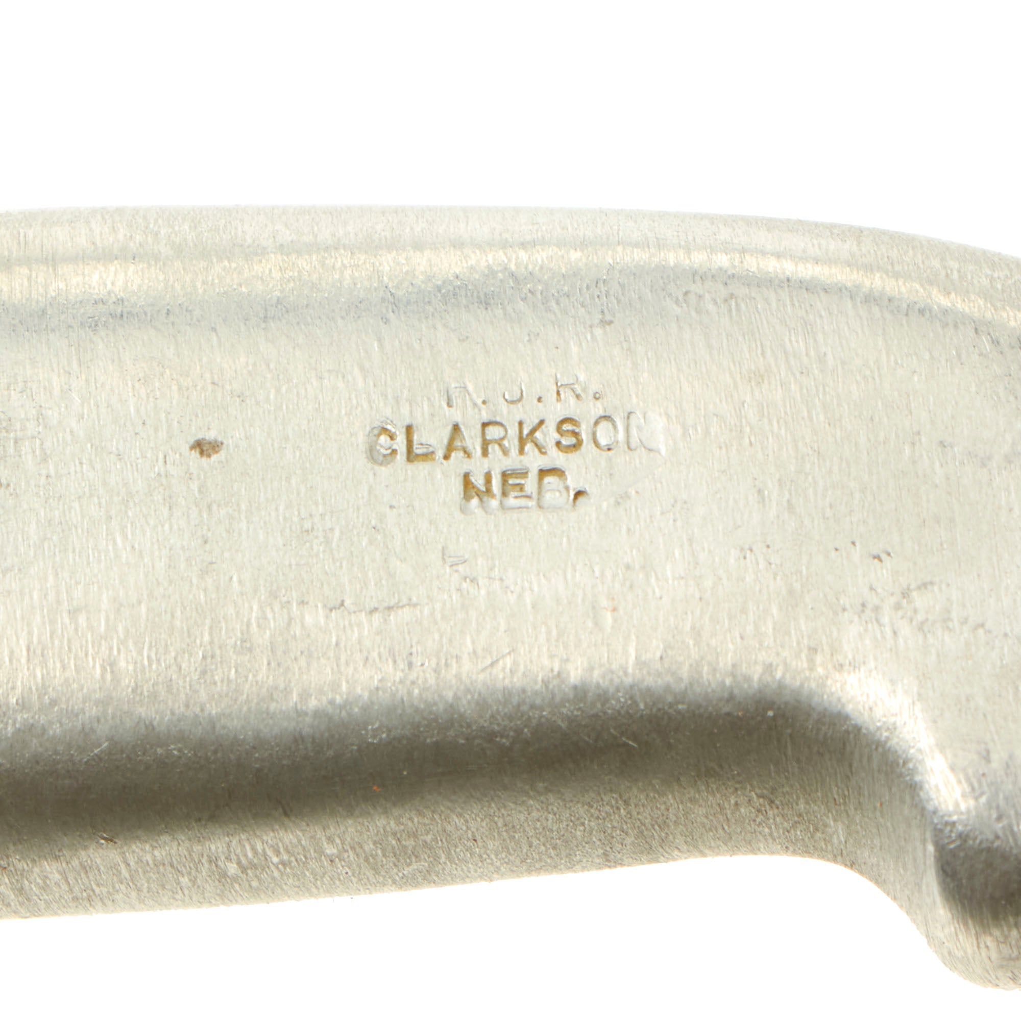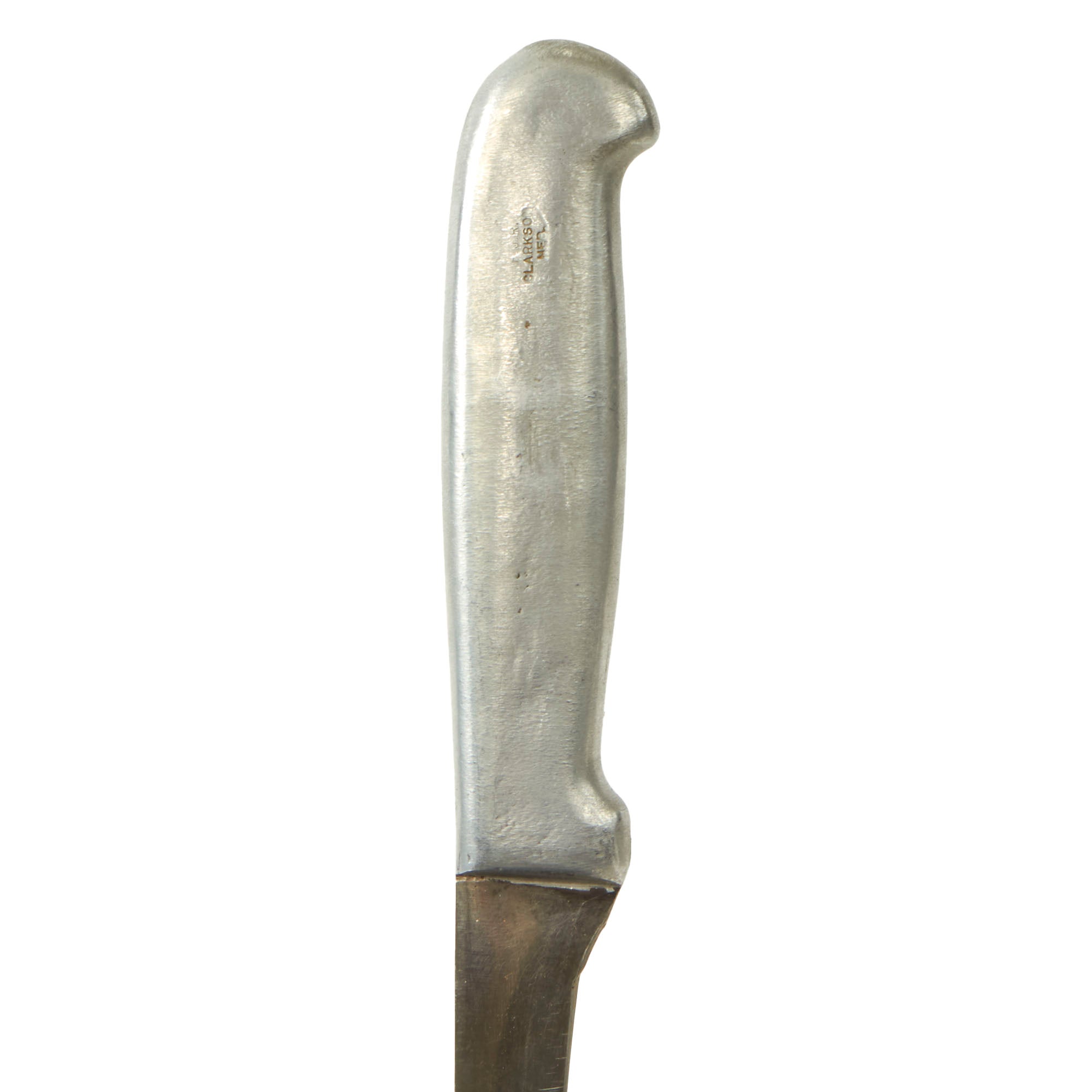 This Bread Slicer came in various sizes with this one being 5”, most likely shortened slightly when the knife was sharpened. The aluminum handle is molded directly onto the blade with the faint FJR / CLARKSON / NEB. marking on the pommel. The leather sheath could have been custom made or adapted from another knife.