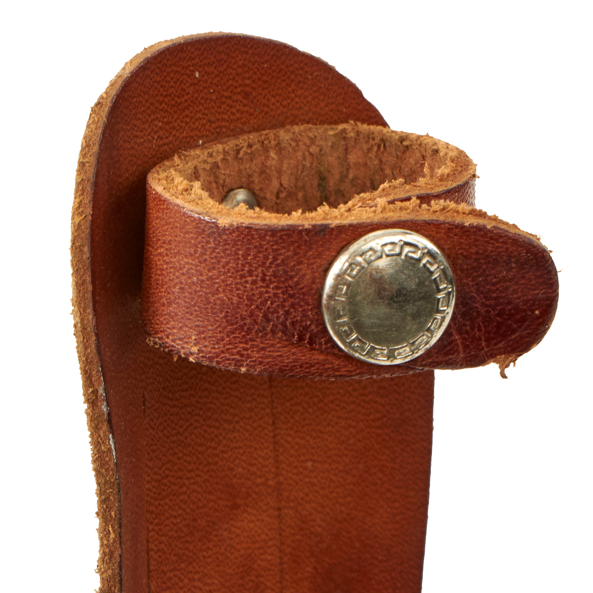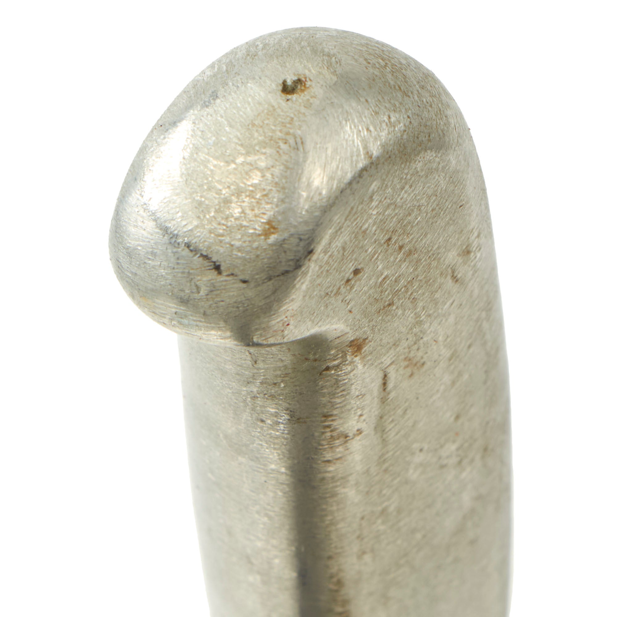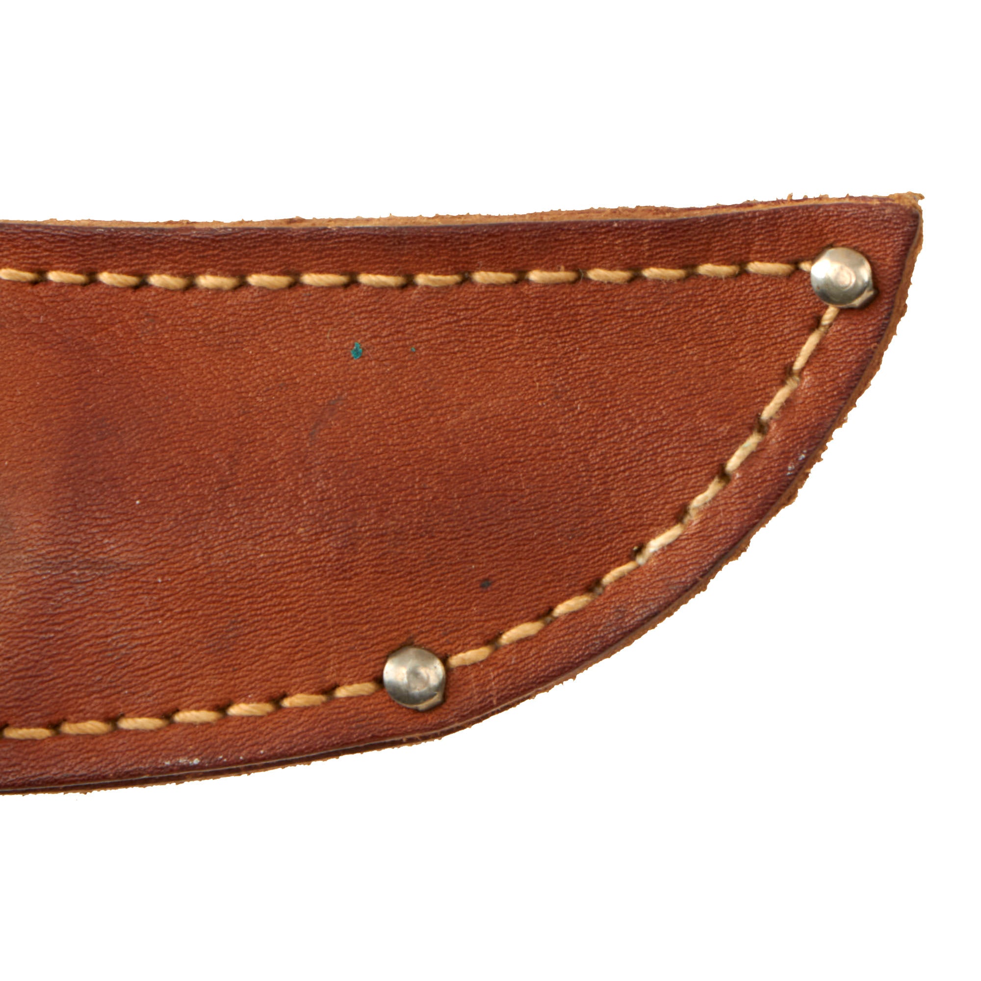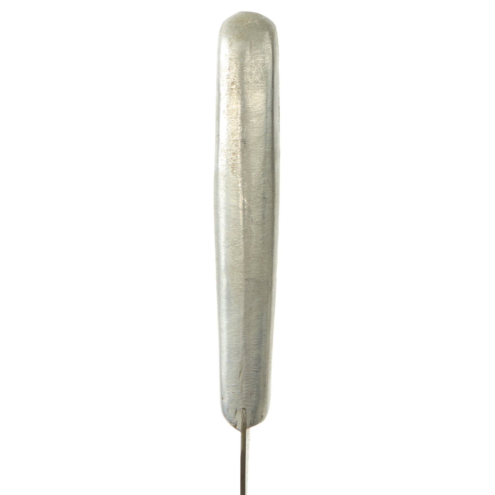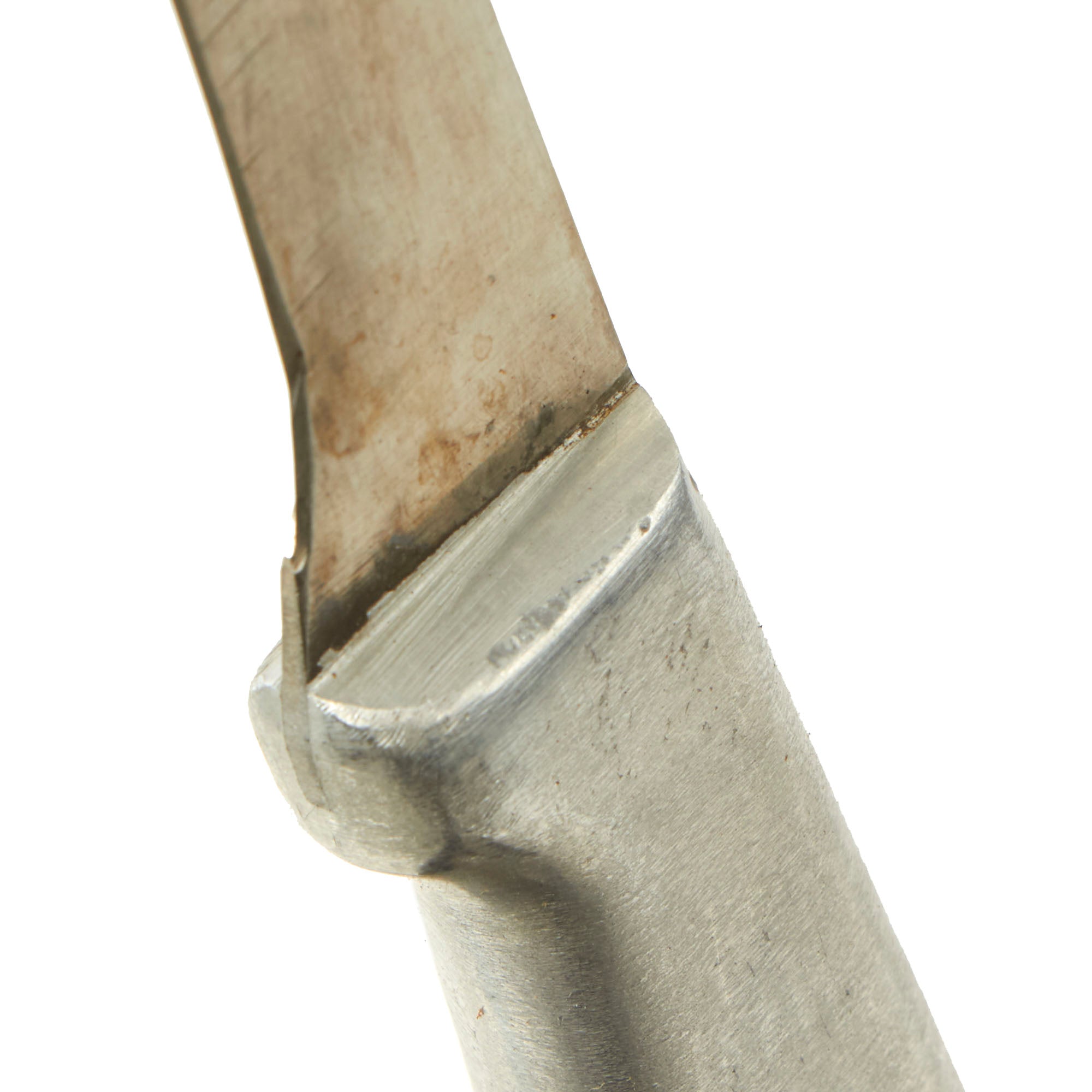 This Bread Slicer came in various sizes with this one being 5”, most likely shortened slightly when the knife was sharpened. The aluminum handle is molded directly onto the blade with the faint FJR / CLARKSON / NEB. marking on the pommel. The leather sheath could have been custom made or adapted from another knife.