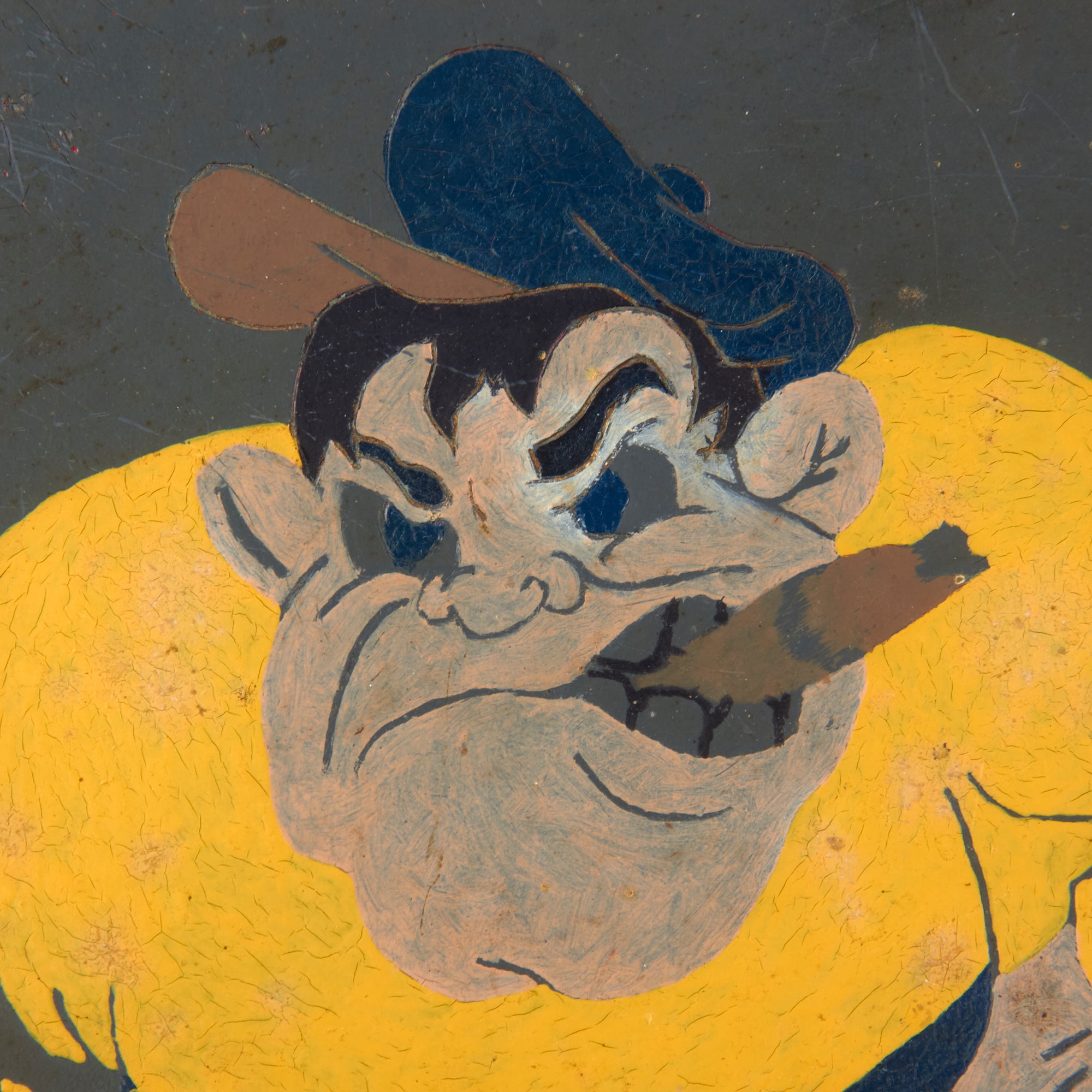 Original Item. One-of-a-Kind. This is a very interesting painted piece of Masonite dating to World War II, which is painted with the depiction of a “Brawler” style man with fists at his sides and smoking a cigar. This came from a large collection of PT Boat related items, so we believe it to be depicting the mascot for a PT boat, but due to its obscurity, we couldn’t find any matches online.