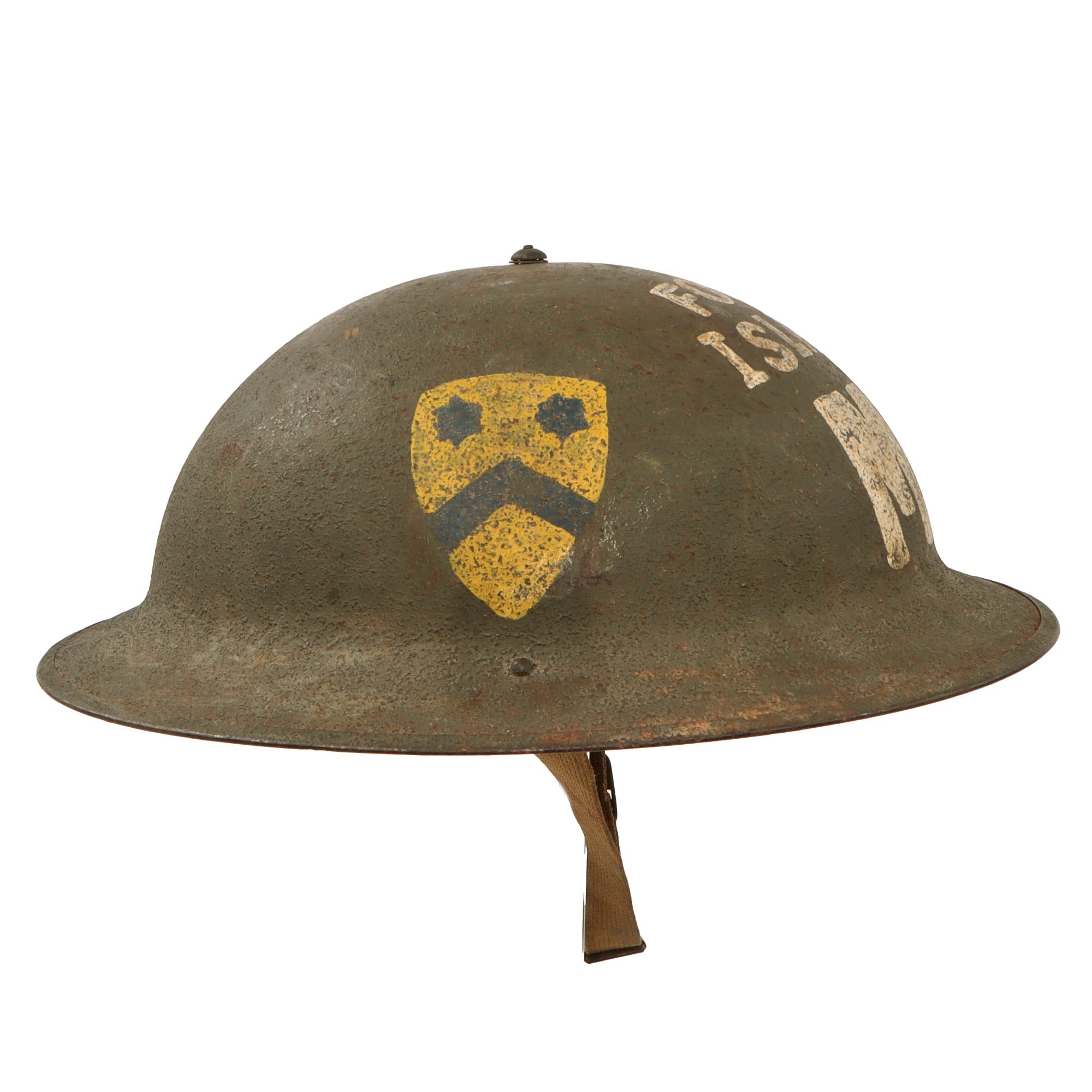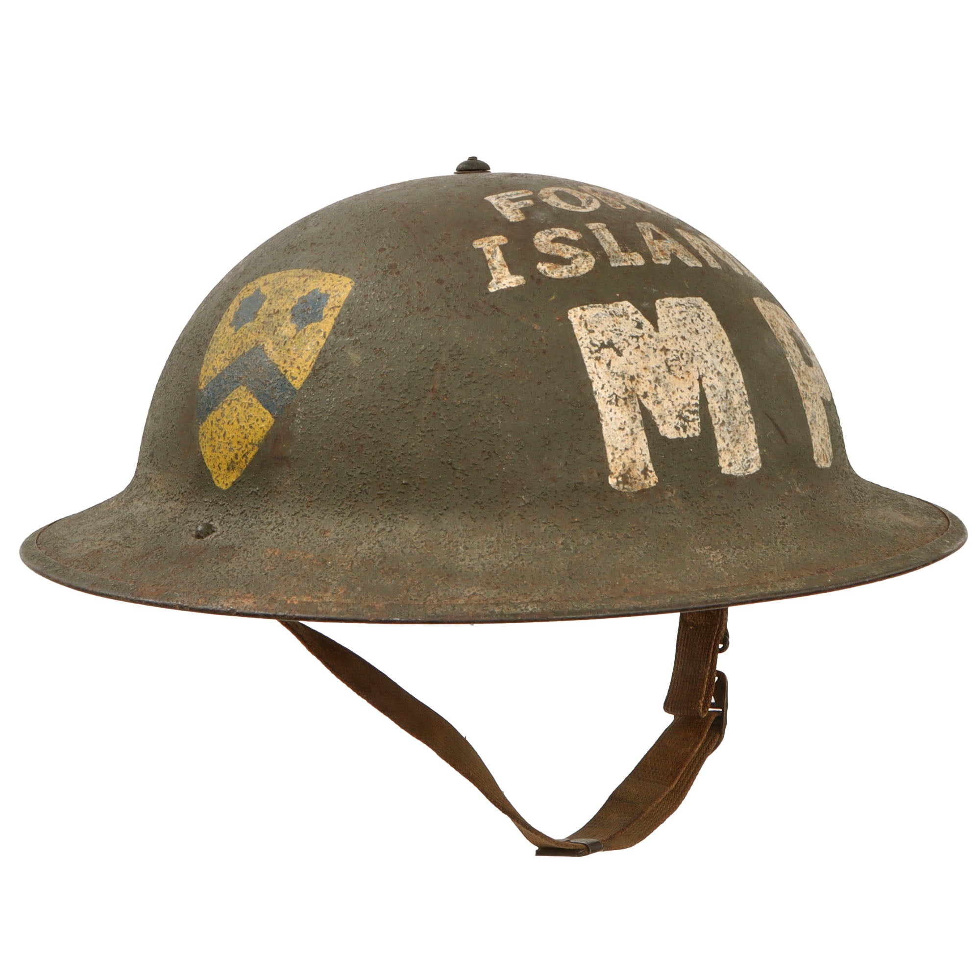 The helmet is painted on the side with the insignia of the 2nd Cavalry Division, and on the front with “FORD ISLAND / MP.” While the paint displays significant age and wear consistent with long-term use, we have been unable to find documented evidence of the 2nd Cavalry Division serving in a Military Police role on Ford Island. As such, we cannot definitively confirm the authenticity or origin of the applied insignia. Notably, the paint does not fluoresce under blacklight inspection, leaving its exact provenance uncertain. Buyers should evaluate this aspect accordingly.