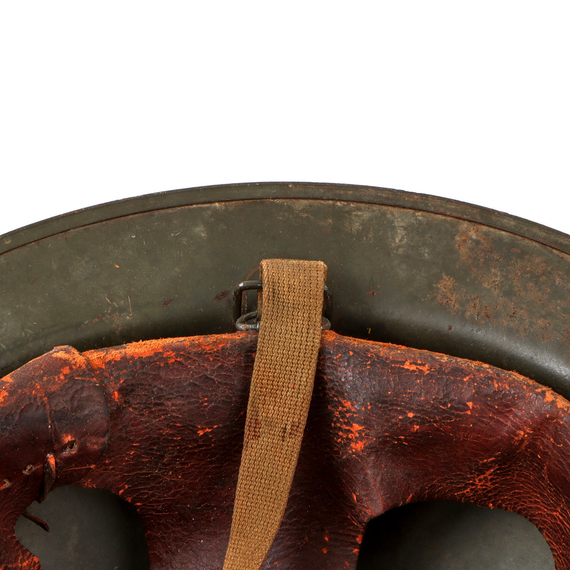The canvas chin strap exhibits moderate wear and staining but remains solid and functional, with no tears. The correct brass buckle and clip are present and intact.