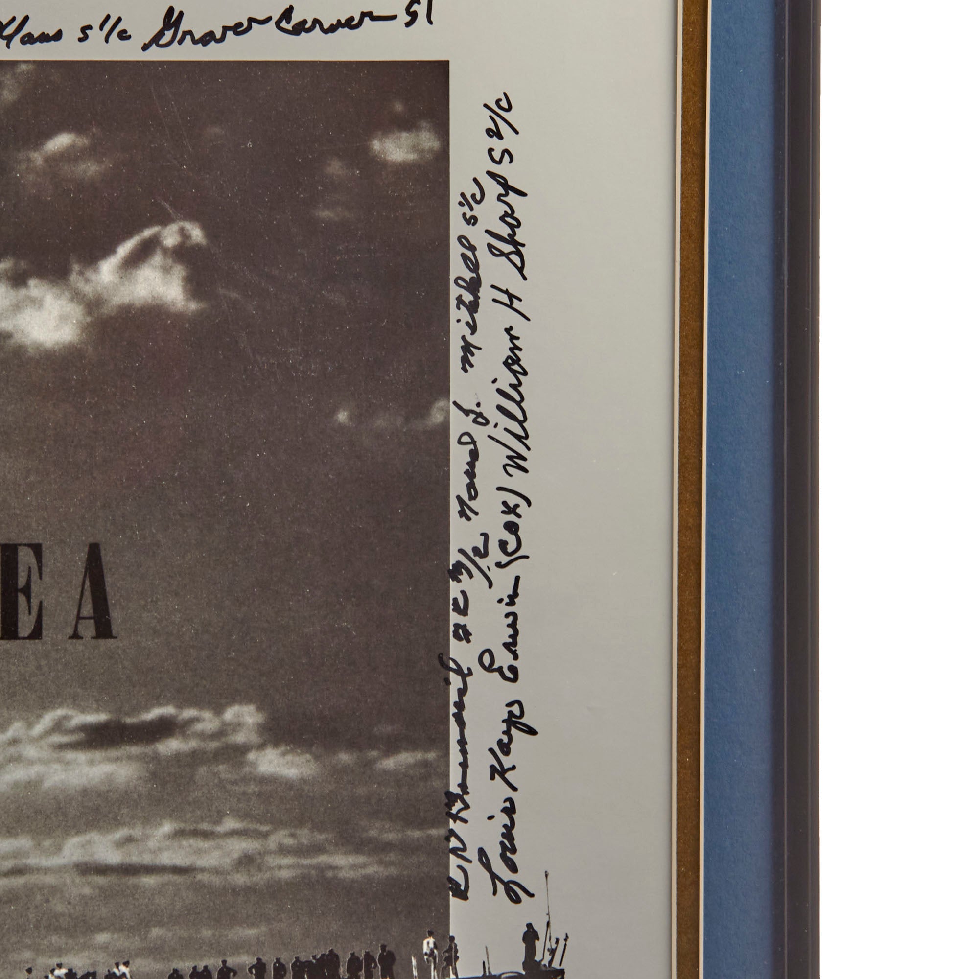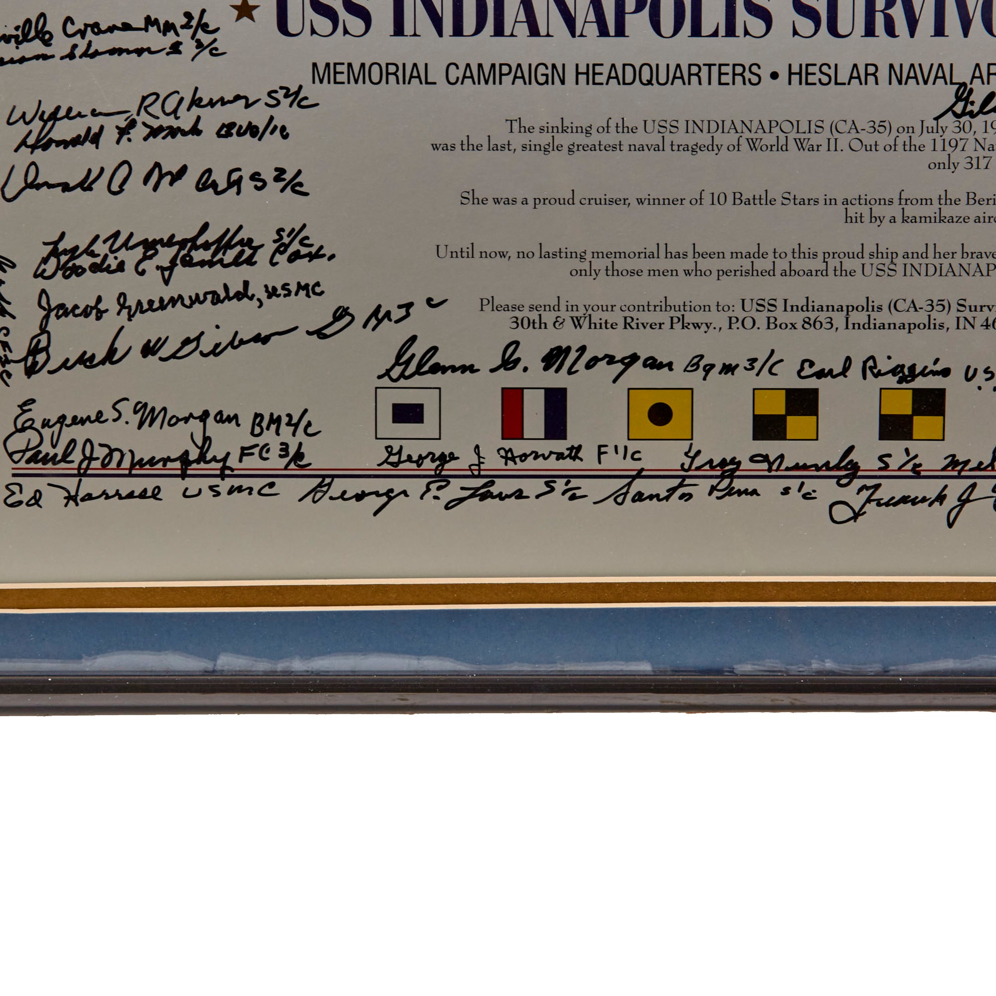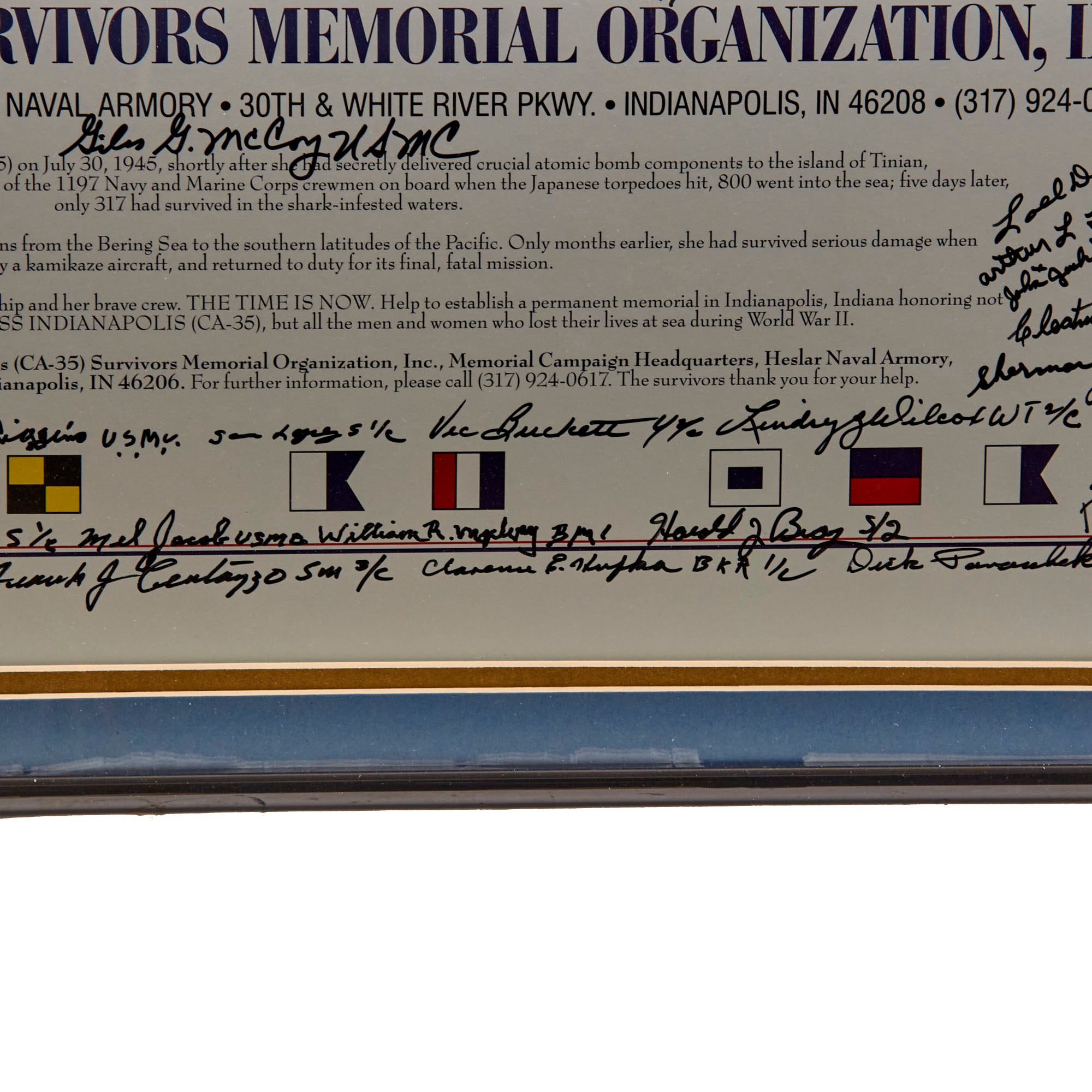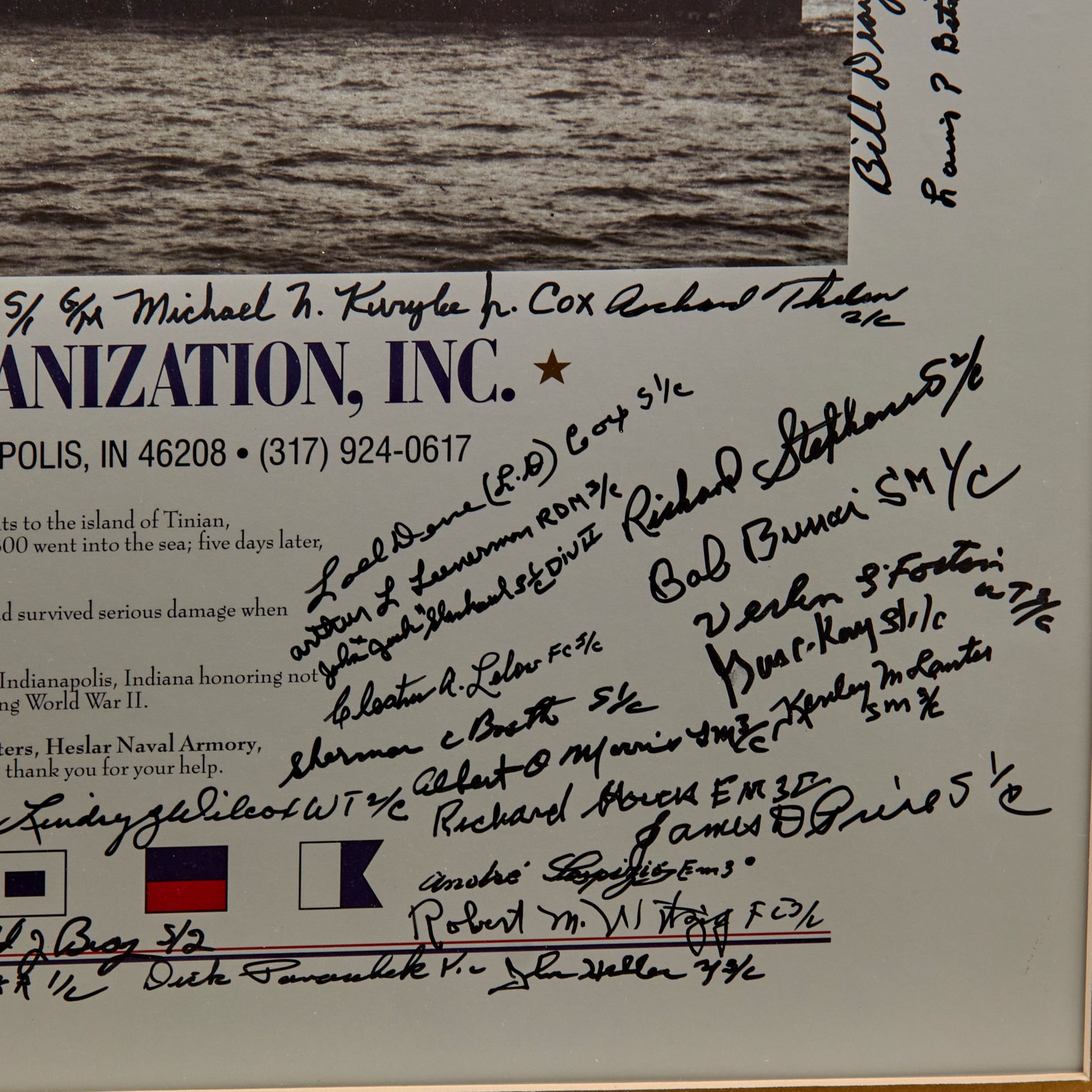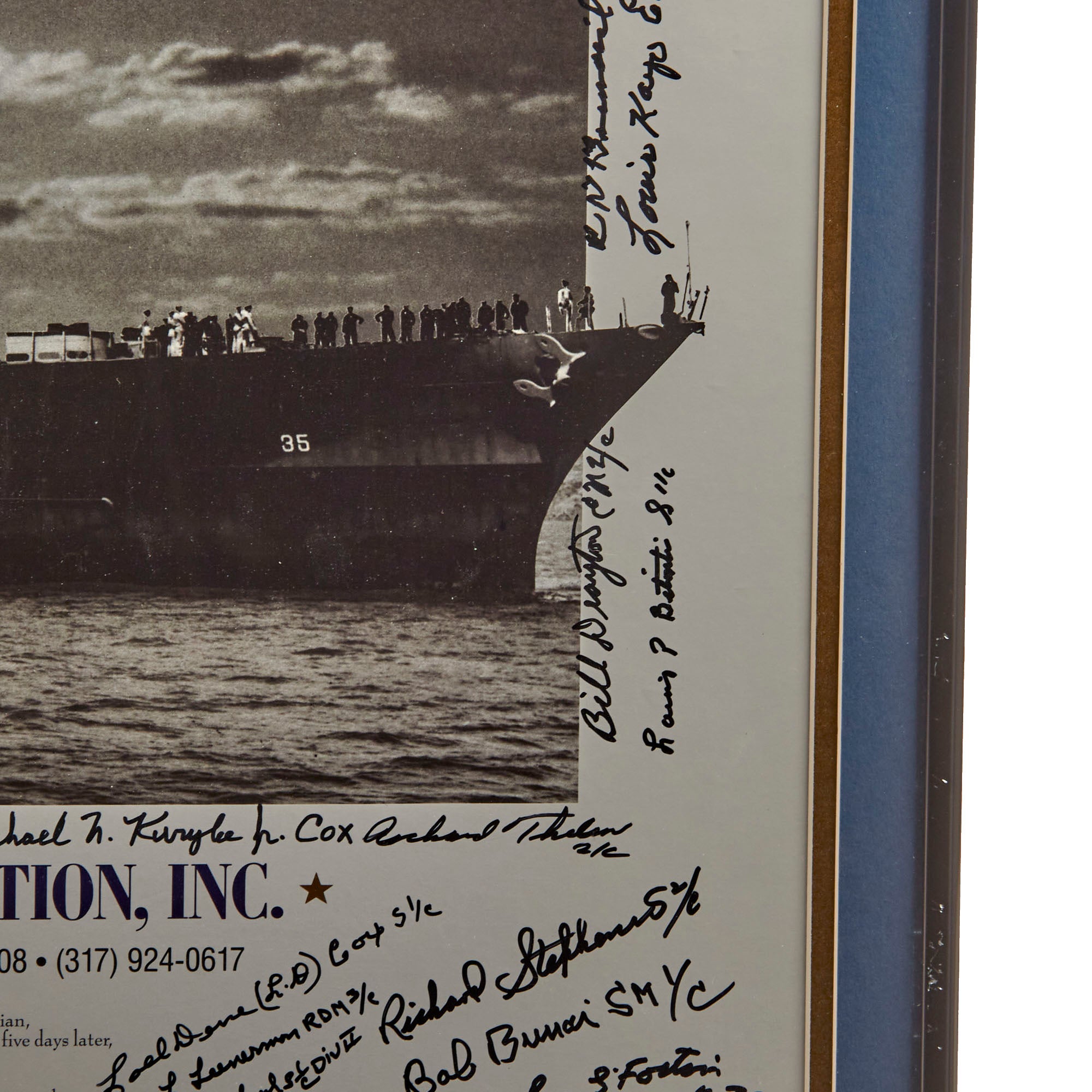 This is an outstanding framed poster for the USS Indianapolis Survivors Memorial Organization, which has been signed by roughly 63 survivors with many including their ranks. The way they are organized makes it difficult to count how many there are exactly, but we have given our best estimate. The frame is in great condition, with a retained hanging wire.