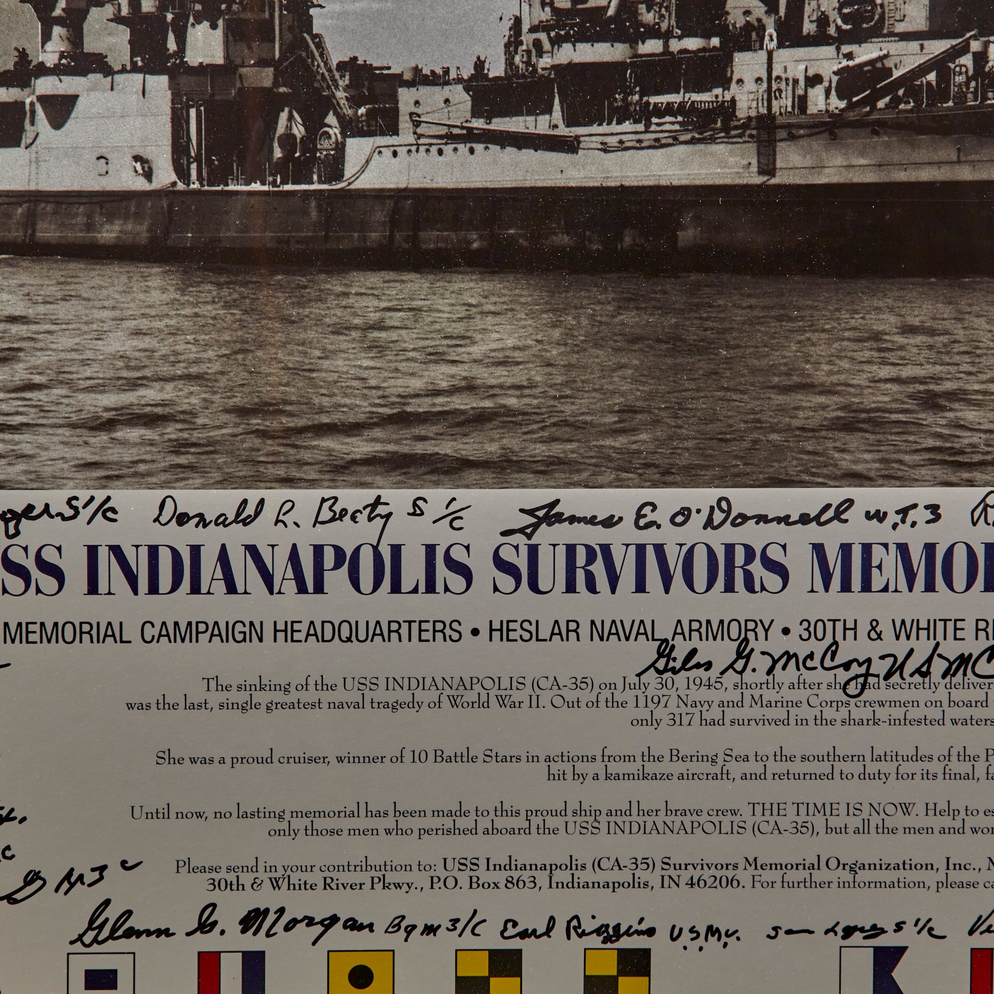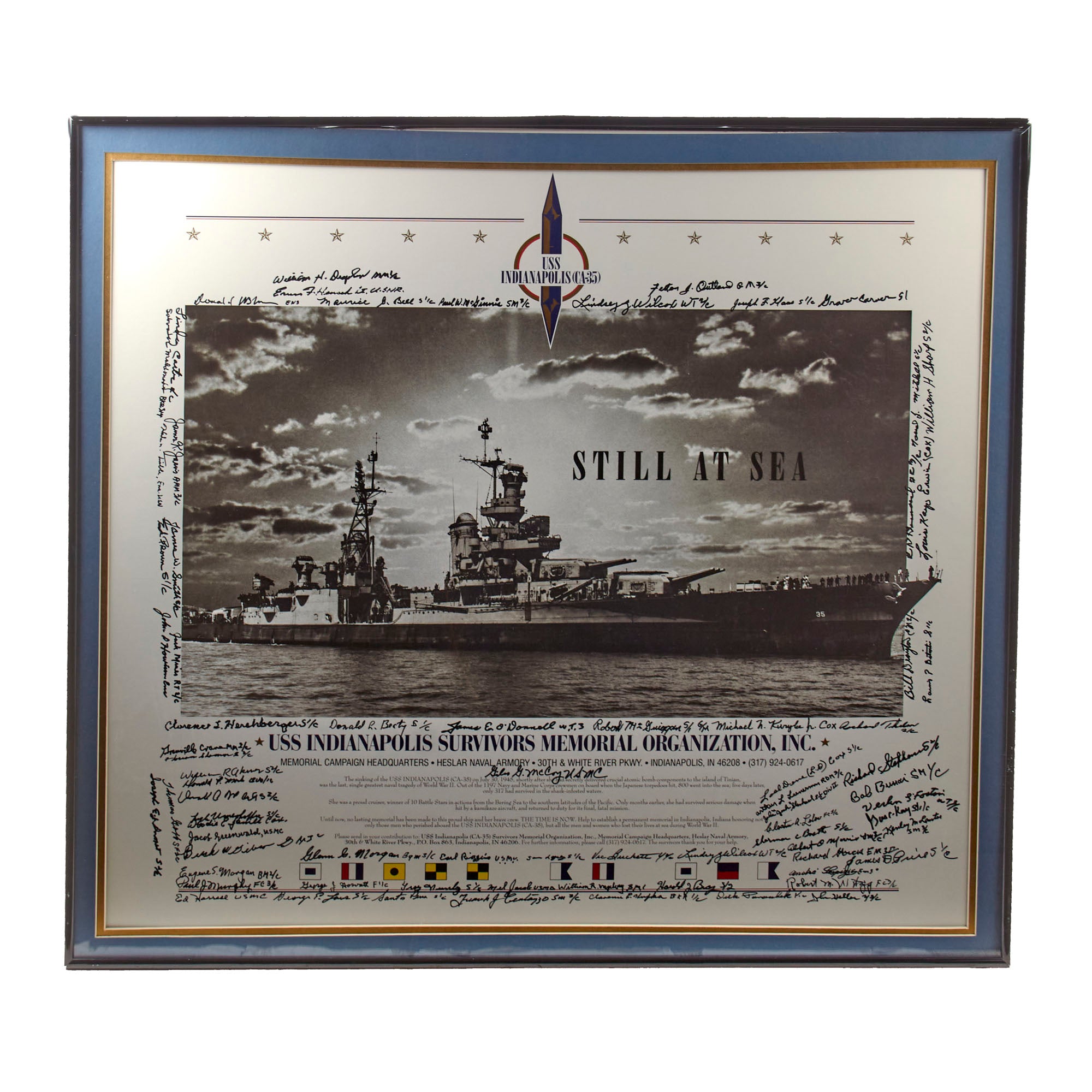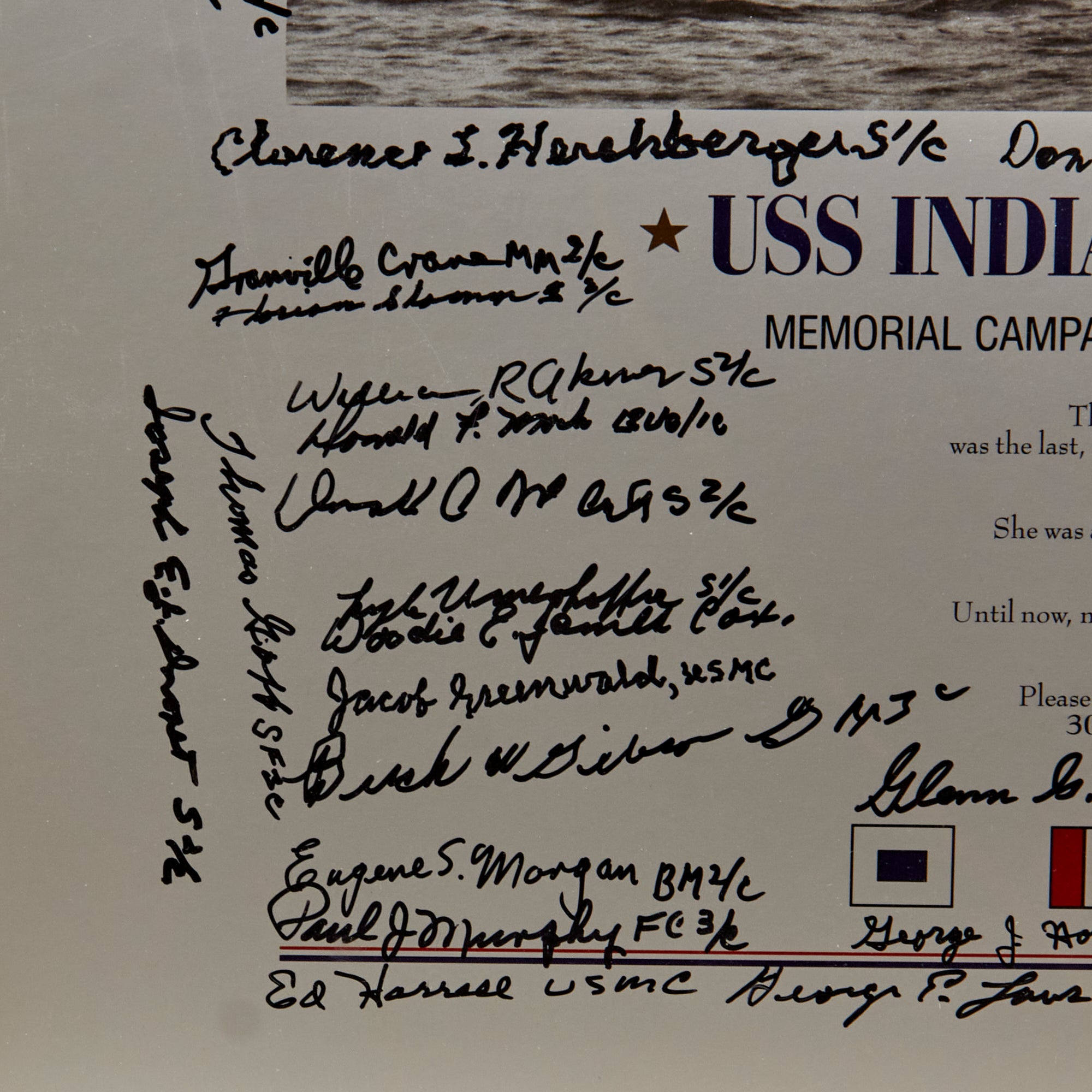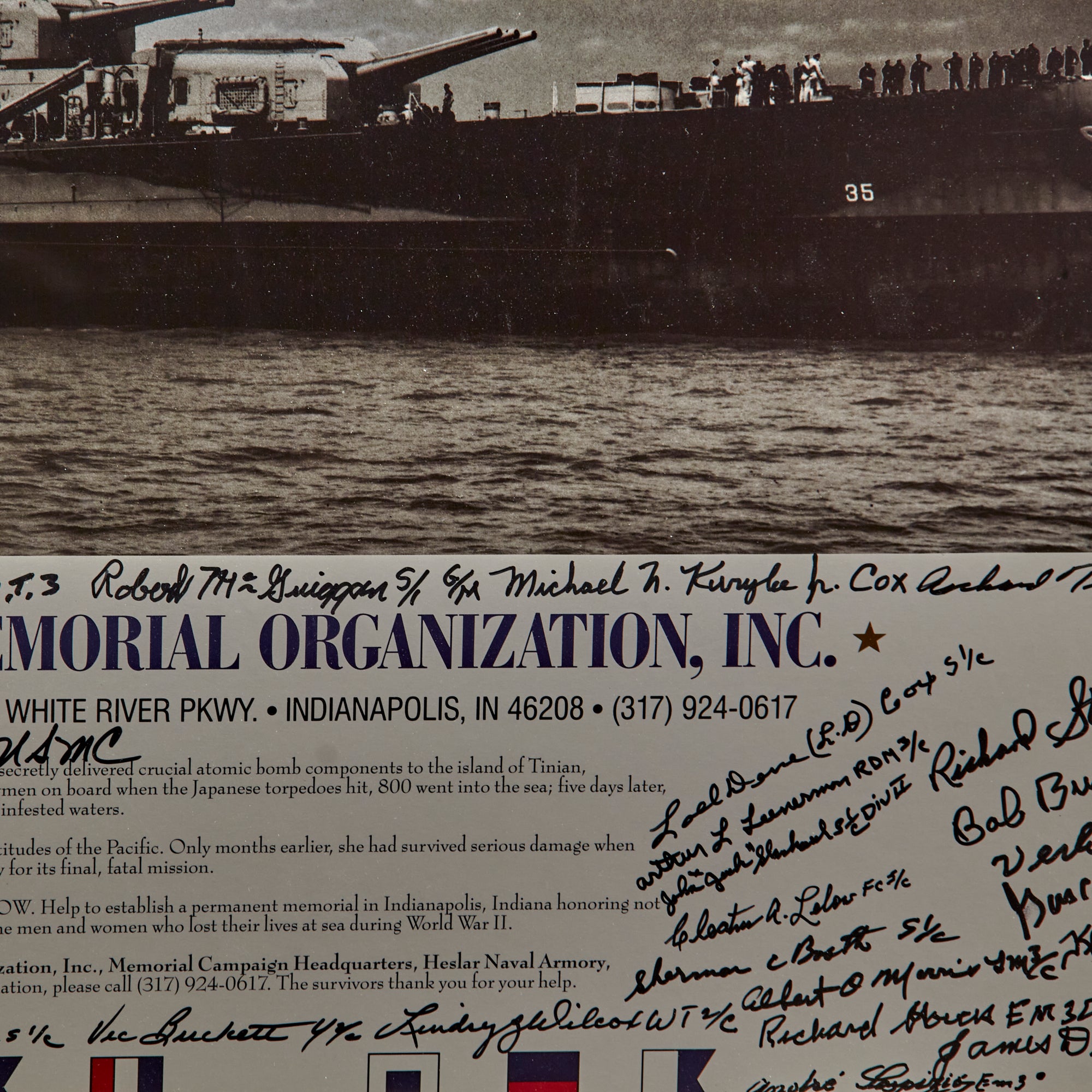 This is an outstanding framed poster for the USS Indianapolis Survivors Memorial Organization, which has been signed by roughly 63 survivors with many including their ranks. The way they are organized makes it difficult to count how many there are exactly, but we have given our best estimate. The frame is in great condition, with a retained hanging wire.