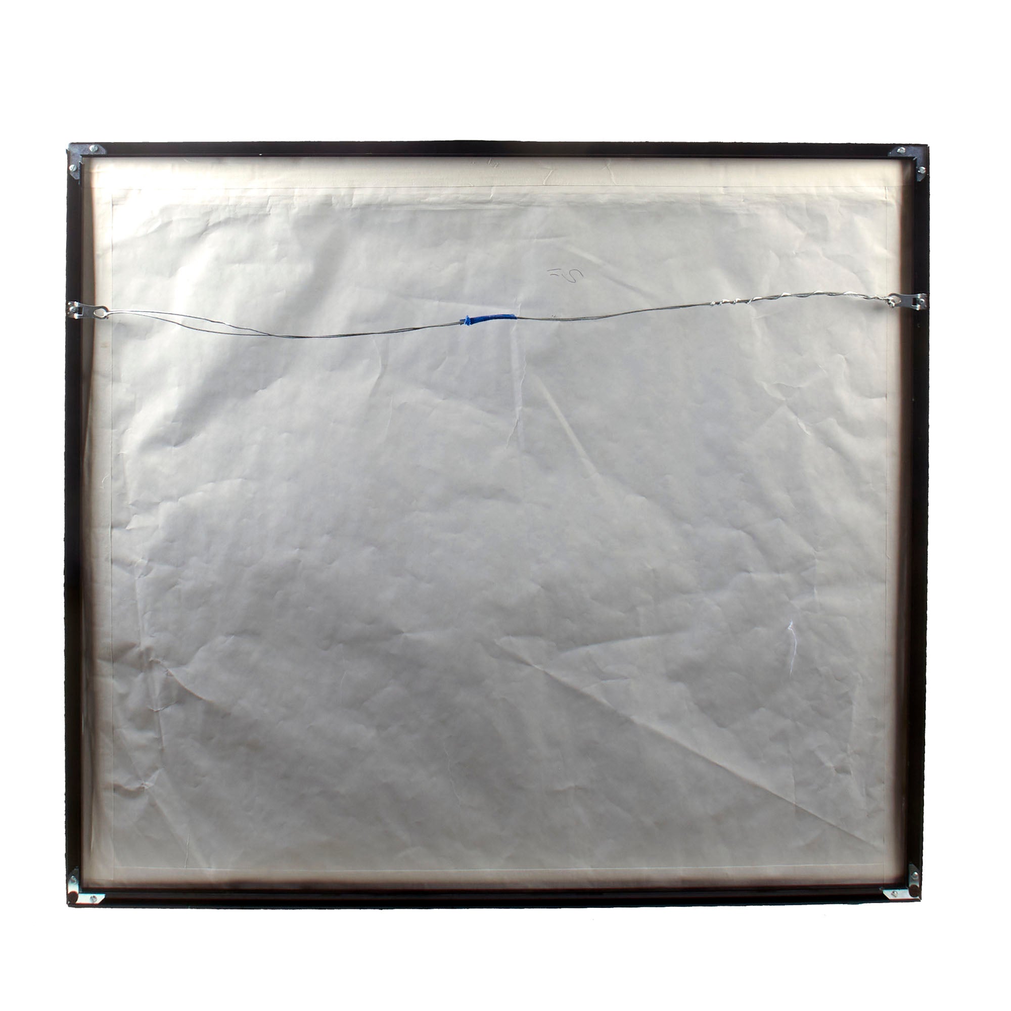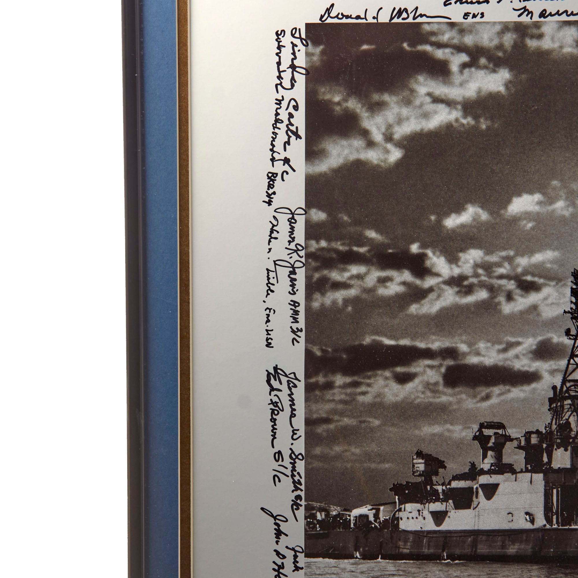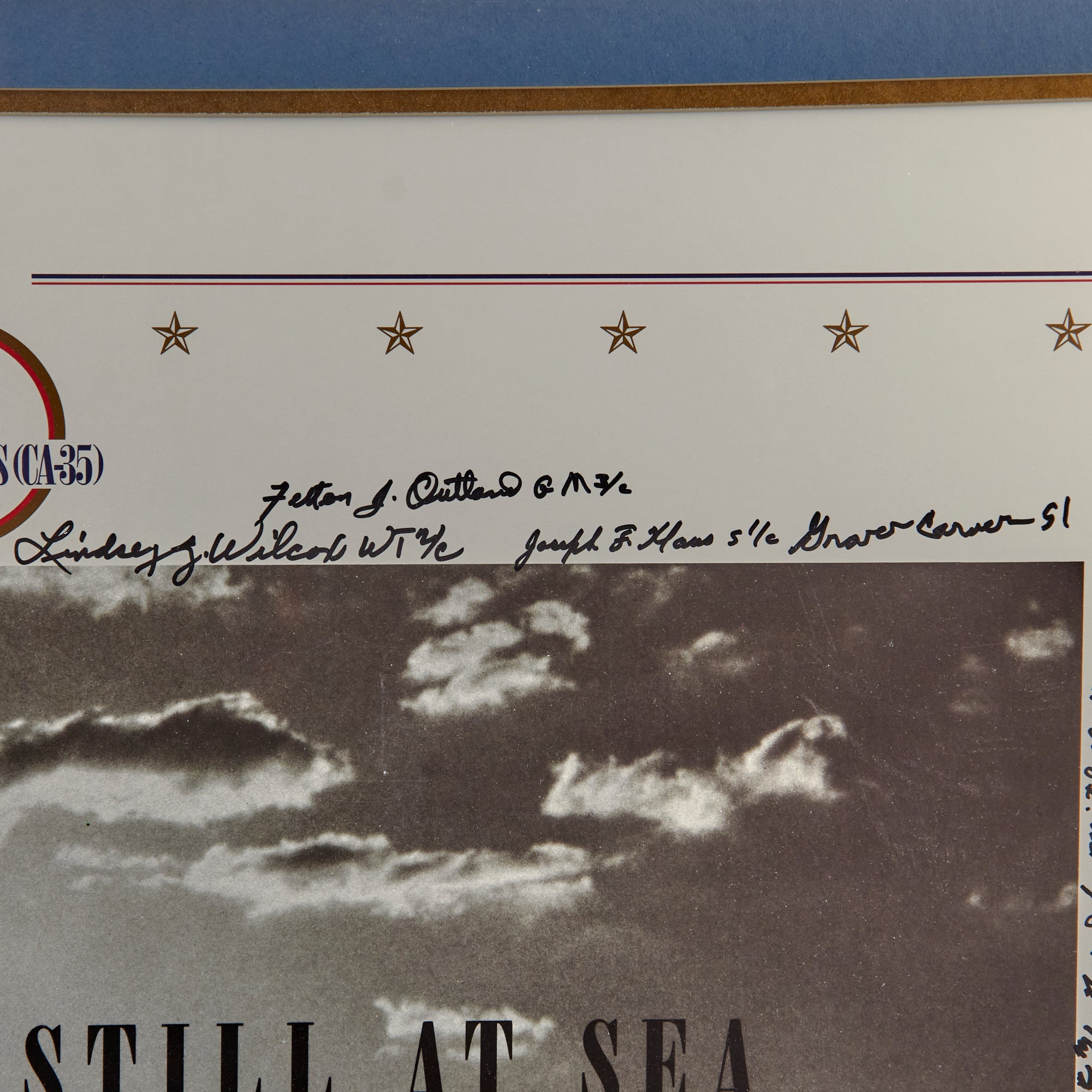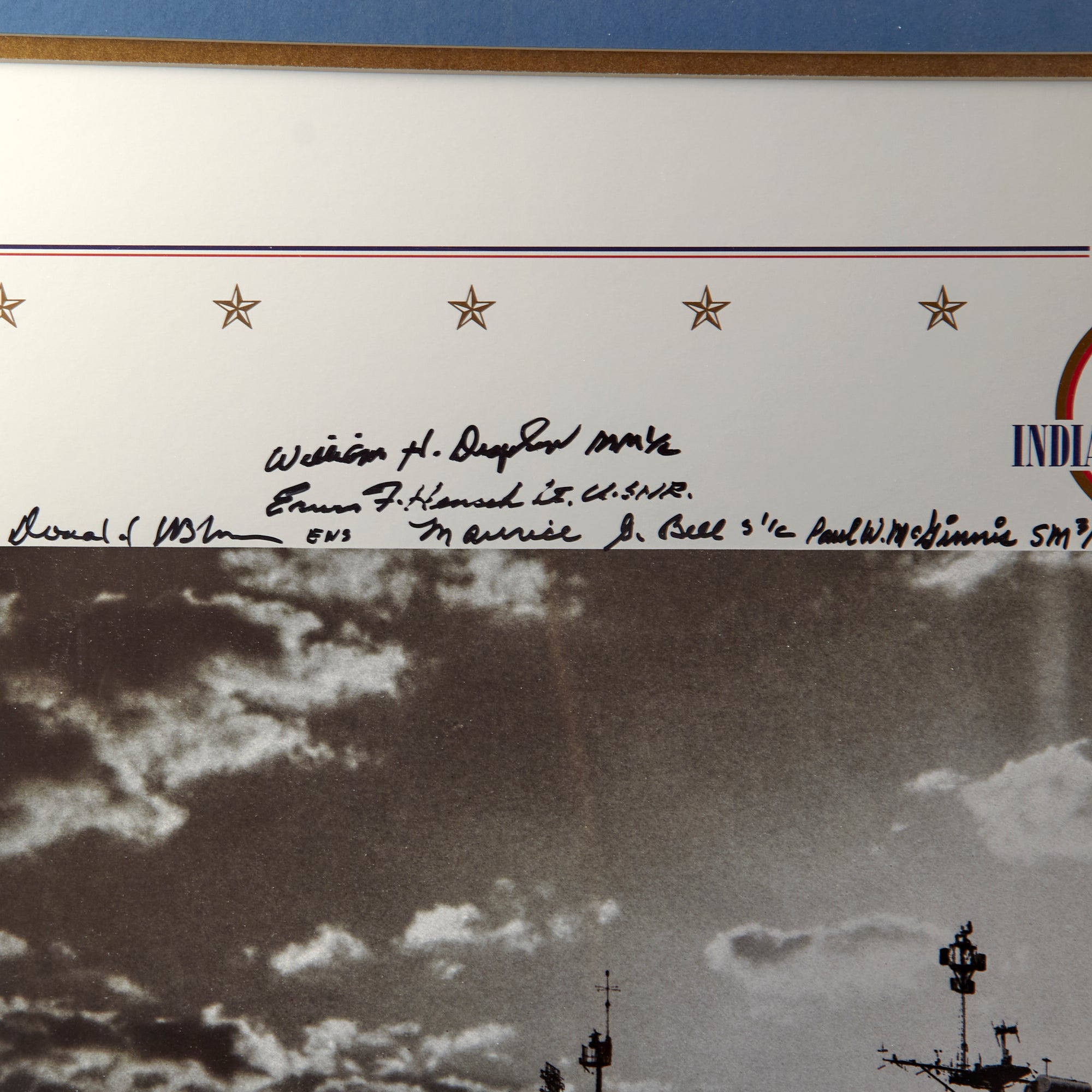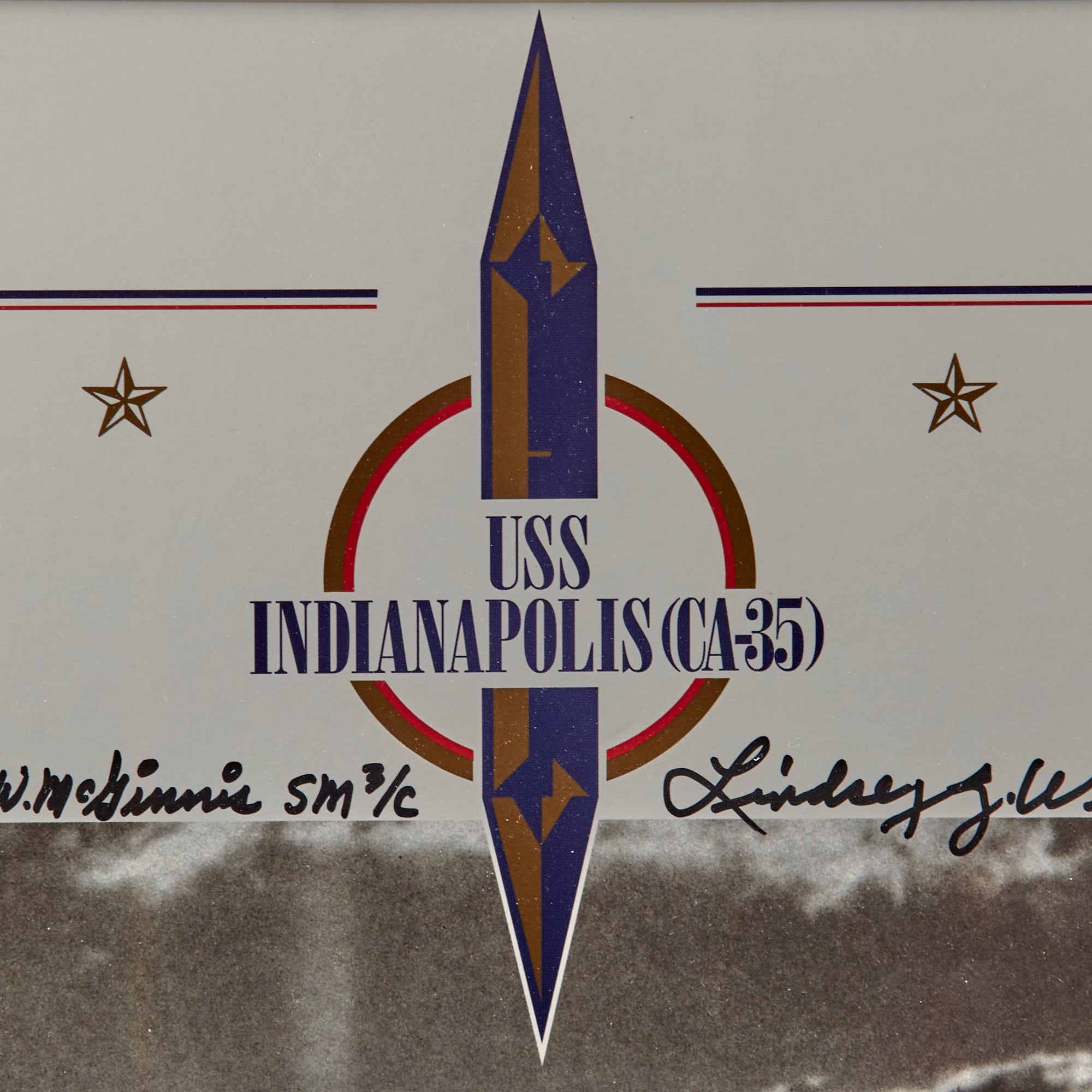 This is an outstanding framed poster for the USS Indianapolis Survivors Memorial Organization, which has been signed by roughly 63 survivors with many including their ranks. The way they are organized makes it difficult to count how many there are exactly, but we have given our best estimate. The frame is in great condition, with a retained hanging wire.