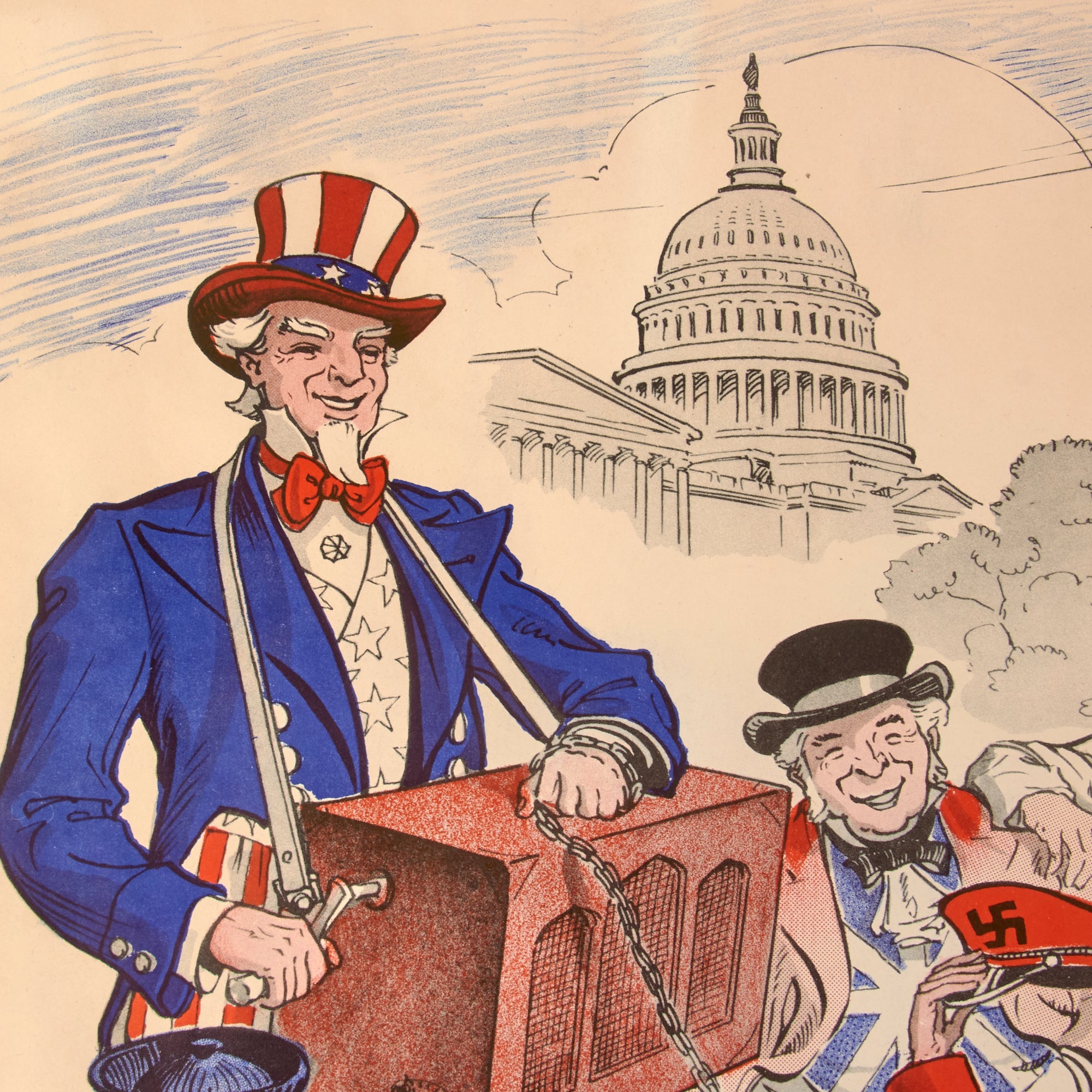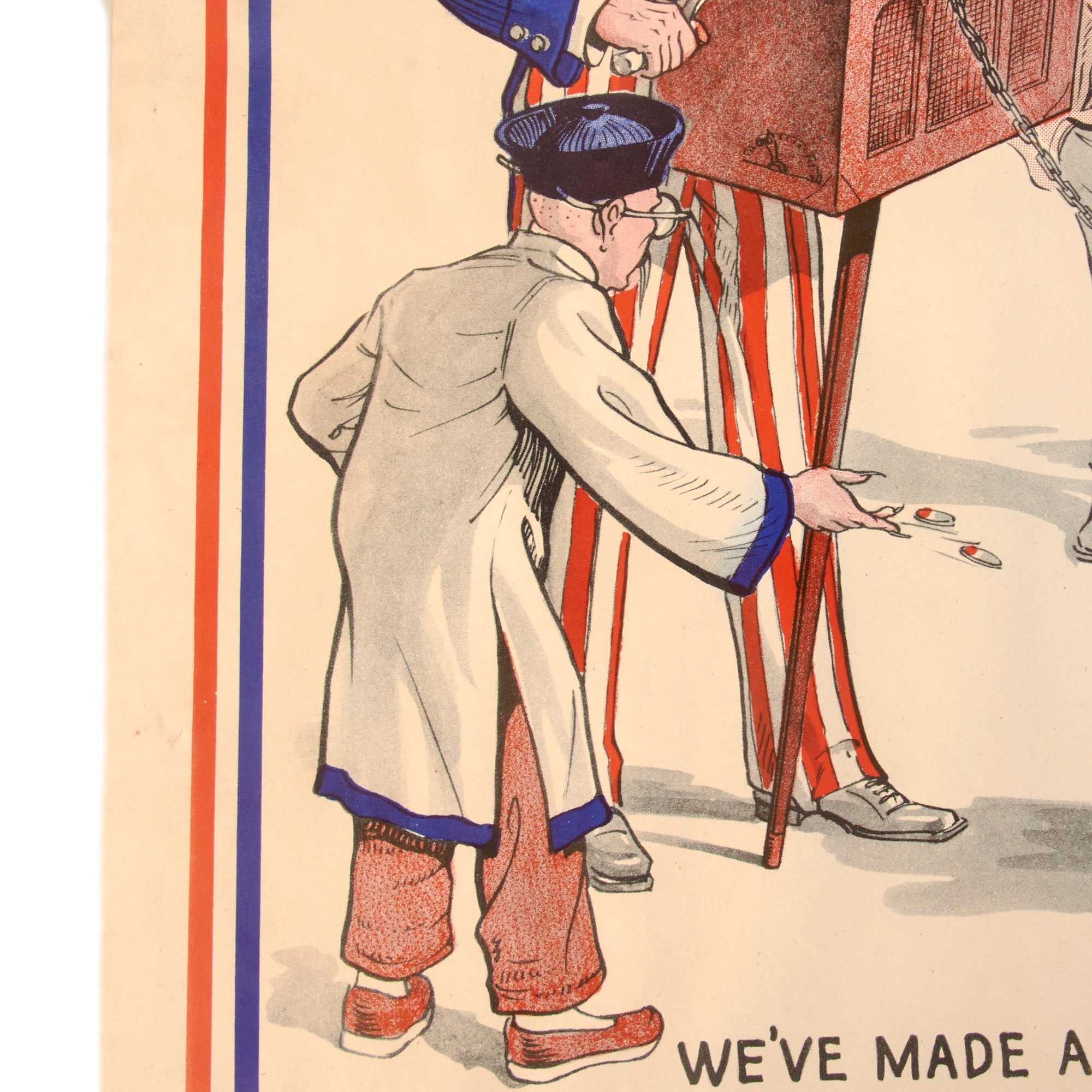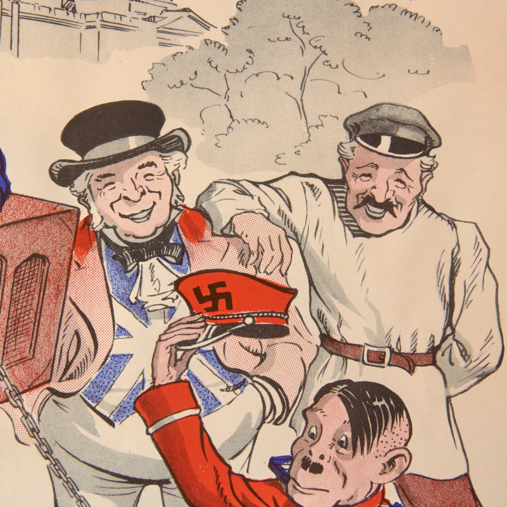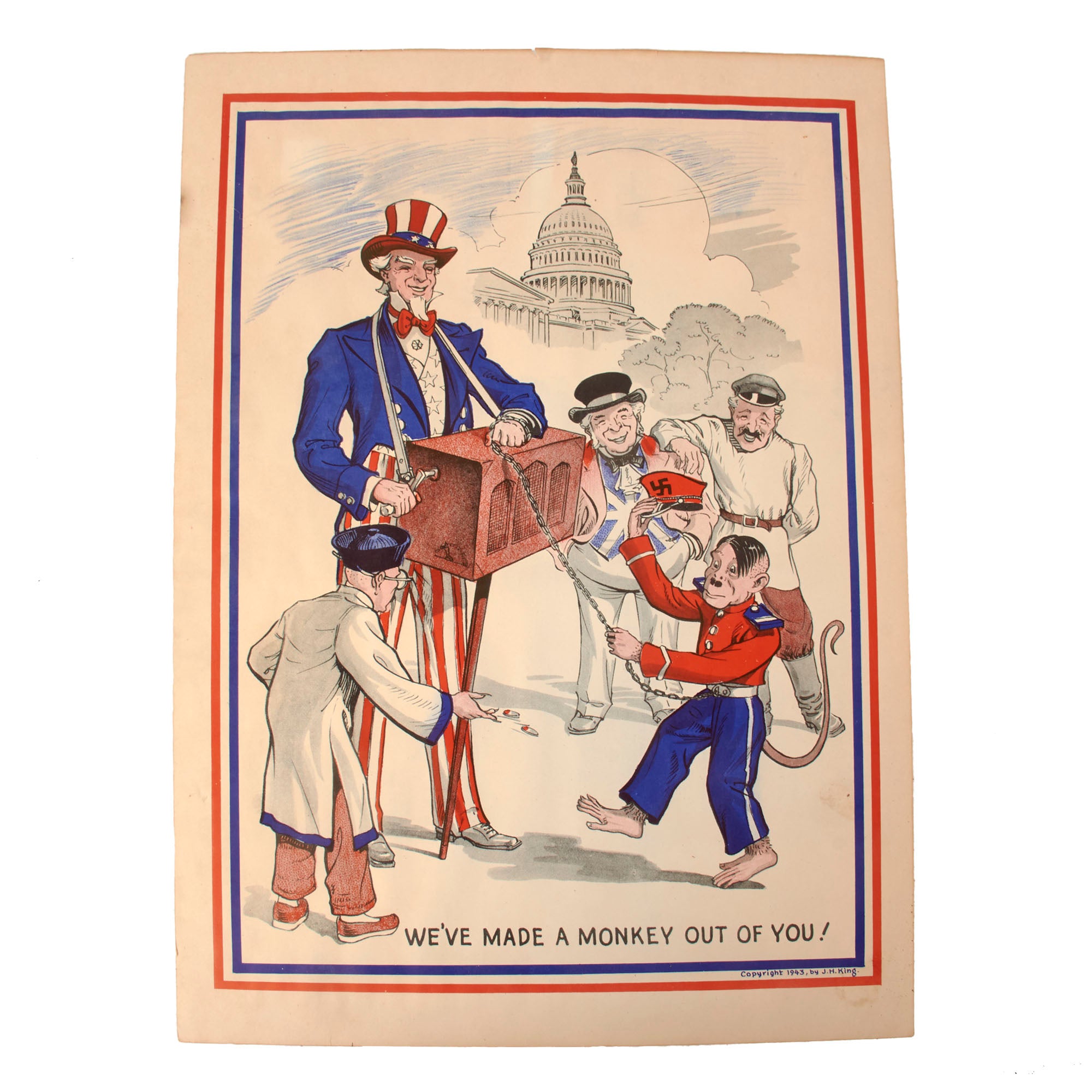 This World War II Propaganda poster features artwork by J. H. King (U.S. Government Printing Office, 1943). The masses greatly enjoyed this poster upon release, as it depicts Adolf H as a struggling organ grinder's monkey. John Bull, Joseph Stalin, and Chiang Kai-shek all stand amused, as Uncle Sam grinds the organ. The bottom of the poster has the caption “WE’VE MADE A MONKEY OUT OF YOU!”. A nice example with some heavy wear and holes from mounting near the top and bottom. Worthy of getting framed!
