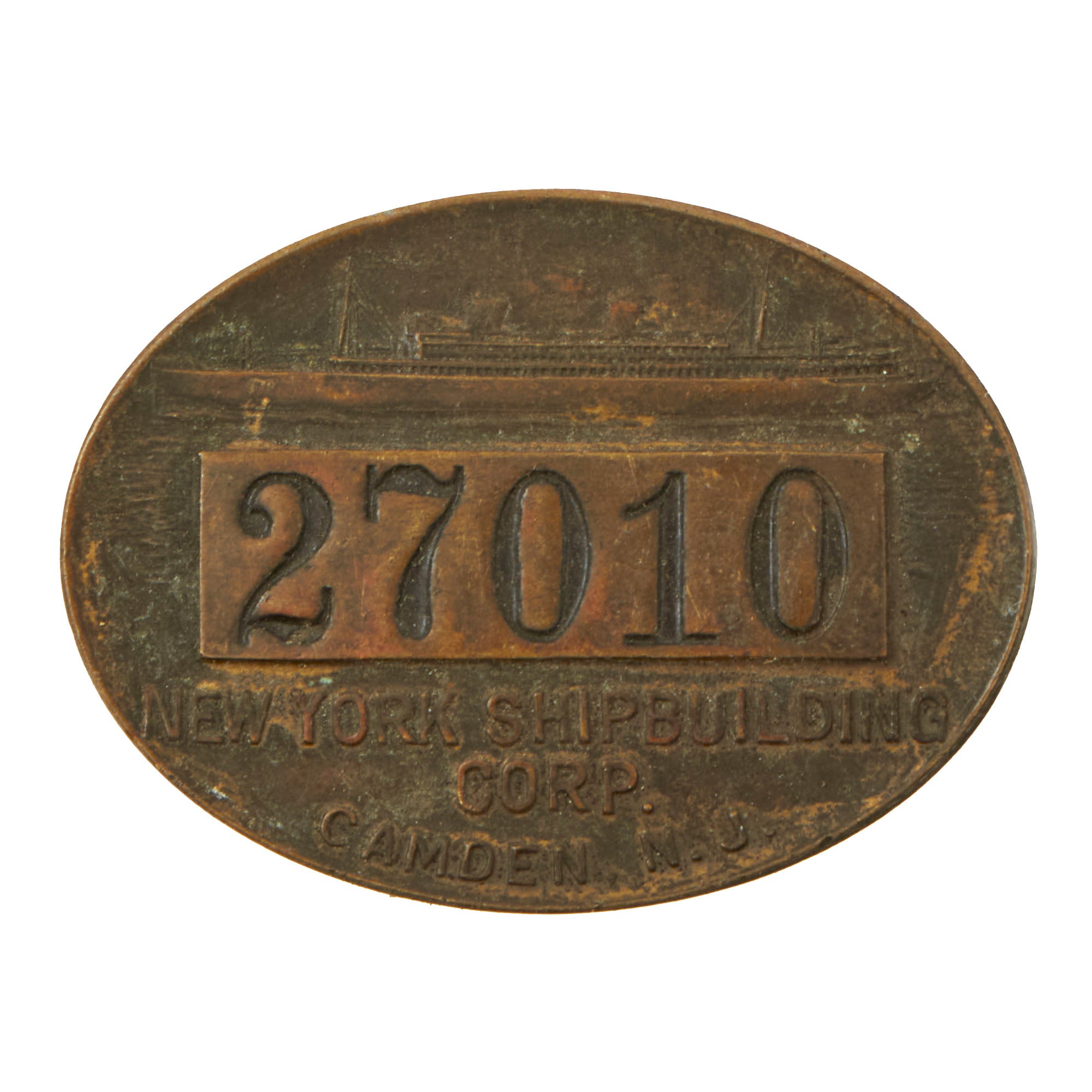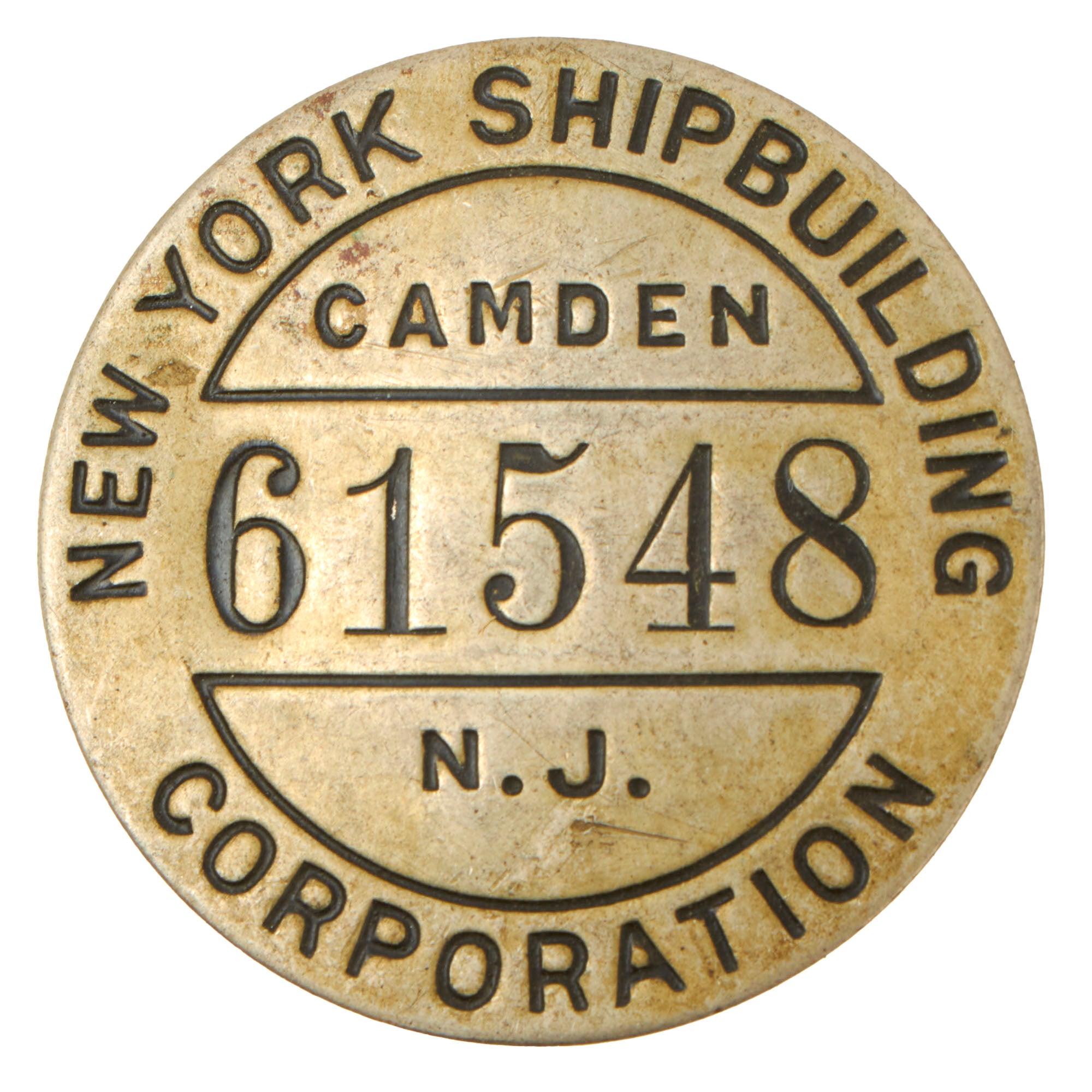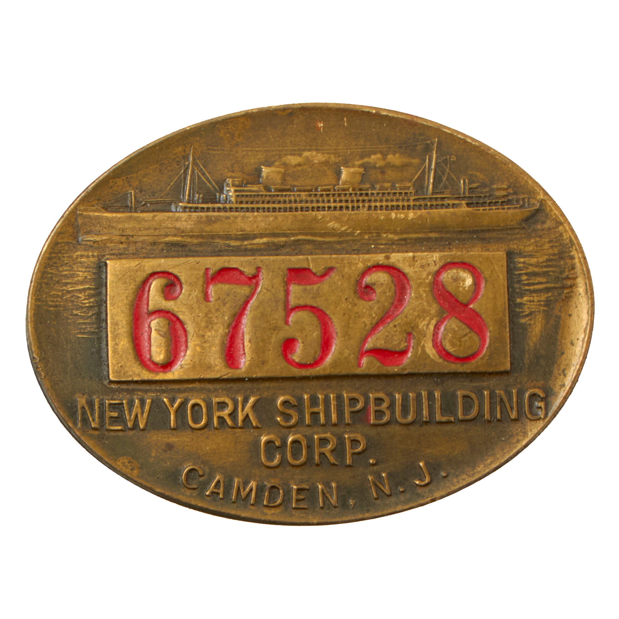 Original Items. Only One Lot Available. The New York Shipbuilding Corporation was an American shipbuilding company that operated from 1899 to 1968, ultimately completing more than 500 vessels for the U.S. Navy, the United States Merchant Marine, the United States Coast Guard, and other maritime concerns. At its peak during World War II, NYSB was the largest and most productive shipyard in the world. Its best-known vessels include the destroyer USS Reuben James (DD-245), the cruiser USS Indianapolis (CA-35), the aircraft carrier USS Kitty Hawk (CV-63), the nuclear-powered cargo ship NS Savannah, and a quartet of cargo-passenger liners nicknamed the 4 Aces.This is a lovely lot of three employee badges for employees of the New York Shipbuilding Corporation. Two are ovular and are numbered 27010 and 67528. These two measure 1⅝ x 1¼” and bear instructions on the back to return them if lost. The third is circular and numbered 61548. This one is 1½” in diameter. These are very difficult to find on their own, but this is a nice lot of three.Comes ready for further research and display!