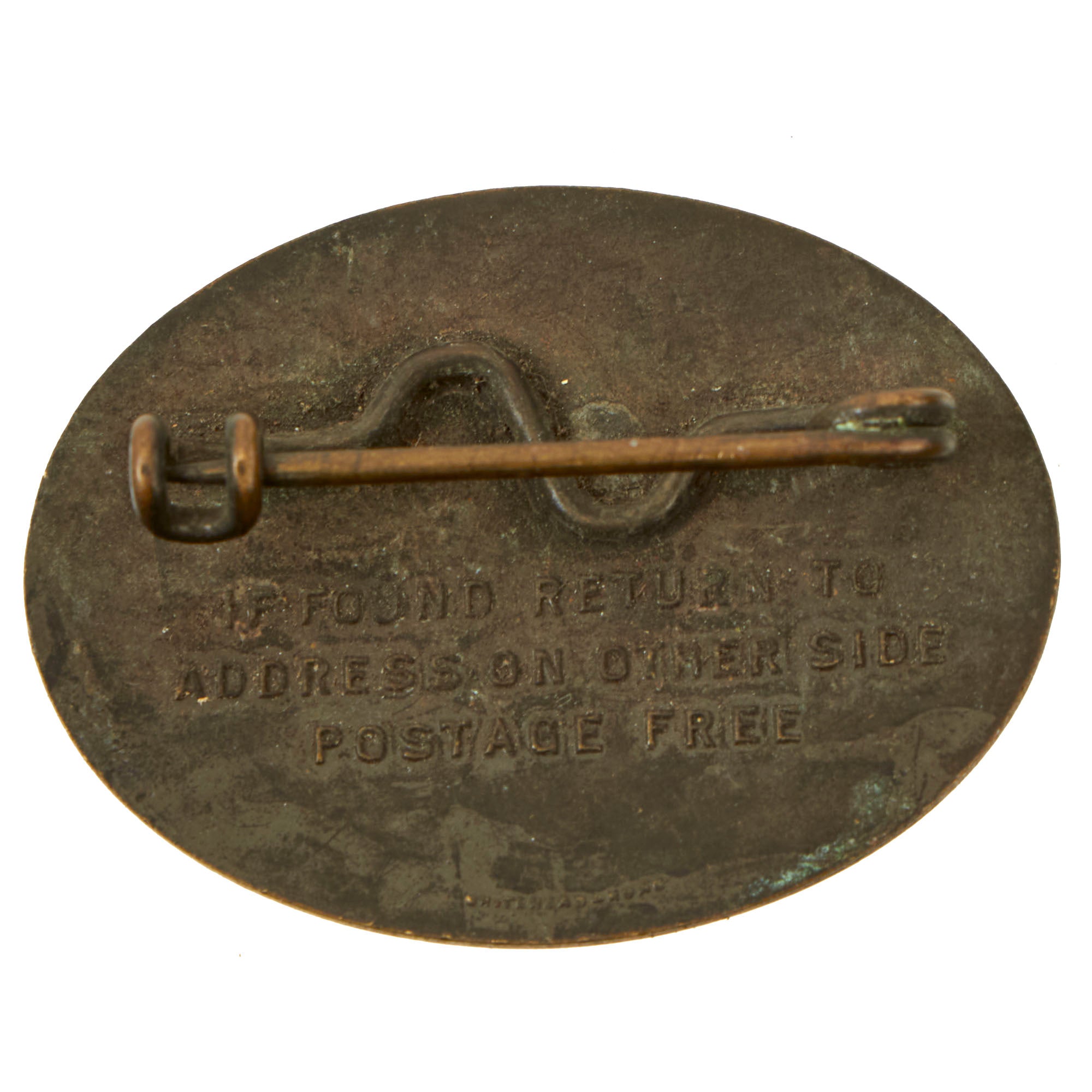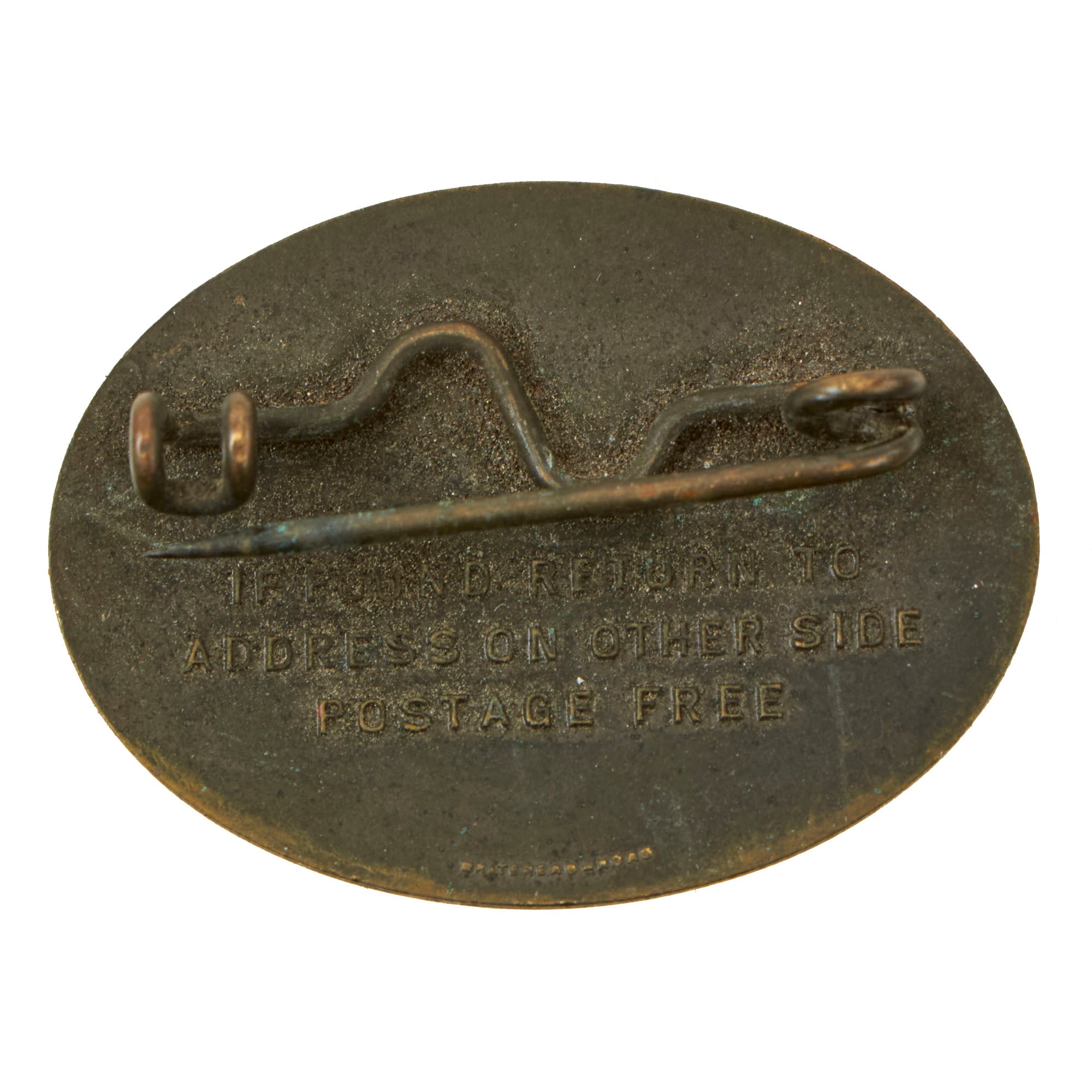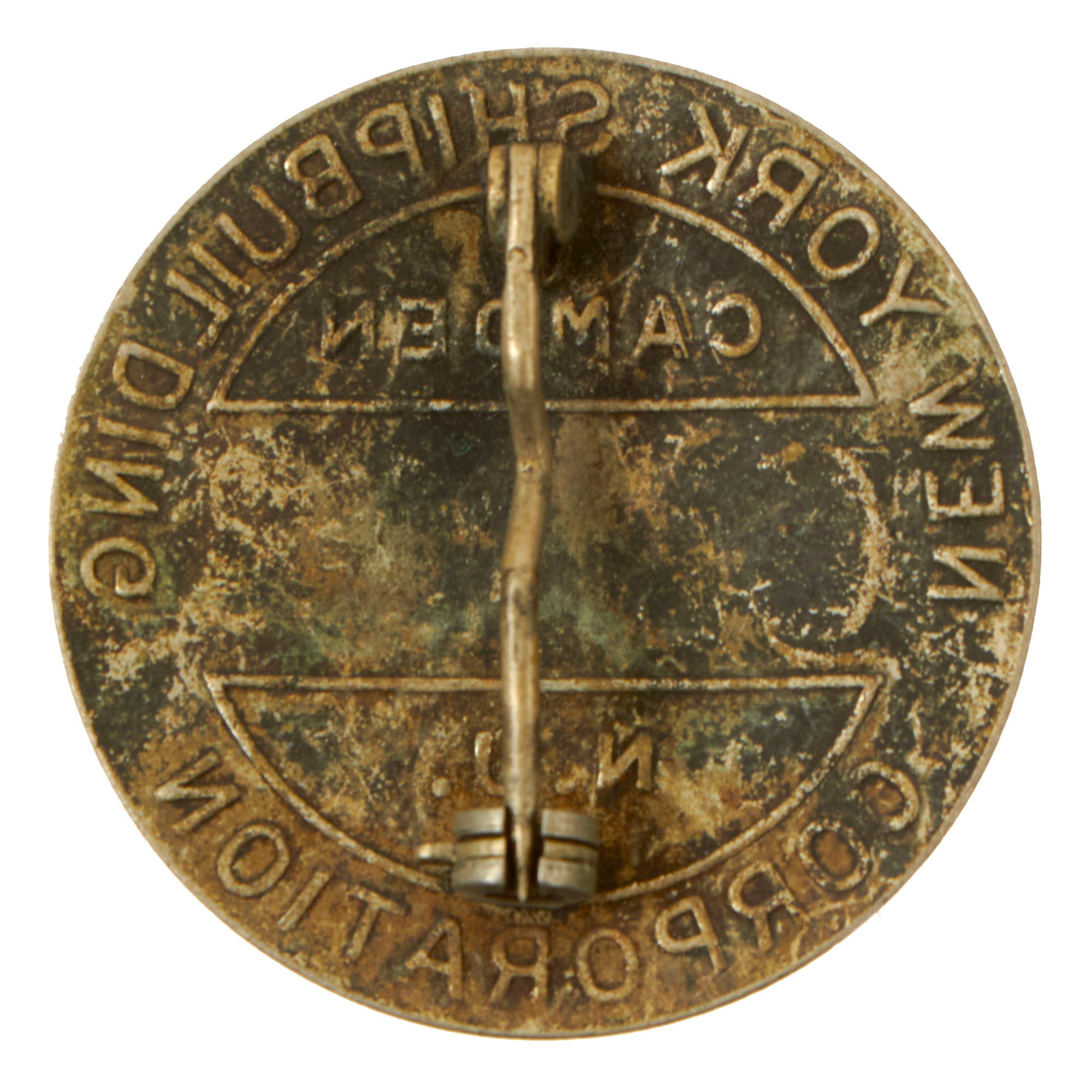Original Items. Only One Lot Available. The New York Shipbuilding Corporation was an American shipbuilding company that operated from 1899 to 1968, ultimately completing more than 500 vessels for the U.S. Navy, the United States Merchant Marine, the United States Coast Guard, and other maritime concerns. At its peak during World War II, NYSB was the largest and most productive shipyard in the world. Its best-known vessels include the destroyer USS Reuben James (DD-245), the cruiser USS Indianapolis (CA-35), the aircraft carrier USS Kitty Hawk (CV-63), the nuclear-powered cargo ship NS Savannah, and a quartet of cargo-passenger liners nicknamed the 4 Aces.This is a lovely lot of three employee badges for employees of the New York Shipbuilding Corporation. Two are ovular and are numbered 27010 and 67528. These two measure 1⅝ x 1¼” and bear instructions on the back to return them if lost. The third is circular and numbered 61548. This one is 1½” in diameter. These are very difficult to find on their own, but this is a nice lot of three.Comes ready for further research and display!