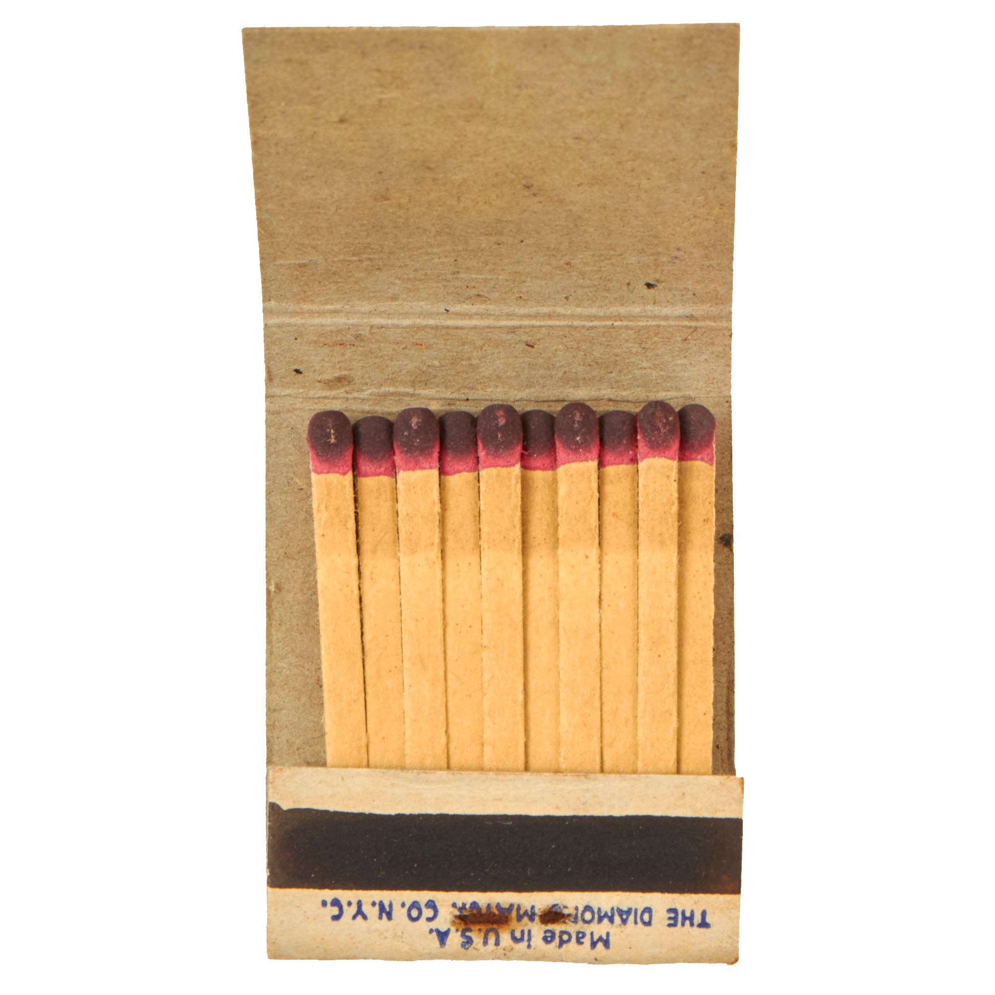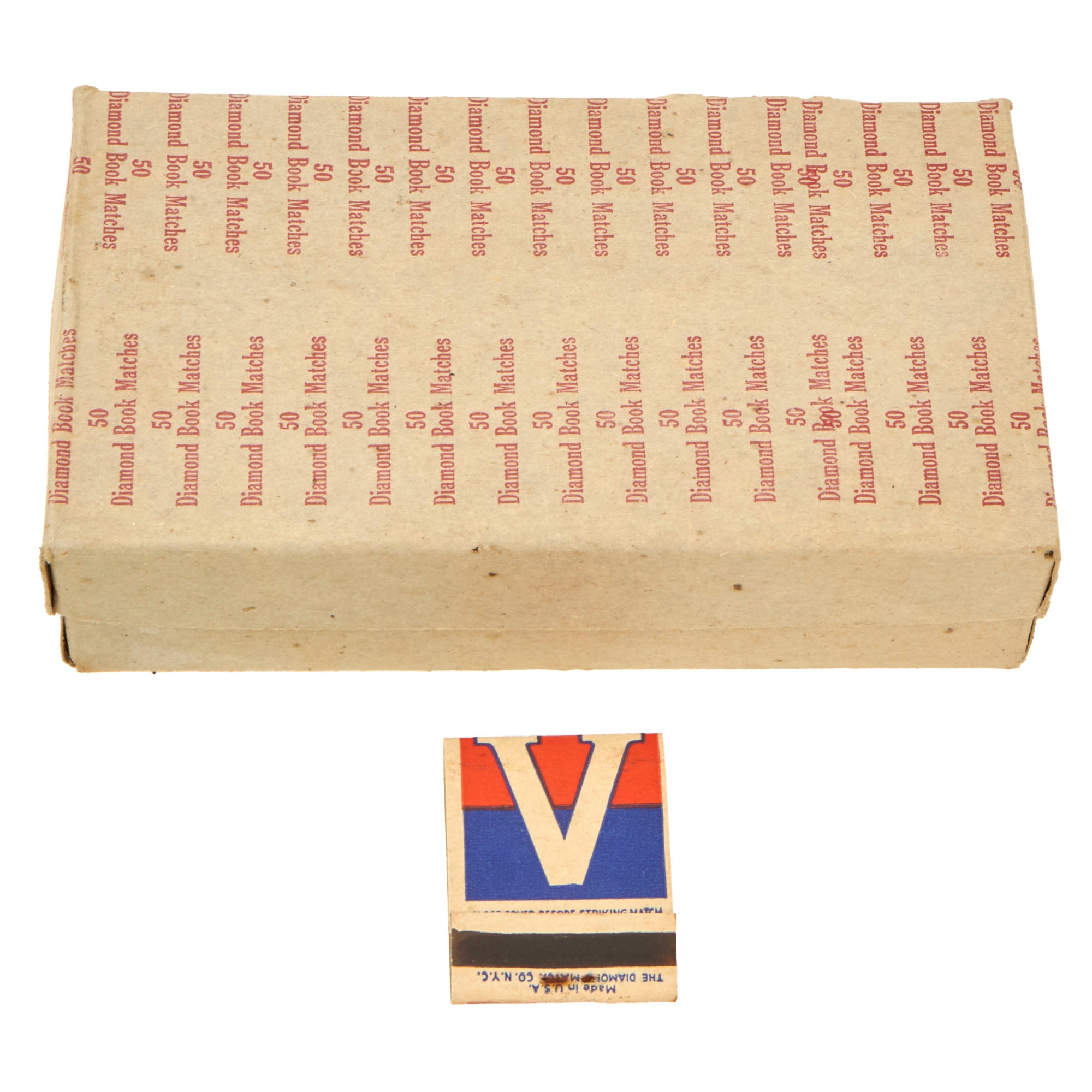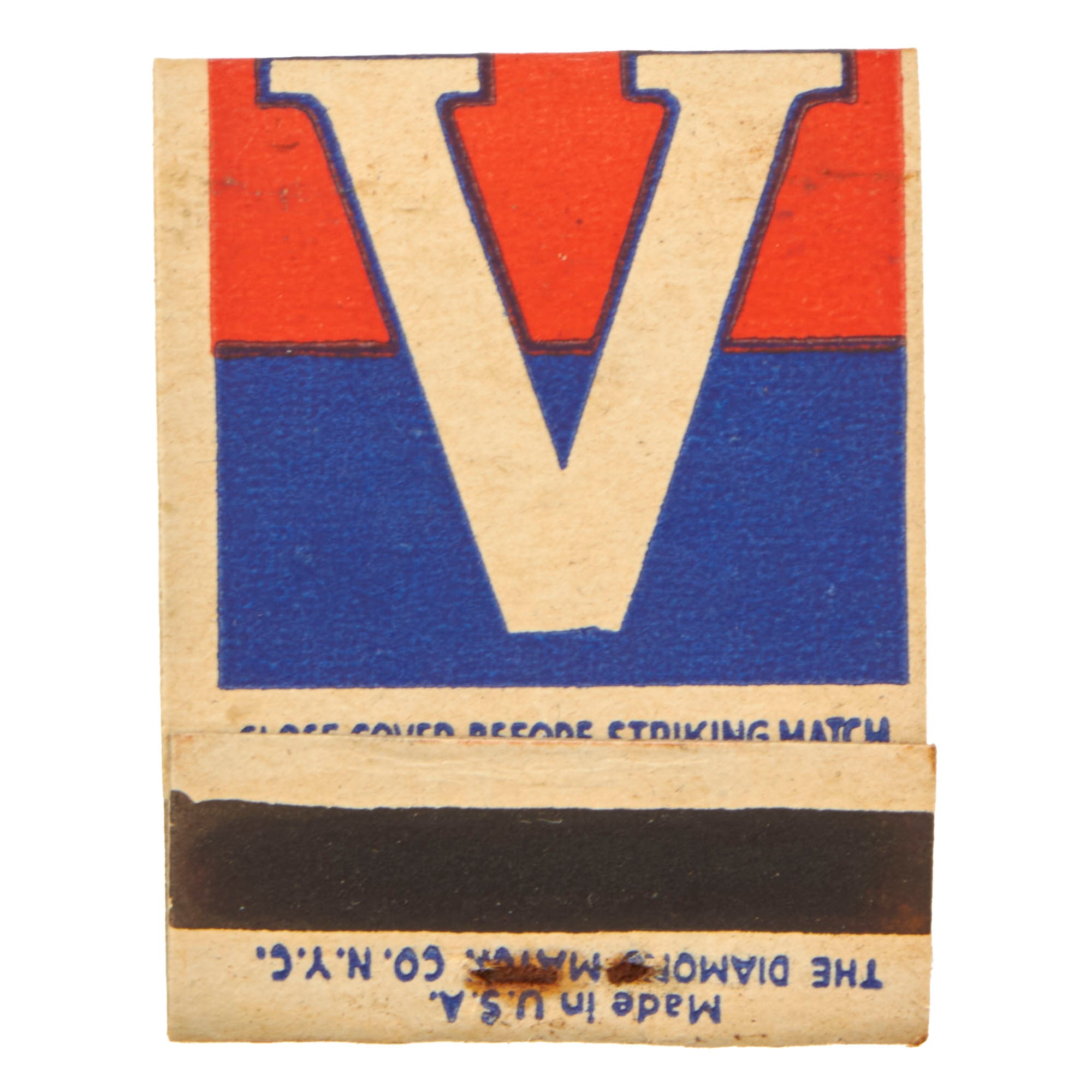 The matchbooks display a white V with a red and blue background on one side, and a Continental soldier statue with the caption FOR VICTORY BUY UNITED STATES WAR SAVINGS BONDS AND STAMPS on the other side. The bottom reads MADE IN U.S.A. THE DIAMOND MATCH CO. N.Y.C.. A great piece of ephemera that will add some color and flair to your collection. Some packs may be missing one or two matches, but most all are complete, you will receive one as shown. Get one before they’re all gone! Comes ready for further research and display!
