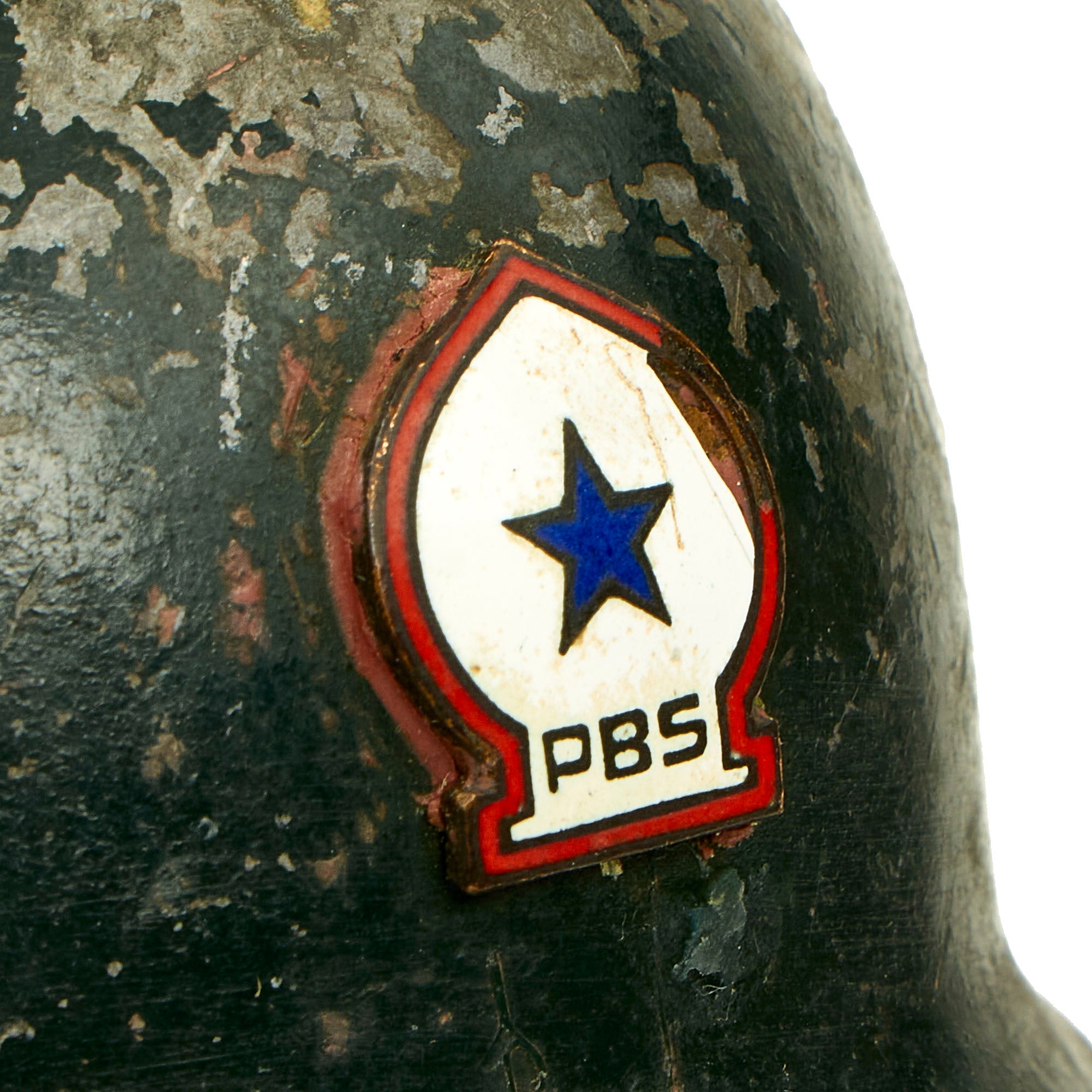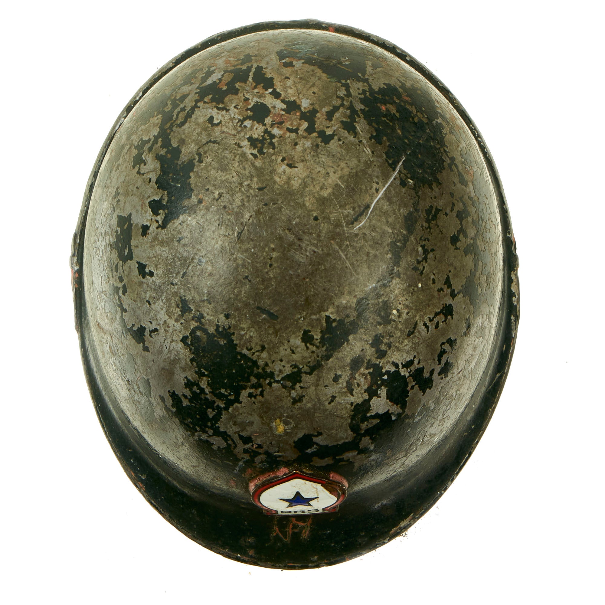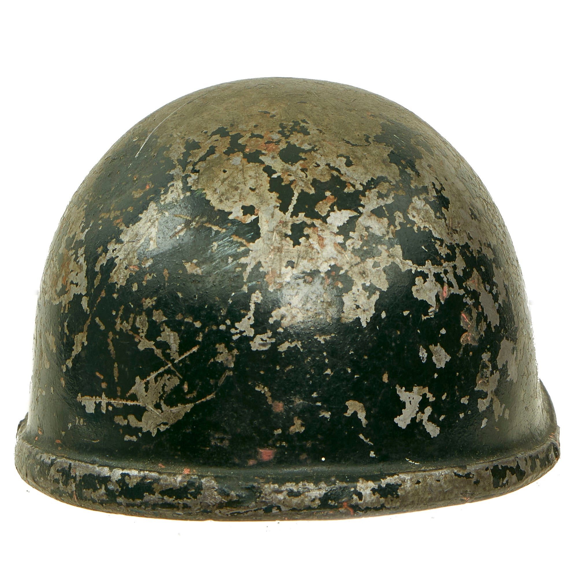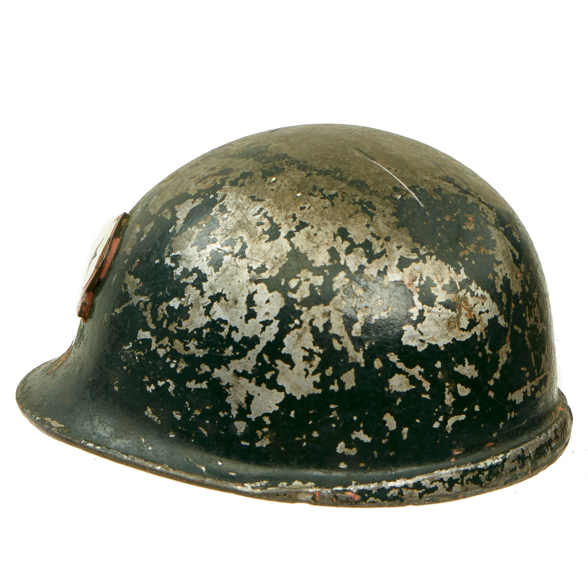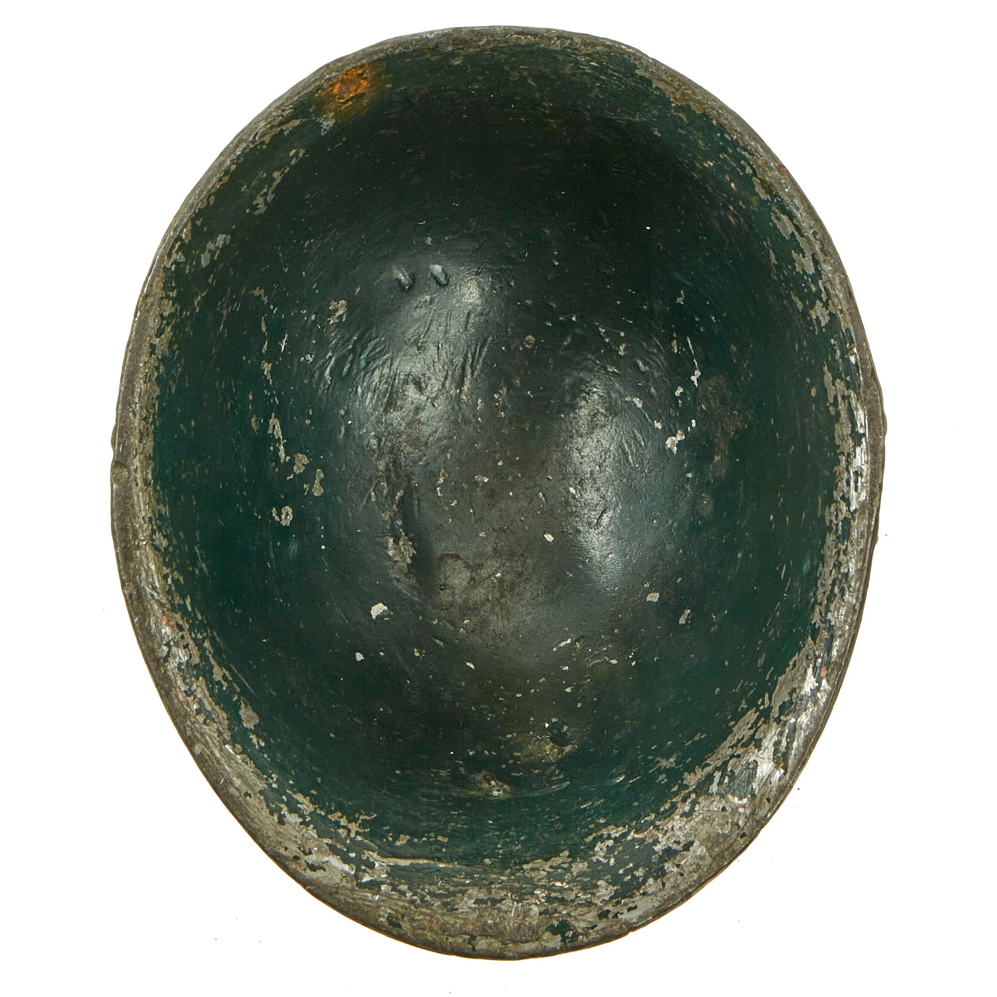 This M1 helmet was produced in Italy was amongst many other examples that were produced as souvenir paperweights. Each measured approximately 3 inches and was constructed of lead. The craftsman tried to follow closely to the design of the M1 helmet and even included a canvas chinstrap attached to the rear of the helmet which is unfortunately not present on this example. This helmet has the North Africa Command enameled insignia on the front with the letters PBS for Peninsular Base Section and is painted a dark green. The paint on the helmet is retained quite well though there are areas of loss. The enameled insignia does have a small section missing but is otherwise in lovely condition.
