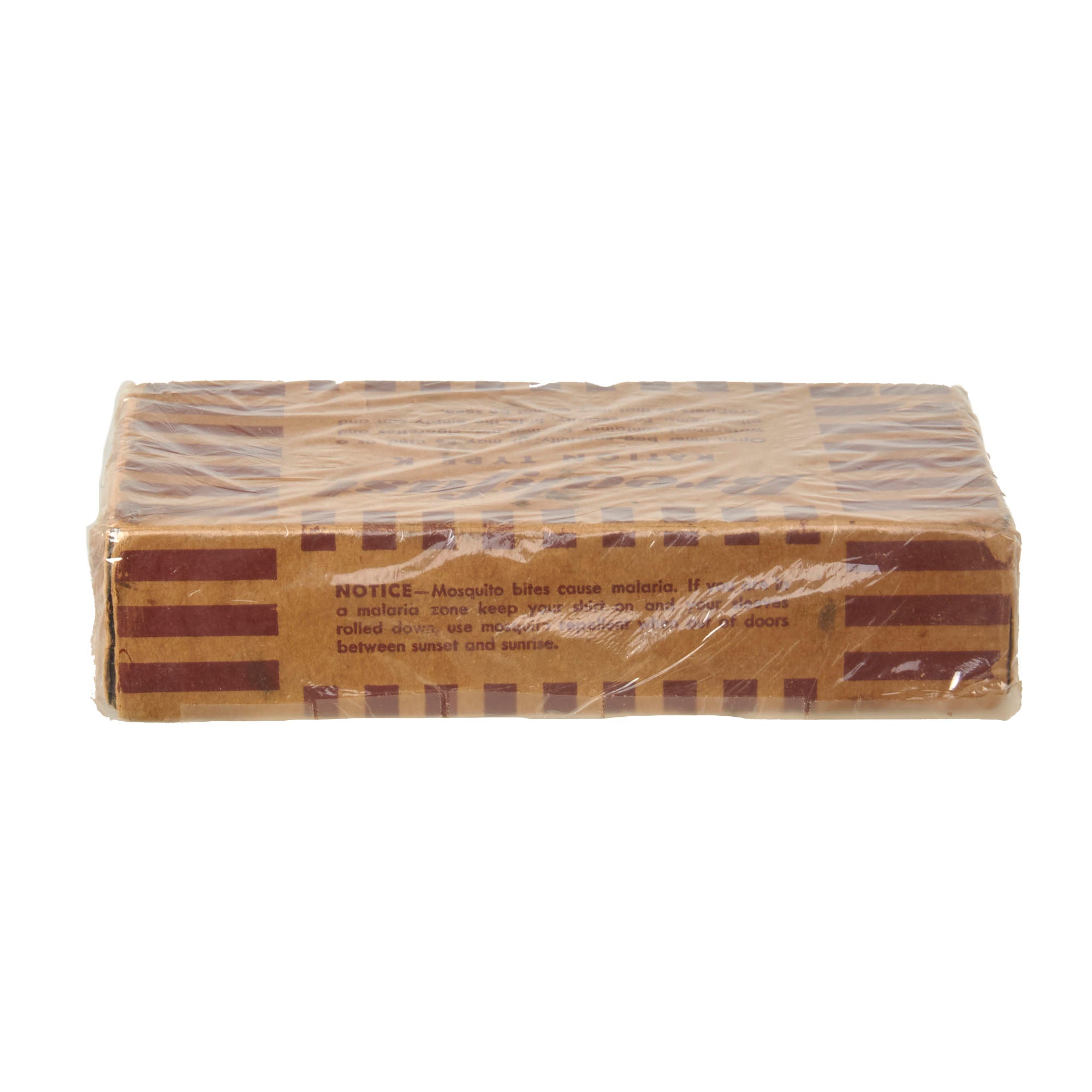 This is a very nice unissued BREAKFAST unit by Patten Food Products of Chicago, Illinois. It is the later war "Morale Series", with the maroon design on the exterior. The previous owner wrapped it in plastic and taped it shut to keep it sealed, so we can not check to confirm its contents. One side shows to have been opened at one point, but we believe all contents should still be retained inside. There is a sticker from the previous owner reading COMPLETE UNOPENED 1944 indicating that it is a complete set despite there being some missing cardboard.