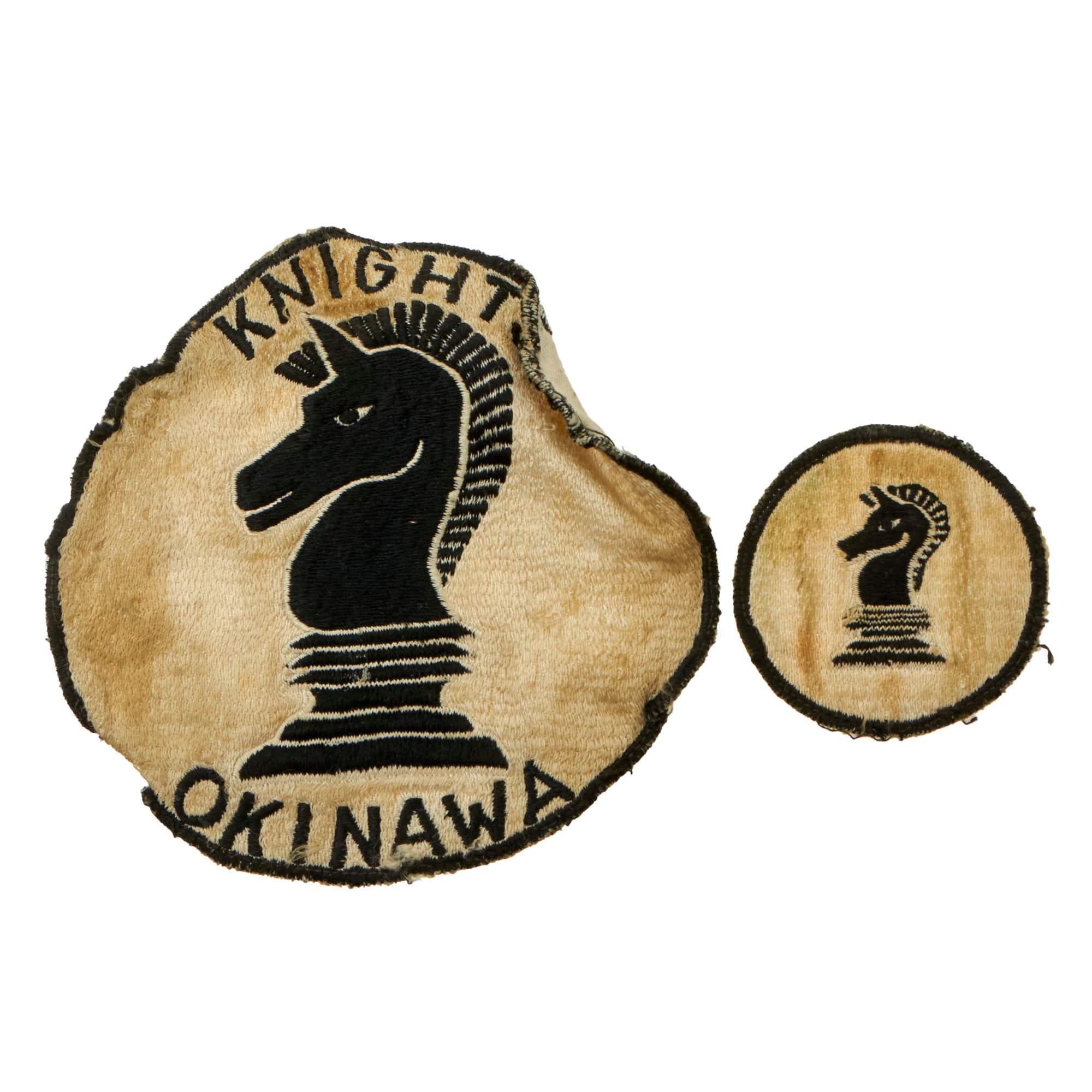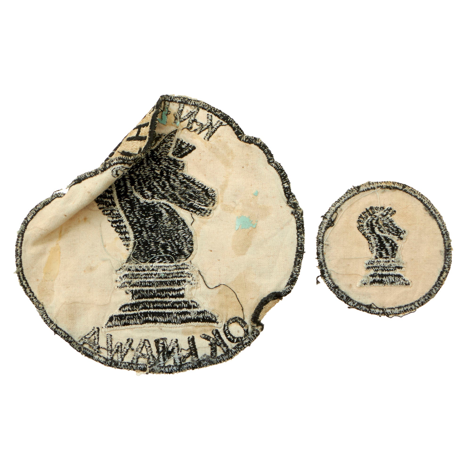 Original Items. Only One Lot Available. This is an interesting set of ephemera belonging to a Navy sailor who served during World War II. The central piece of the group is a large 5⅝” patch with a chess Knight piece and KNIGHTS OKINAWA under and over. We are unsure what this patch represents, but it’s a good research project.