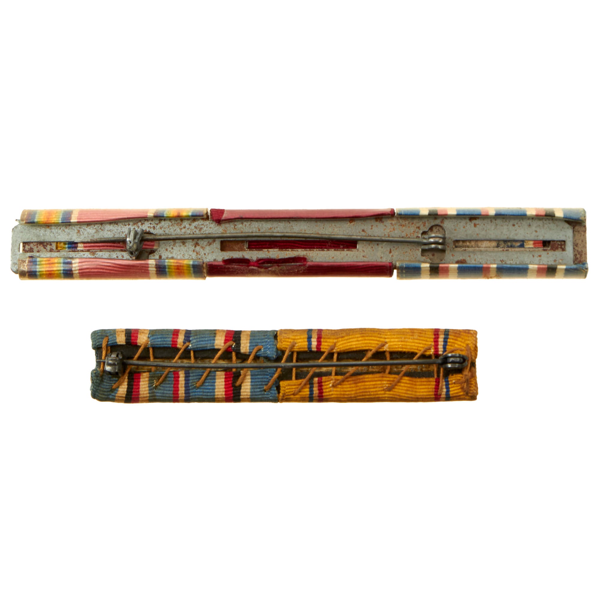 - 2 ribbon bars with 5 ribbons total. 2 American campaign, 1 WWII victory, 1 American Defense, and 1 Navy Good Conduct.