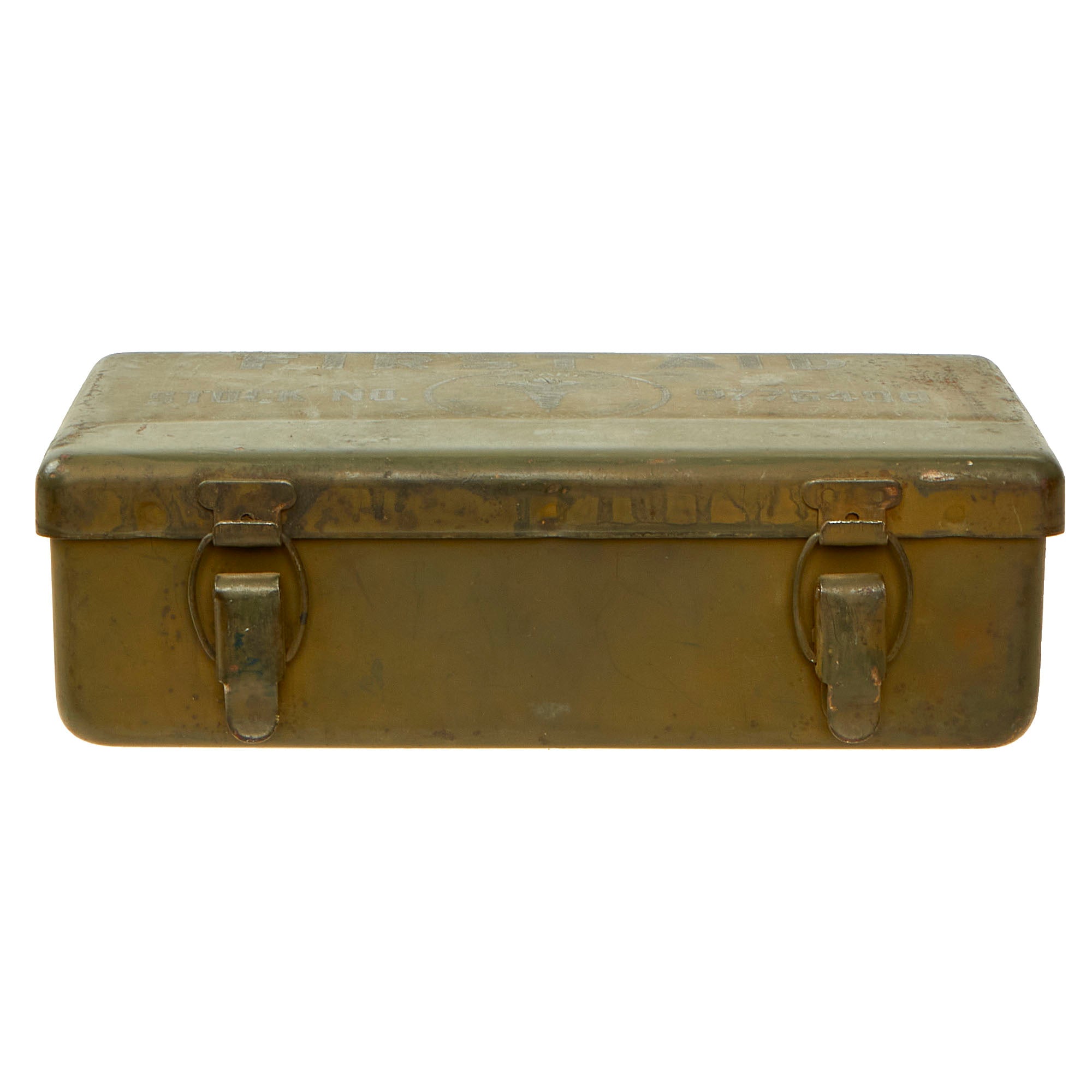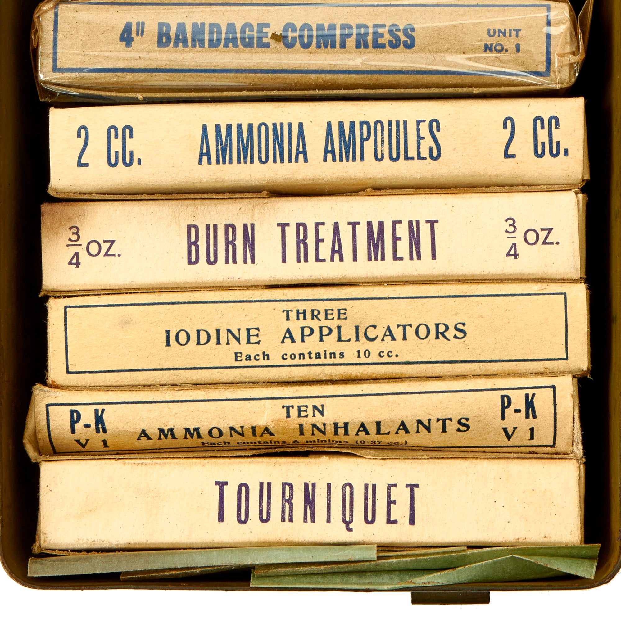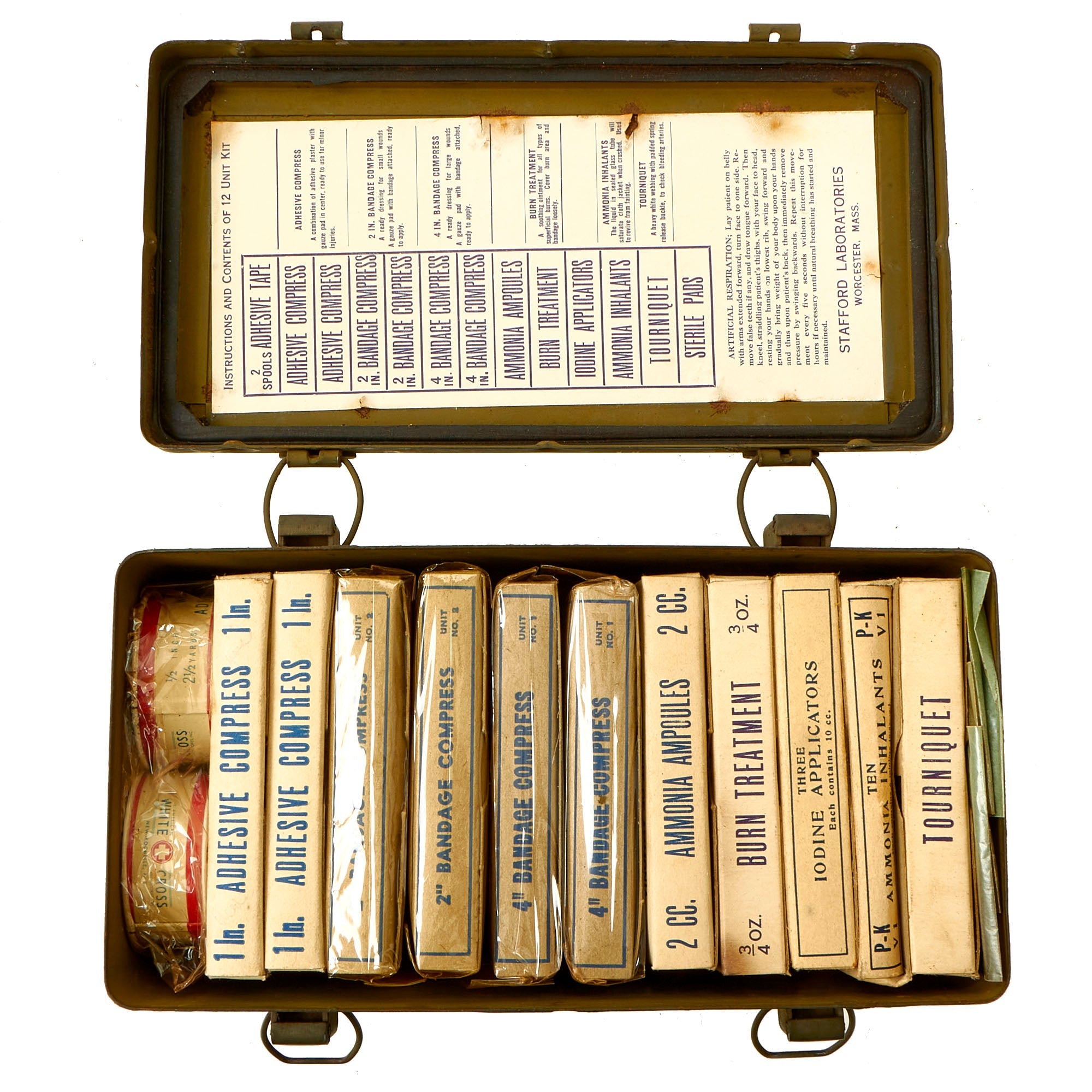 Original Item: Only One Available. This is a spectacular first aid kit which was repurposed from being a gas casualties kit to a “12 Unit Kit”. This was not an uncommon occurrence, especially with the quick entry into the Korean War. As modern warfare drifted further away from mass gas attacks on the battlefield, the casualty kits for gas attacks were often repurposed on an “as needed” basis. The bottom portion of the kit has a visible change in color which covered up the FOR GAS CASUALTIES ONLY marking.