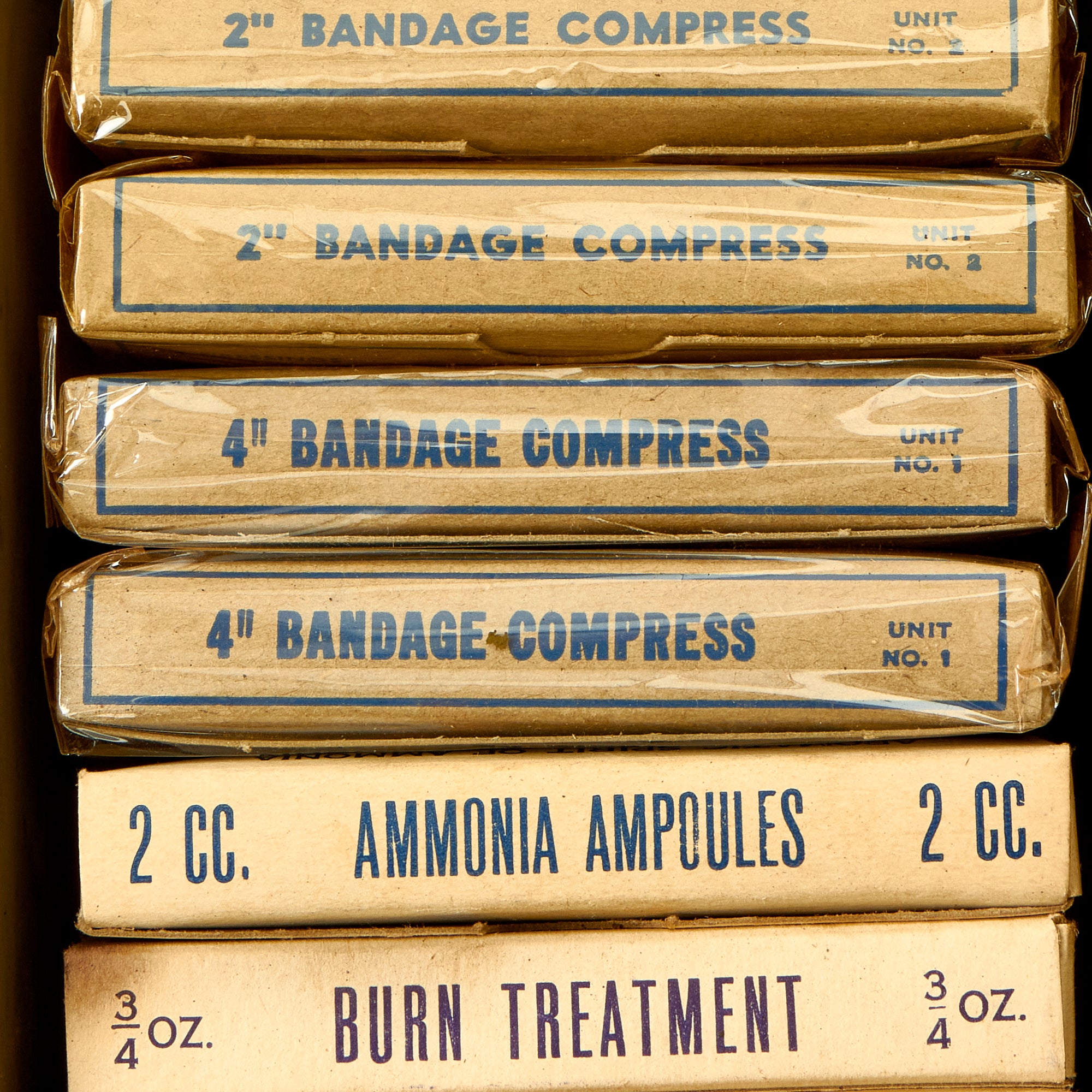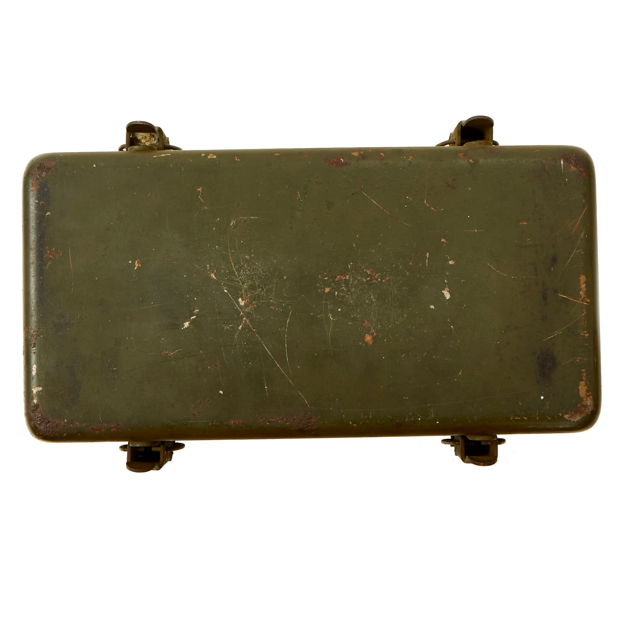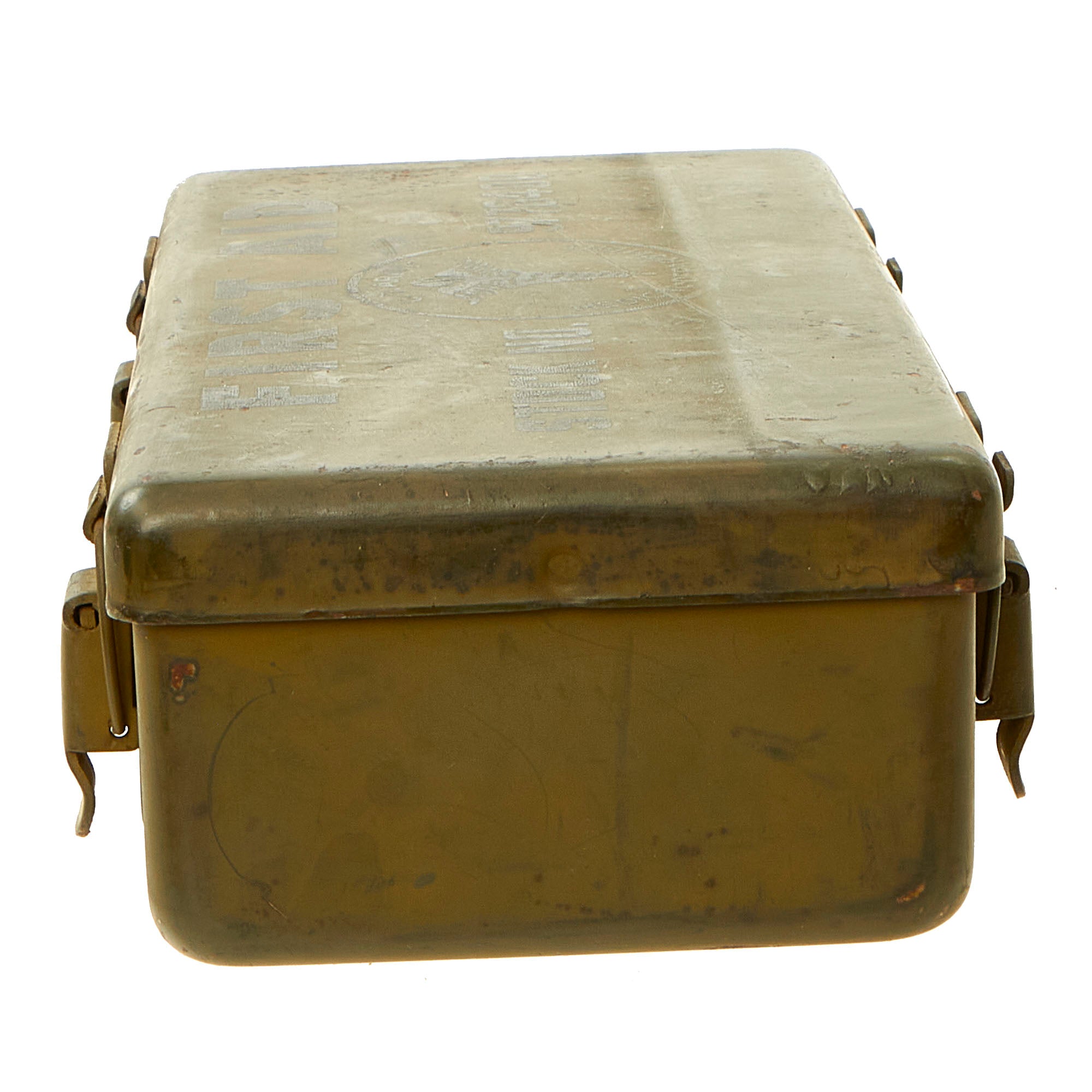 Original Item: Only One Available. This is a spectacular first aid kit which was repurposed from being a gas casualties kit to a “12 Unit Kit”. This was not an uncommon occurrence, especially with the quick entry into the Korean War. As modern warfare drifted further away from mass gas attacks on the battlefield, the casualty kits for gas attacks were often repurposed on an “as needed” basis. The bottom portion of the kit has a visible change in color which covered up the FOR GAS CASUALTIES ONLY marking.