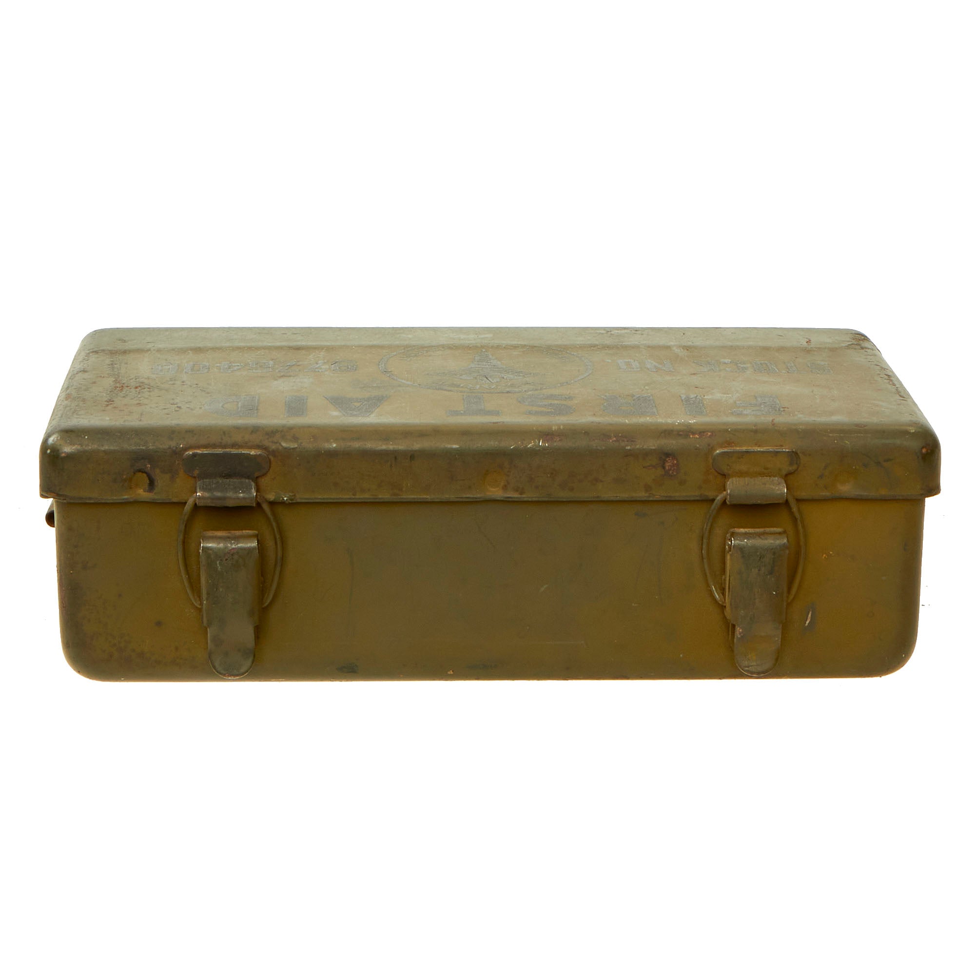 The transportable metal container (Item # 9777300) which is 9776400 on this example, was usually stashed away in a holding bracket, centrally located under the vehicle’s dashboard (1/4-Ton Truck, aka Jeep). This rectangular shaped container was provided with a single carrying handle and closed with 2 sets of two clips. Its cover held a paper contents list, glued underneath the lid, illustrating where each unit should be placed in the container, as well as some directions and recommendations related to First-Aid treatment. The complete Kit’s Item No. changed from 97773 (between mid-1943 and early 1944) to 9777300 (after 1 March 1944). It once again changed in 1947, following the standardization of both Army and Navy Stock Numbers, to Stock No. 9-221-200 (Army-Navy Catalog of Medical Materiel – 1 July 1947) and further kept the same number in 1949 (Armed Services Catalog of Medical Materiel, 1 July 1949). Stock No. 9-221-200 was gradually phased out during the 1950s, and replaced by First Aid Kit, General Purpose, 12 Unit, now identified as FSN 6545-922-1200 (FSN: Federal Stock Number).