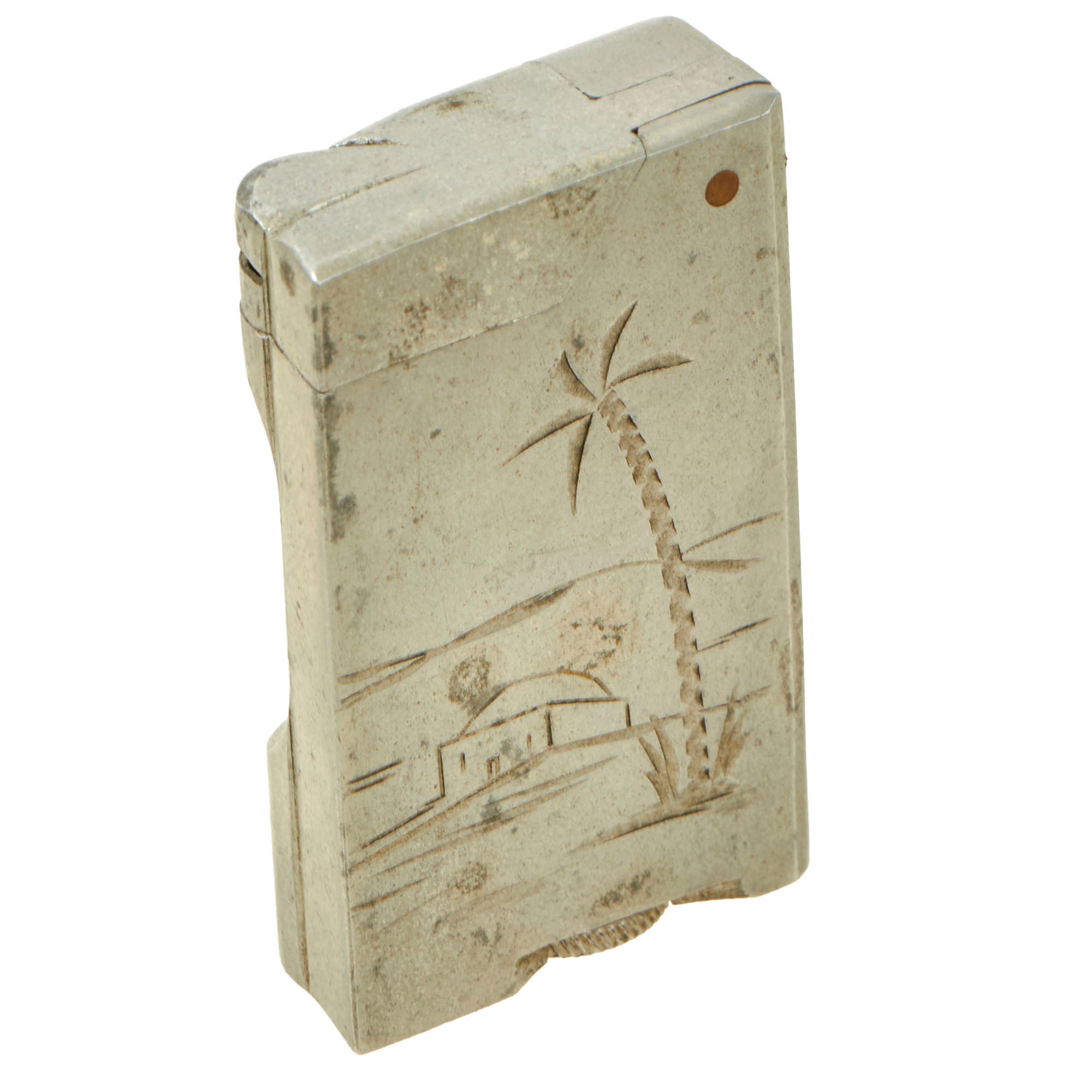 - Small aluminum lighter with a depiction of a house and palm tree in a desert, denoting North African service. The back is engraved I / S and there is a 4 stamped on the bottom. This lighter came with a note stating that it was made in North Afrika from aircraft aluminum.
