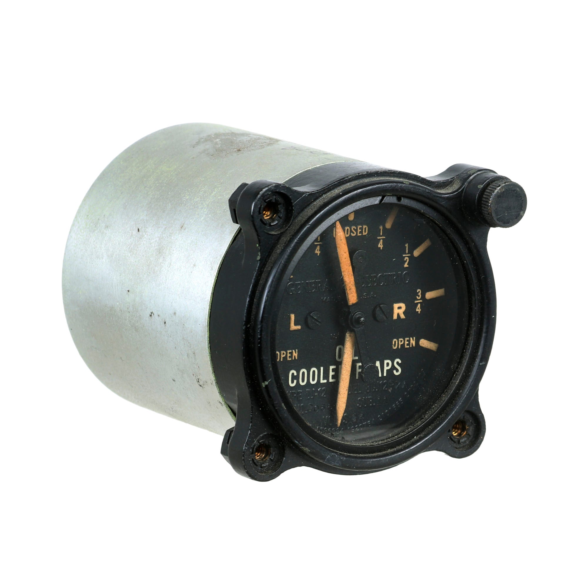 This is a really tremendous gauge which tracks the position of the cooler flaps aboard a Lockheed P-38 Lightening. There are markings on the face for manufacture by General Electric, along with data about its make. It is a Type DJ-12 Model 8DJ12PXA. It measures 3¼ x 2¼ x 2½”. A very nice piece, ready for further research and display.