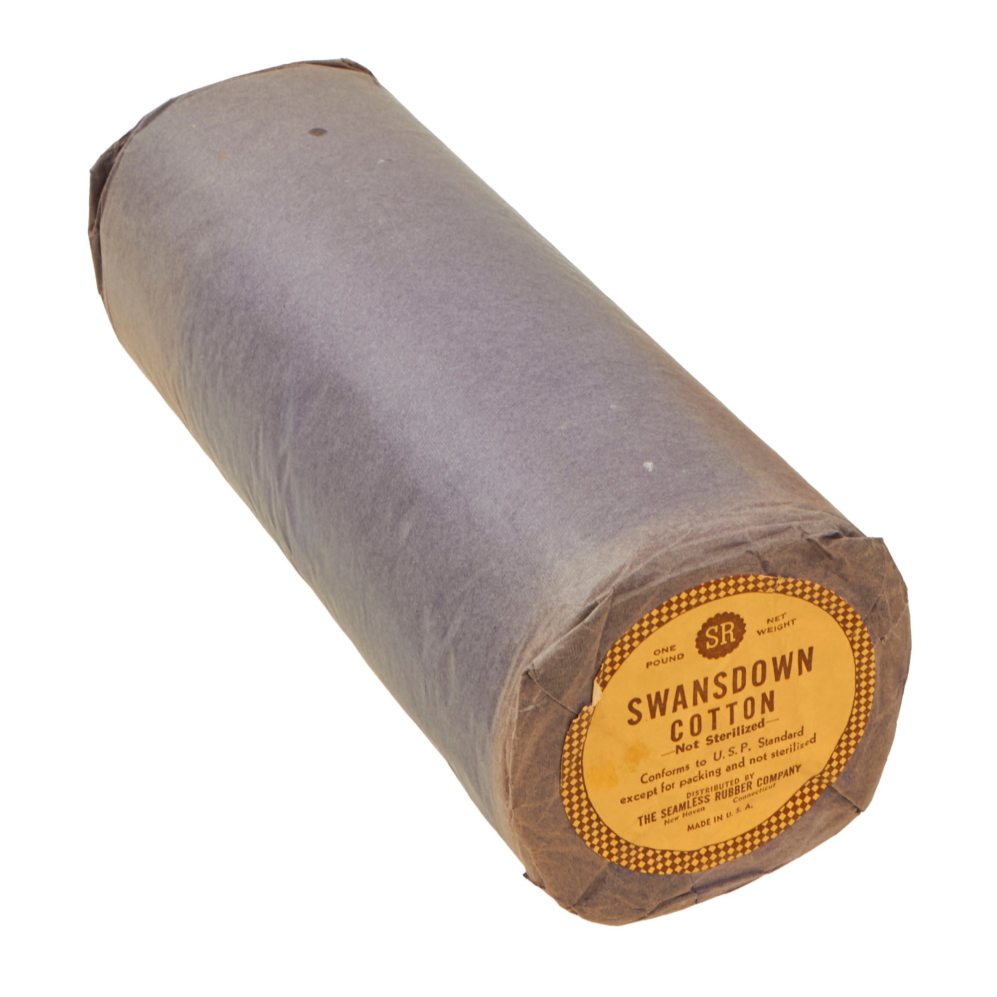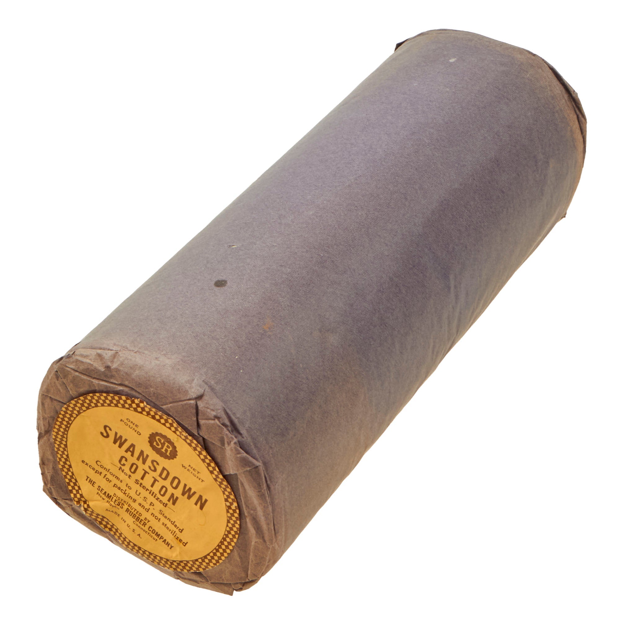 - Large 12” long and 4½” diameter sealed roll of Swansdown cotton, one pound net weight. By the Seamless Rubber company.