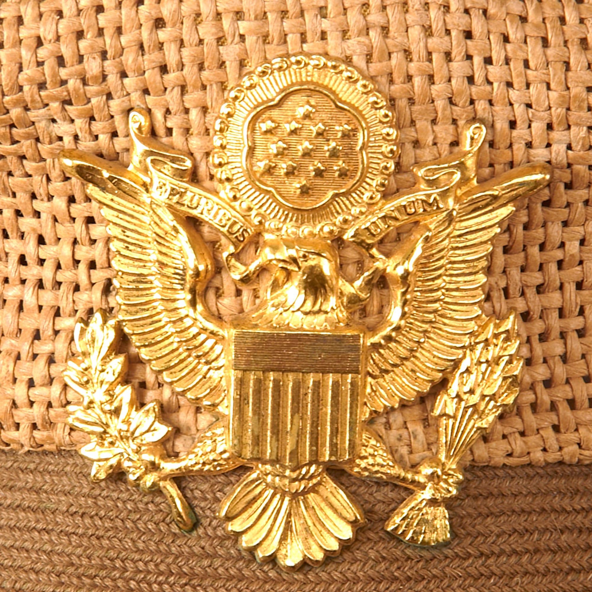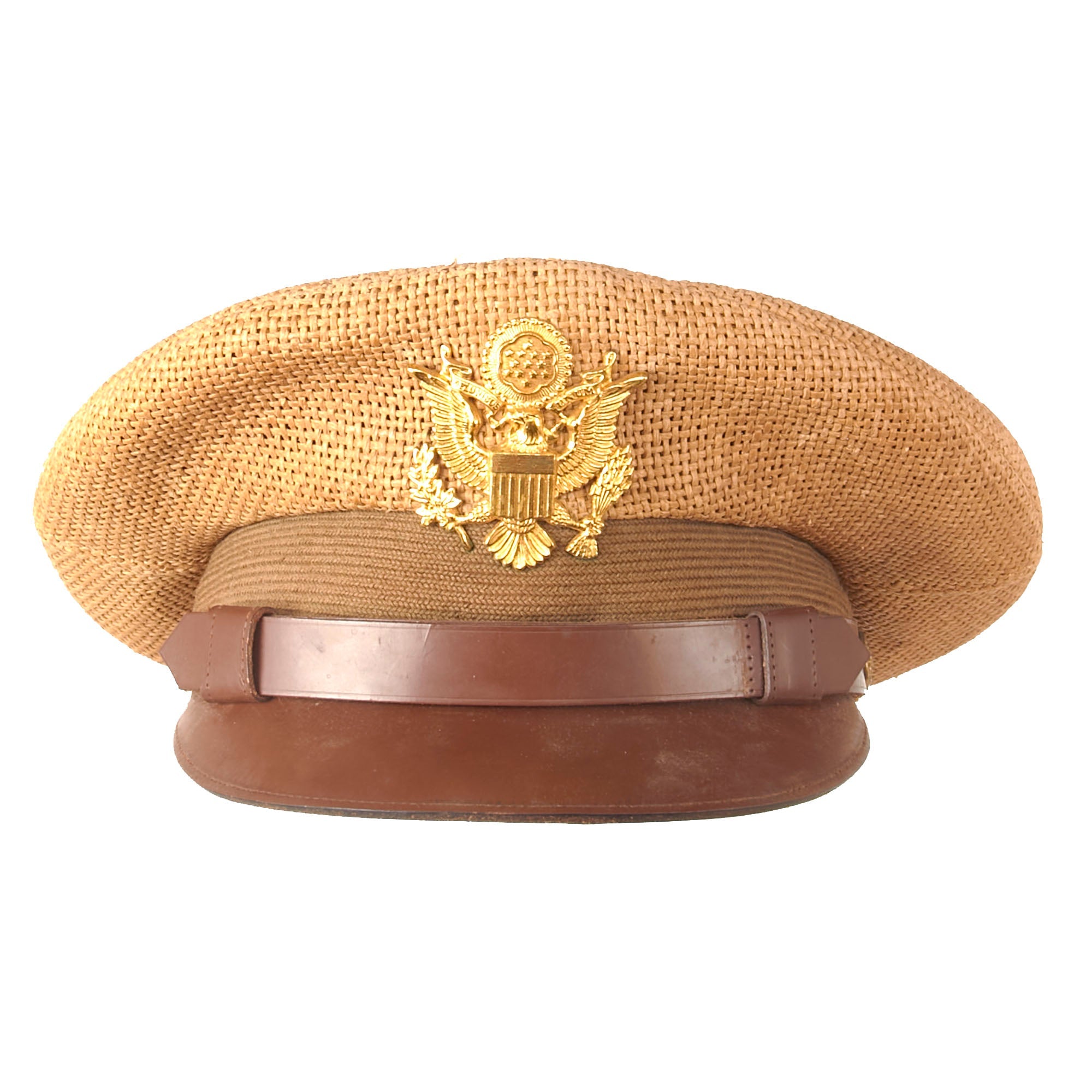 The cap features wicker frame construction and a leather sweatband which is supple and complete, although it is mostly detached from the cap. This peaked cap features a gold tone WWII Army Overseas insignia over a leather visor with a leather chinstrap seated upon it. The cap is not size marked, but is likely a size 7, and was most likely bespoke, so there is no maker marking.