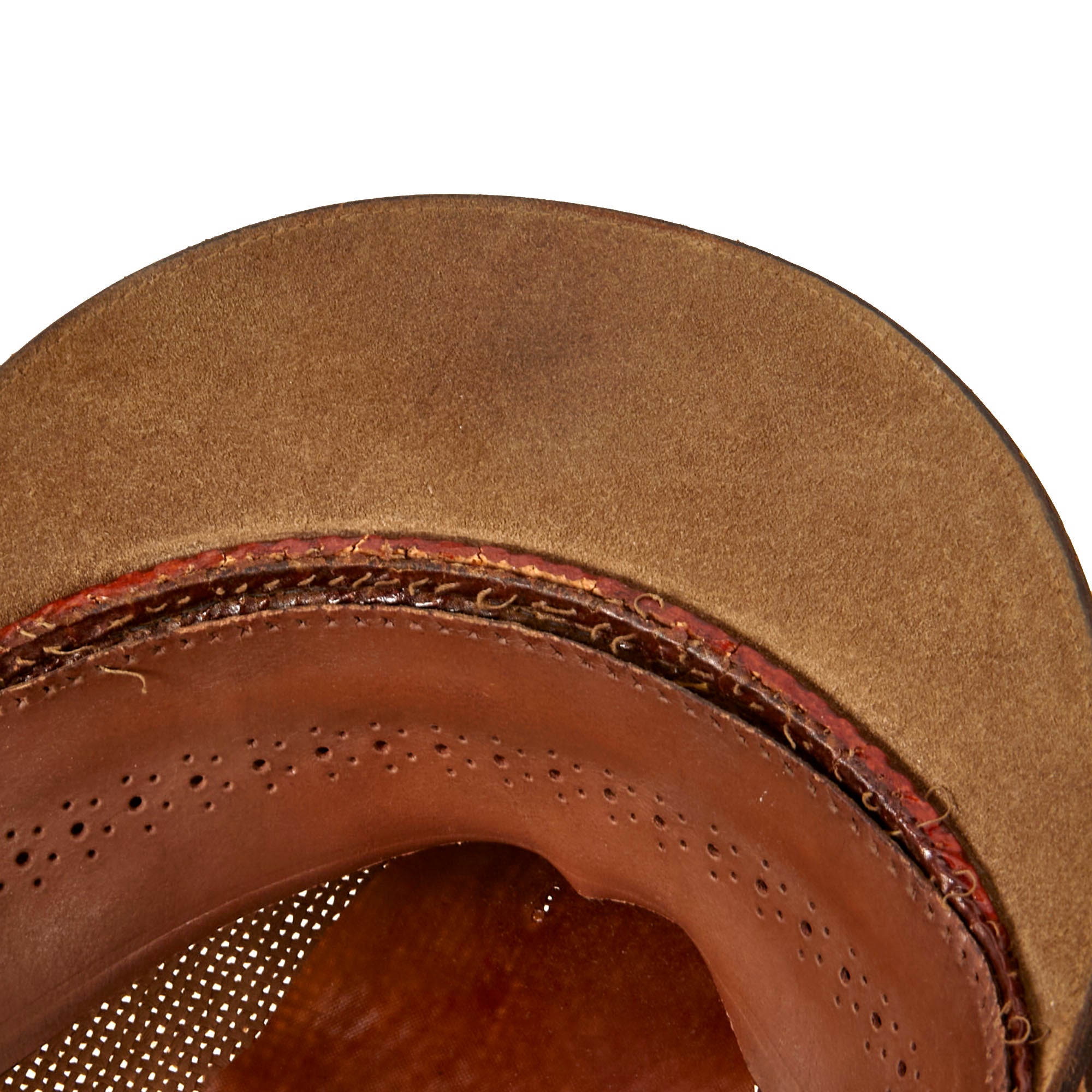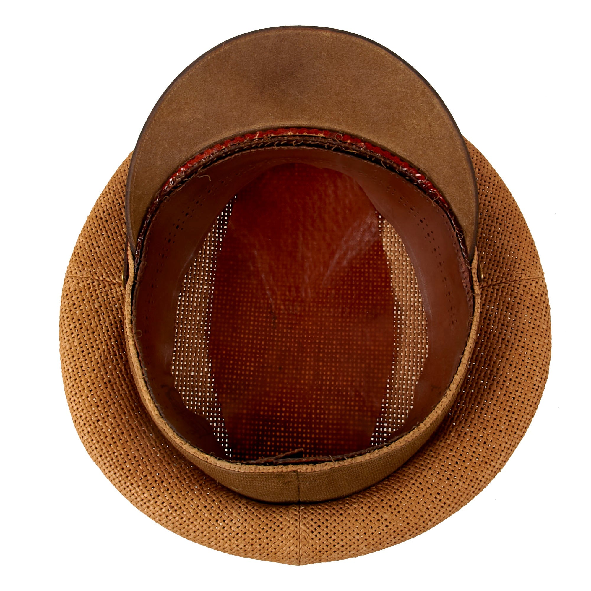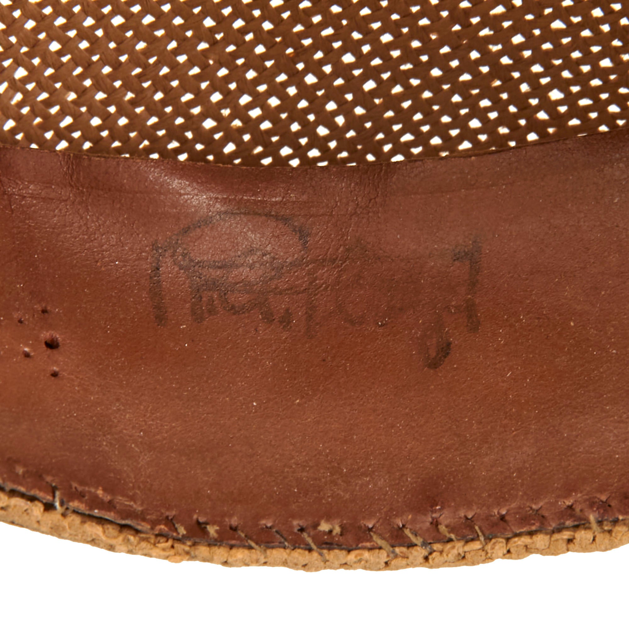 Original Item. One-of-a-Kind. This is a fantastically unique piece of headgear, a WWII Officer’s visor cap with a theater-made wicker crown & body, with an OD Green hat band on top of the wicker. This is one of the most interesting visors we have ever seen. There is a name stamped onto the sweatband multiple times with a small name card that corresponds, reading CAPT. R.A. FLOYD. This makes for a great research project.