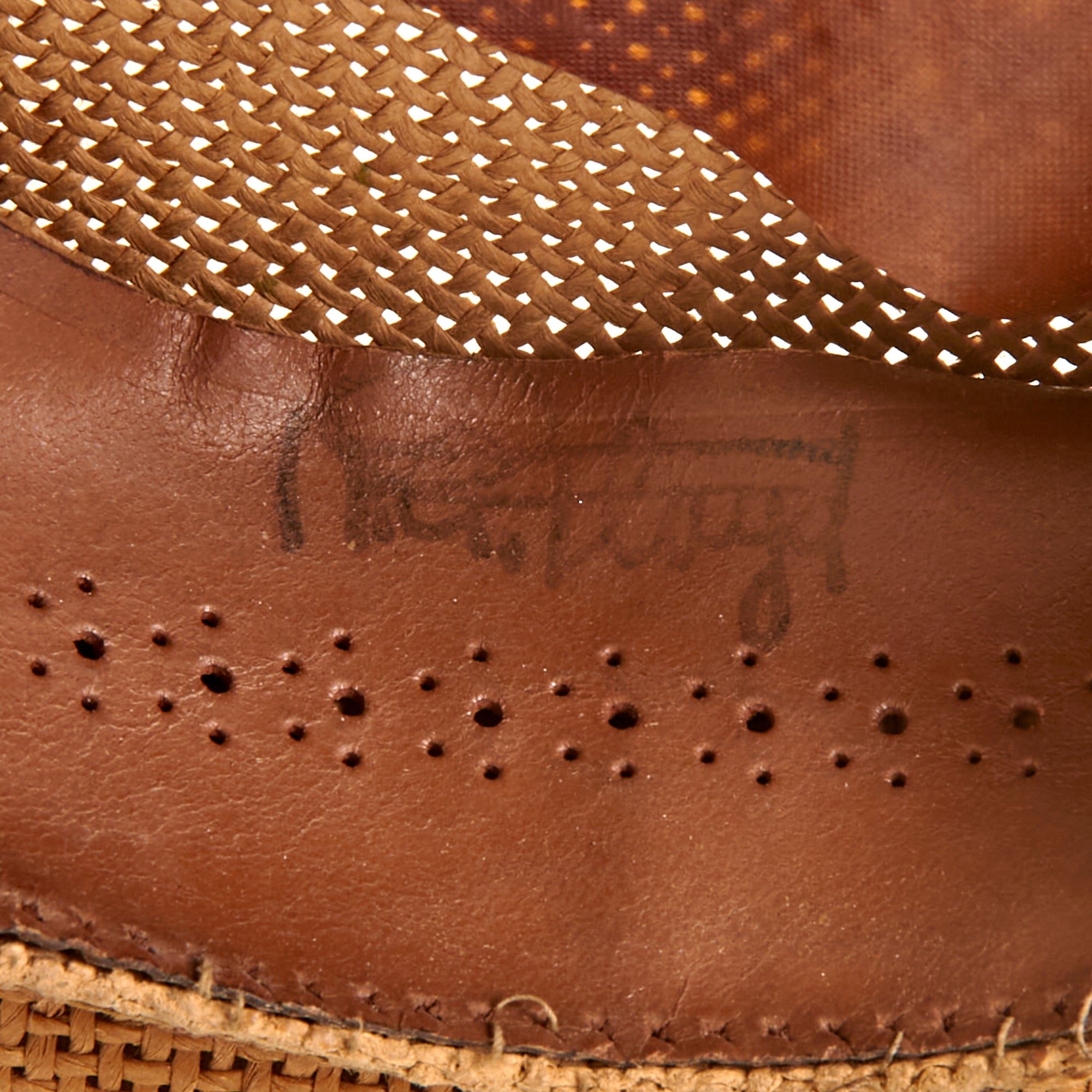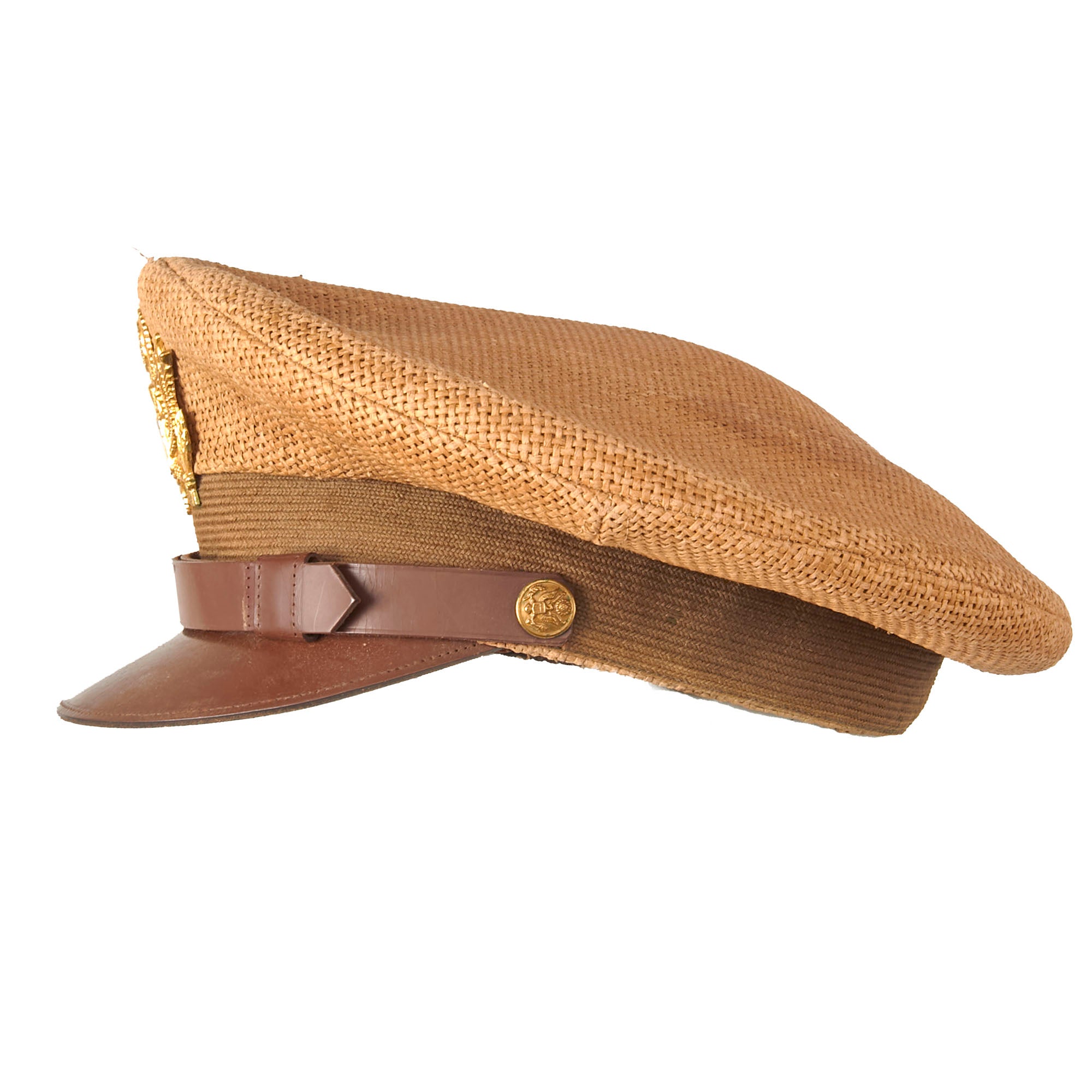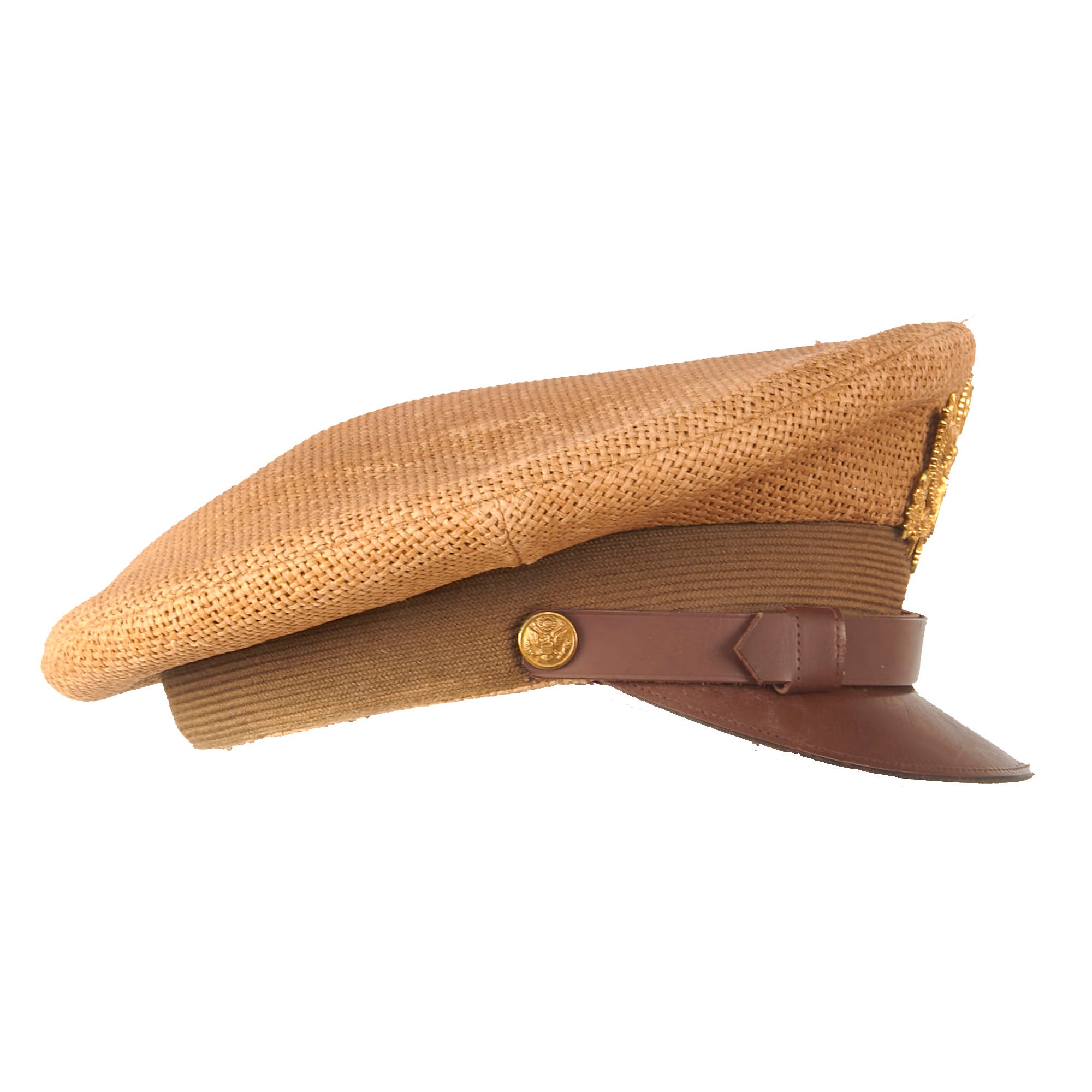 Original Item. One-of-a-Kind. This is a fantastically unique piece of headgear, a WWII Officer’s visor cap with a theater-made wicker crown & body, with an OD Green hat band on top of the wicker. This is one of the most interesting visors we have ever seen. There is a name stamped onto the sweatband multiple times with a small name card that corresponds, reading CAPT. R.A. FLOYD. This makes for a great research project.