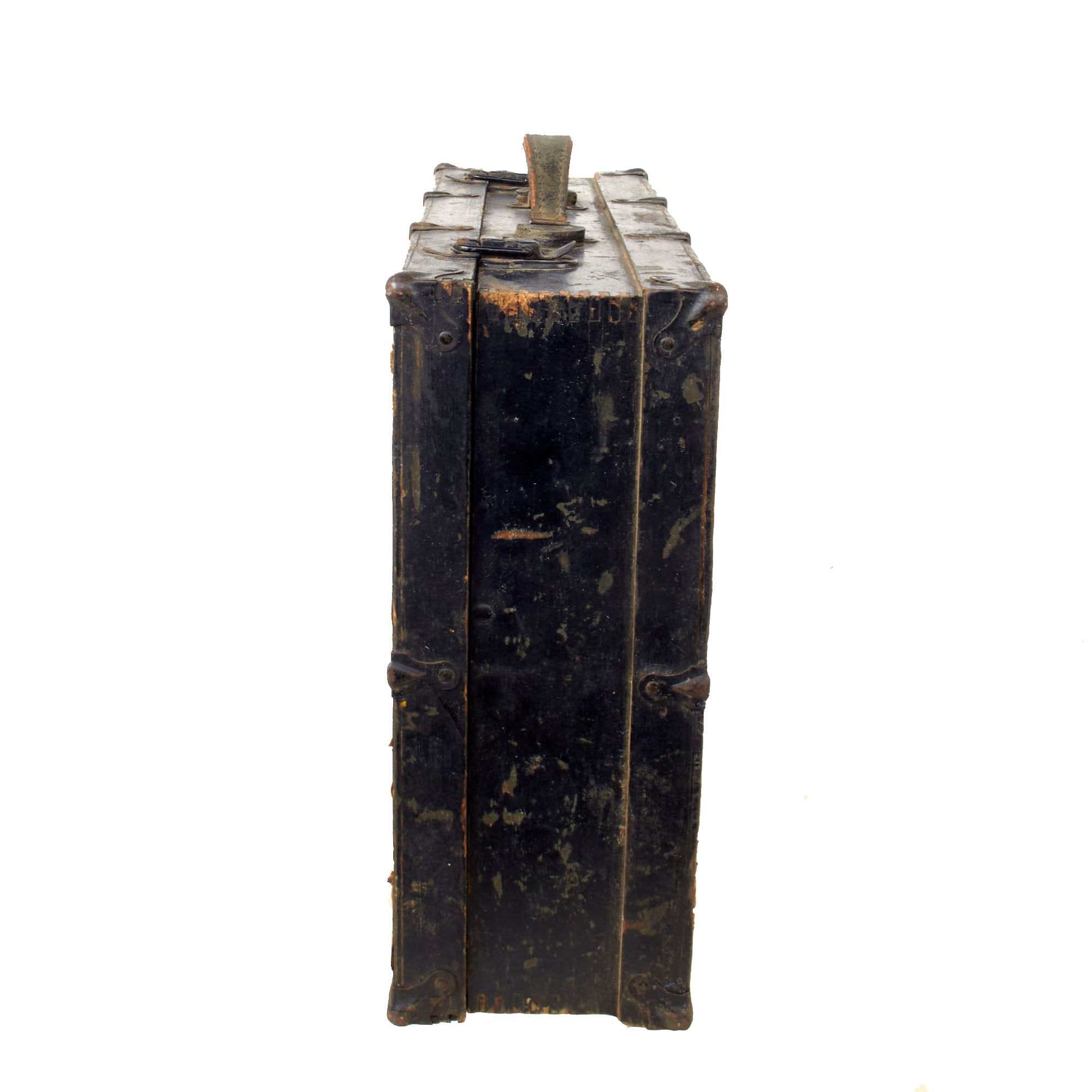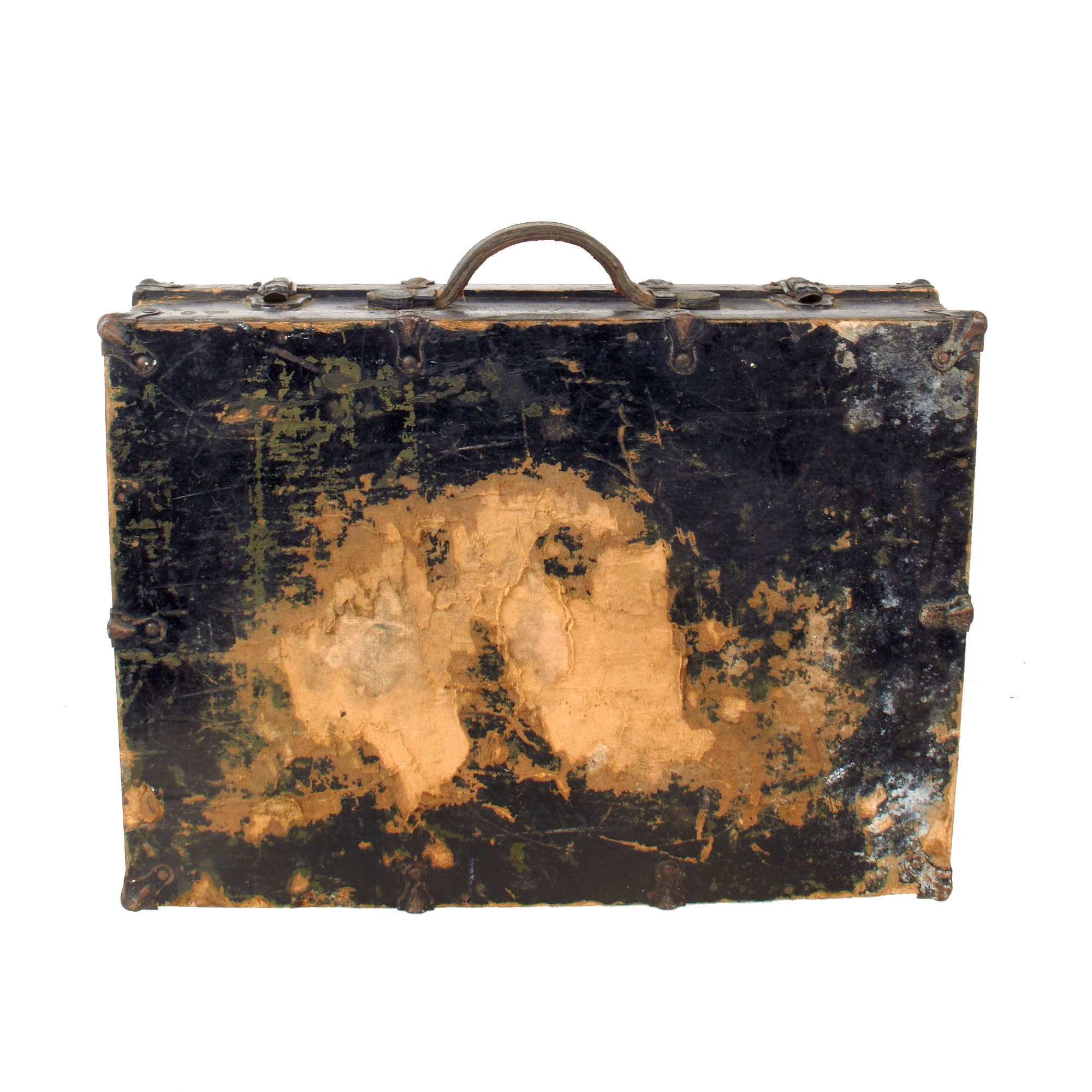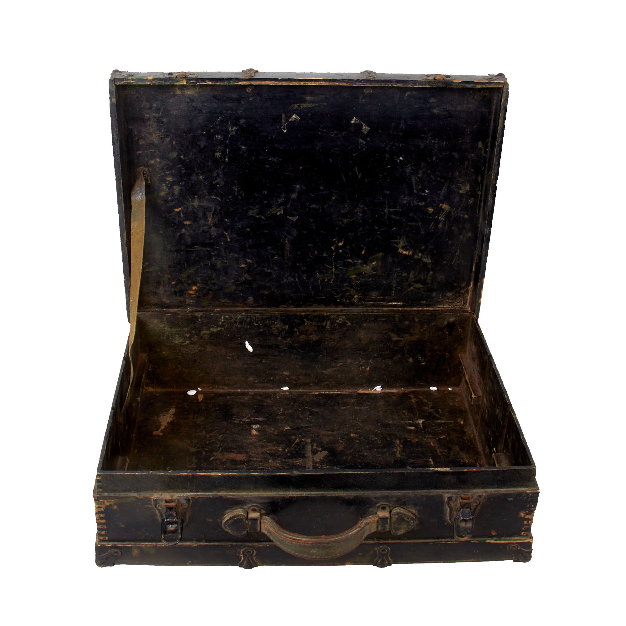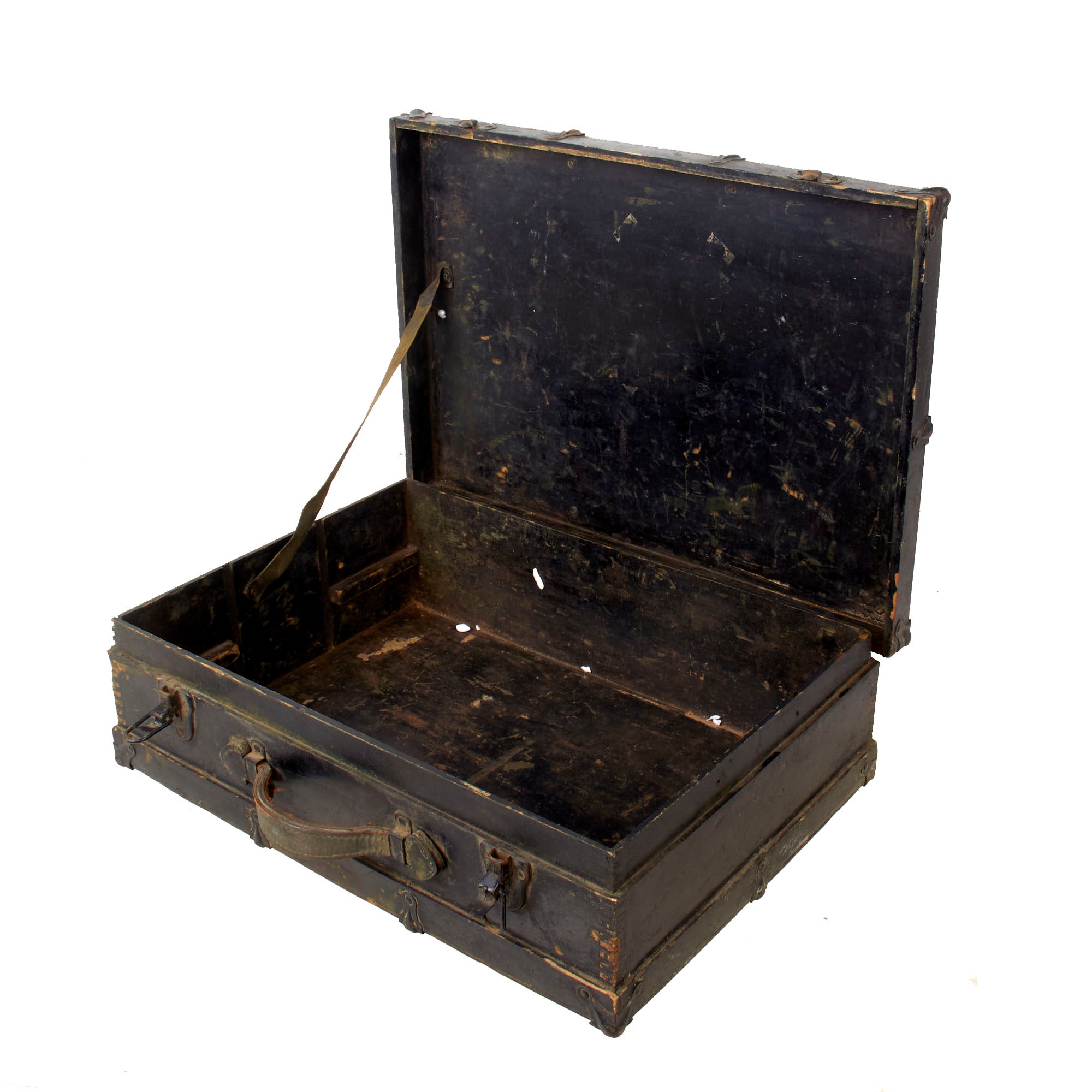 The suitcase measures 18¾ x 15 x 5⅜” and shows very heavy service wear with scuffing to the finish. The back of the suitcase has heavy material loss as shown. The leather carrying handle is retained and the two front latches work well. The painting of the 40th Fighter Squadron insignia is particularly outstanding. The 5th Air Force insignia is also gorgeous, with the name ART FOTINO painted in the center, which we were able to identify as Arthur Gerard Fotino.