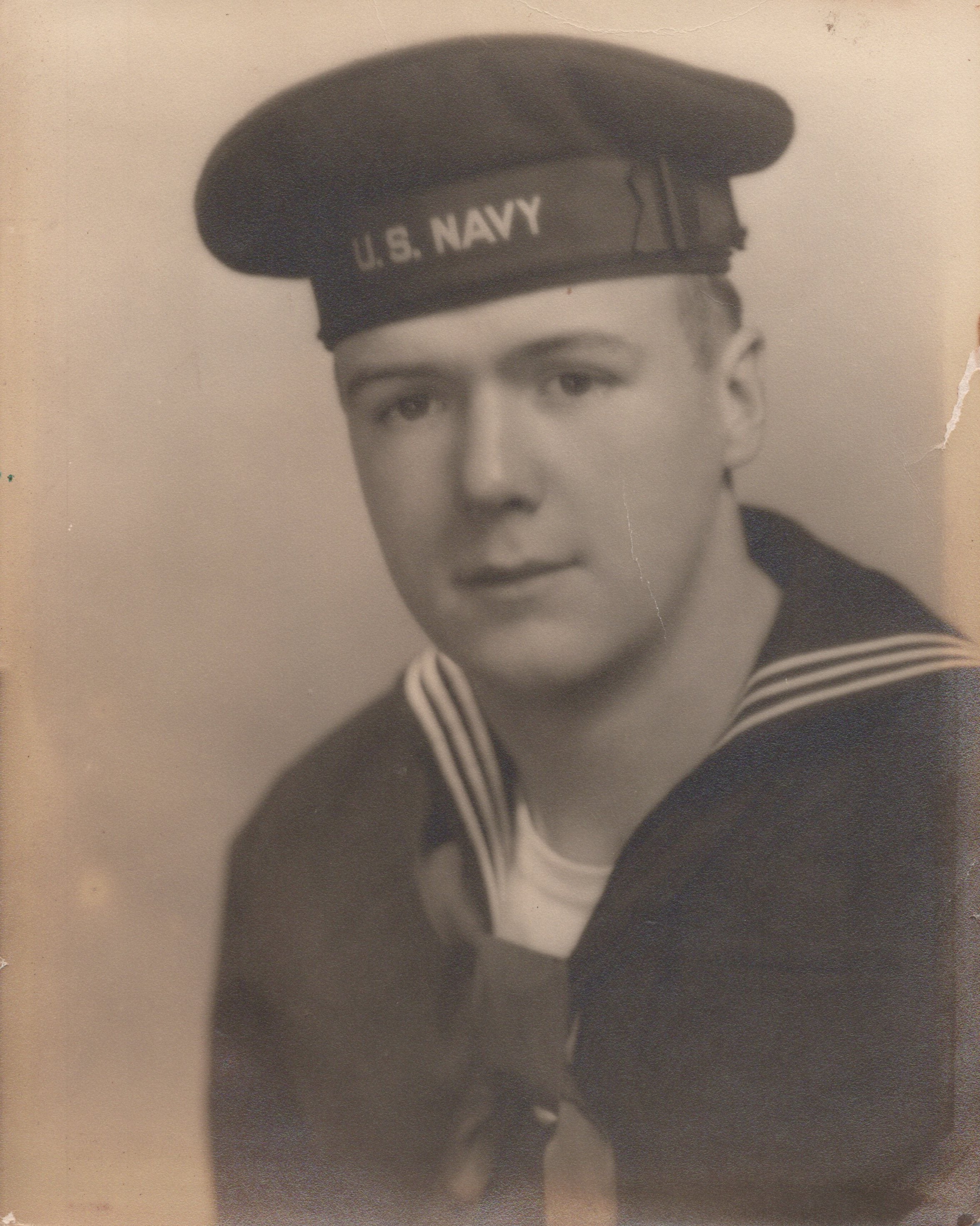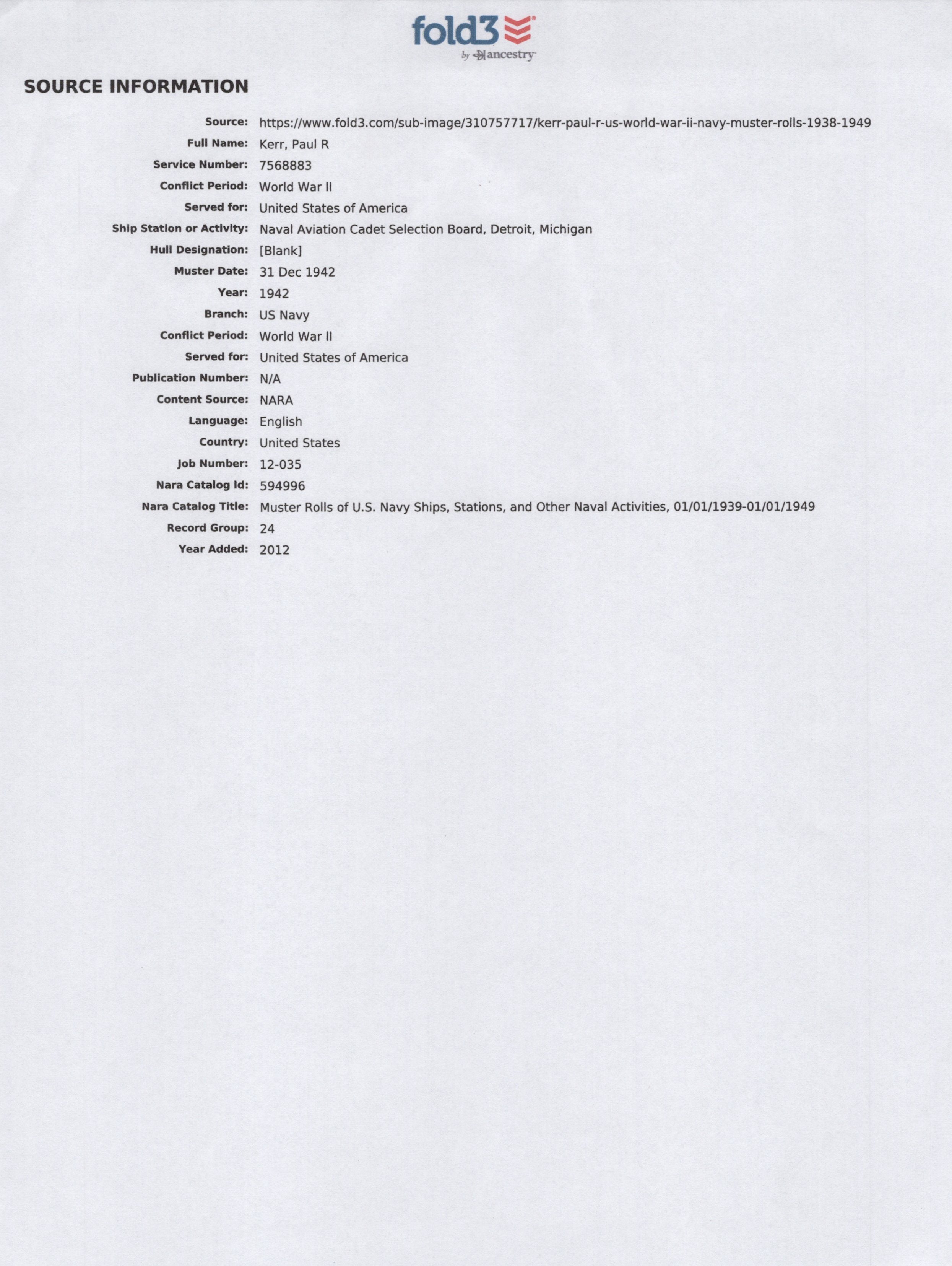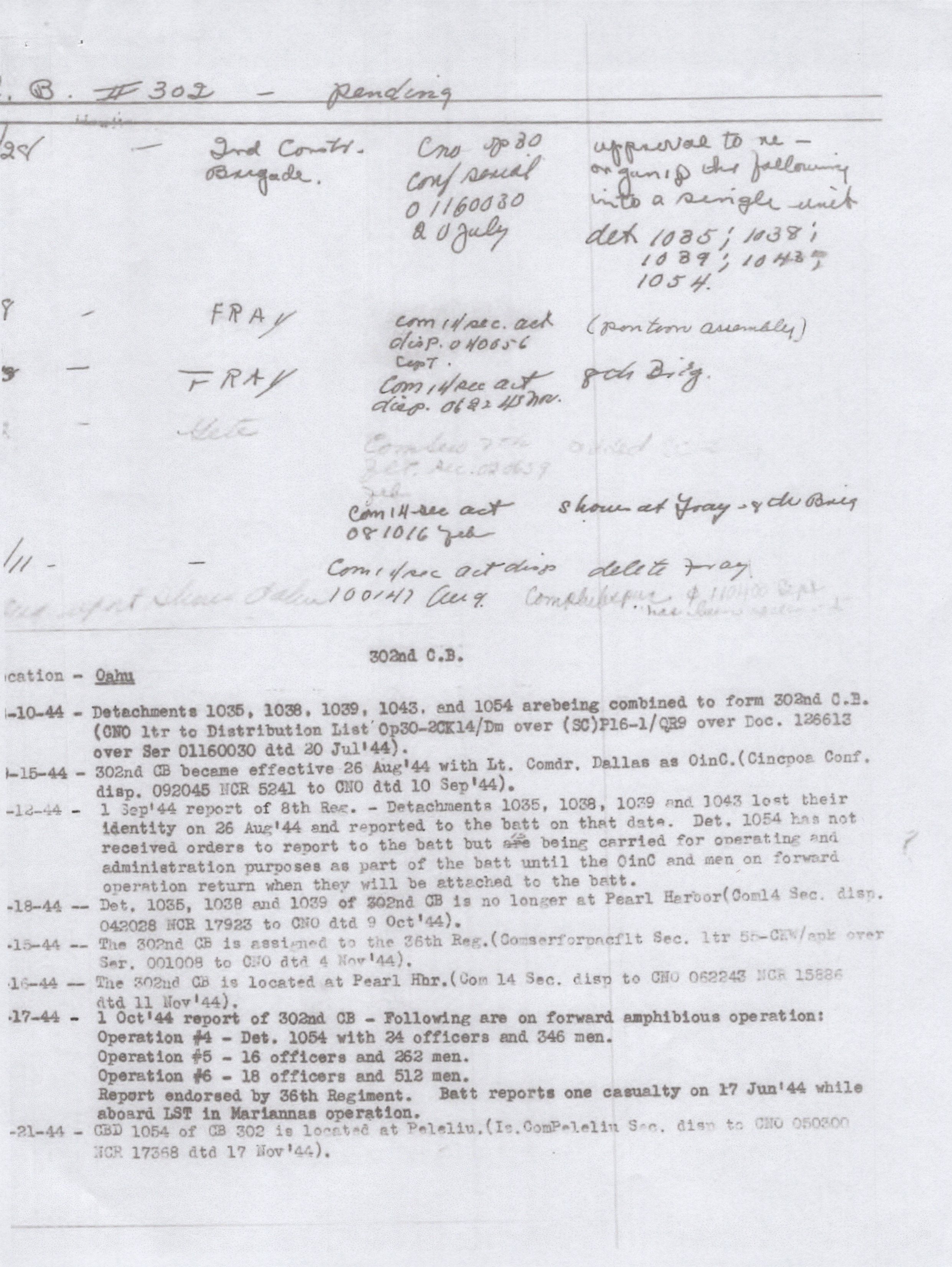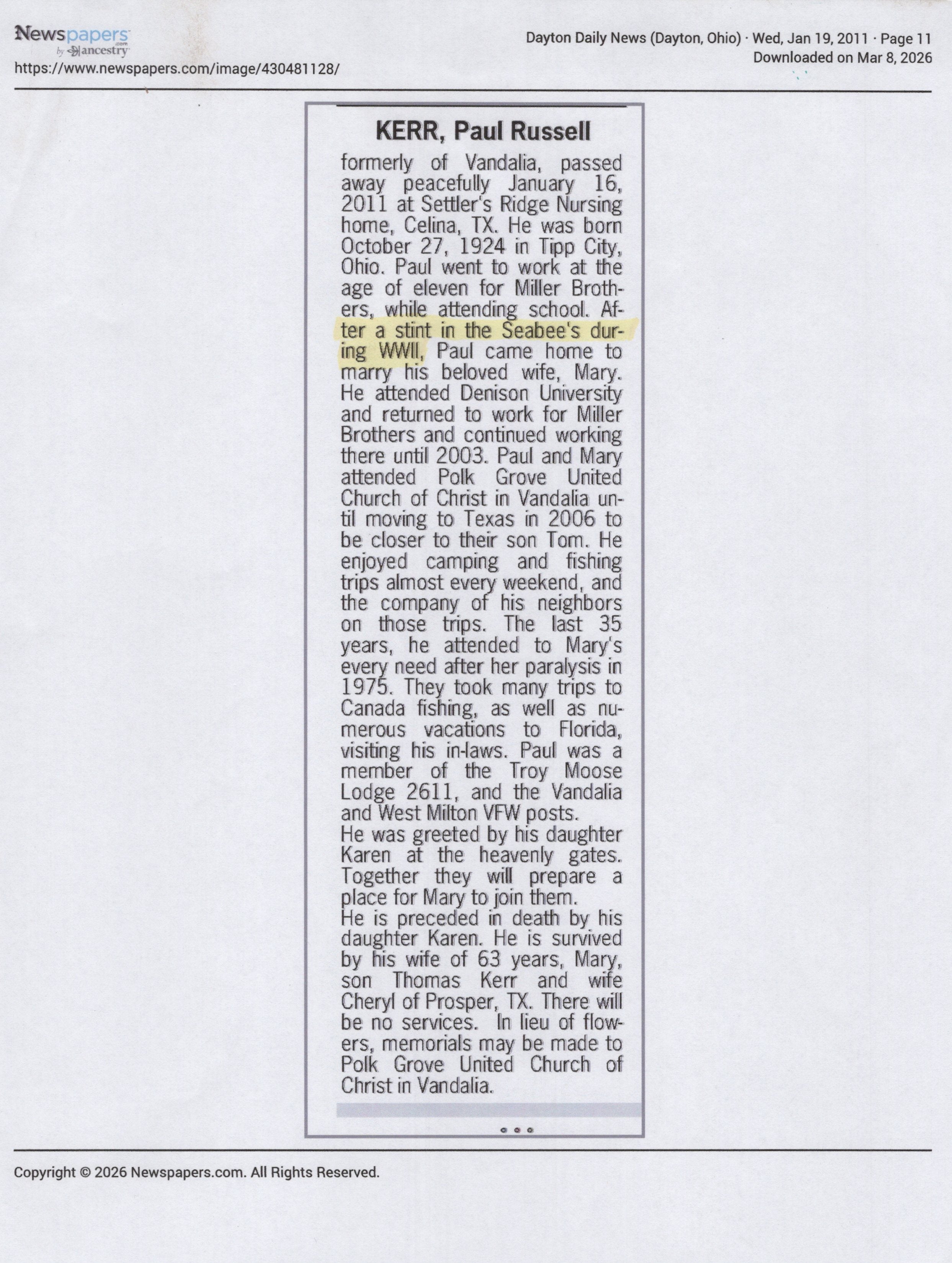We found a newspaper article photograph showing men signing up for the naval reserve, and at the right end is Kerr in his uniform with a Seabee patch and rate visible, a lucky coincidence. With the knife is an 8 x 10” portrait of Kerr in uniform. There is also some research documentation on Kerr and his unit, the 302nd Naval Construction Battalion, or Seabees. There is a complete history of the battalion included.
