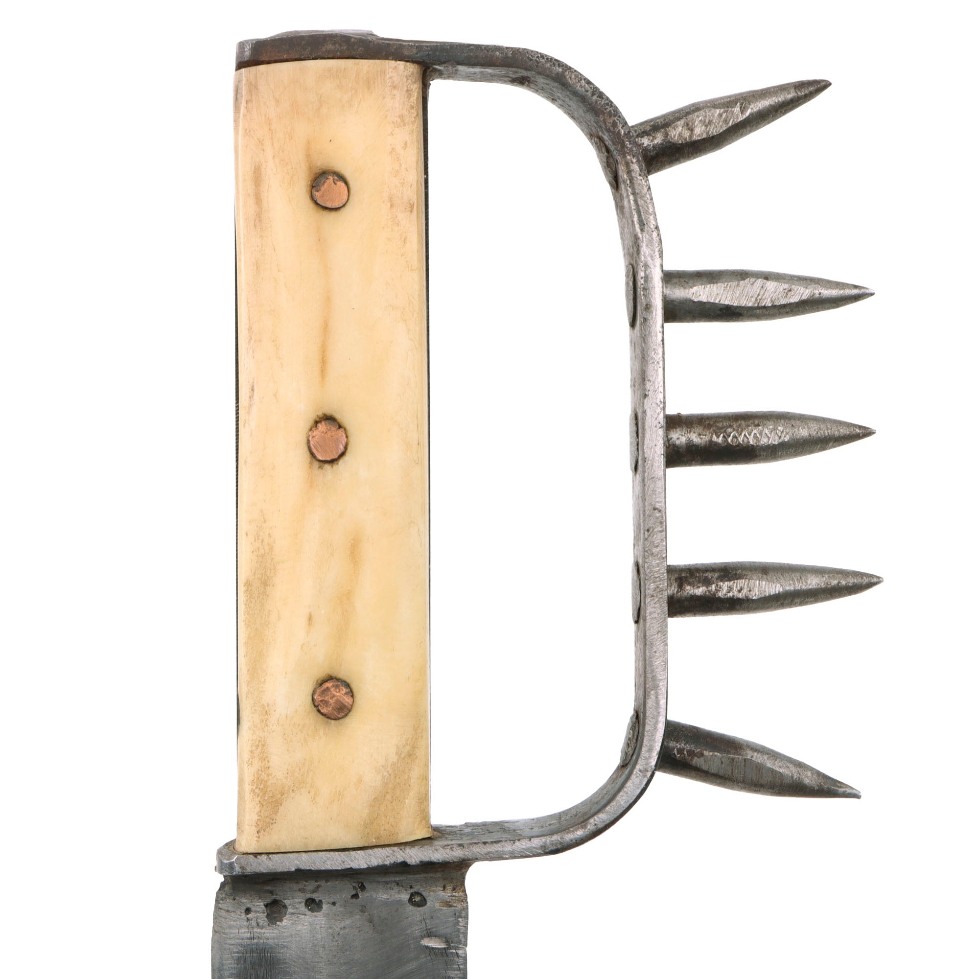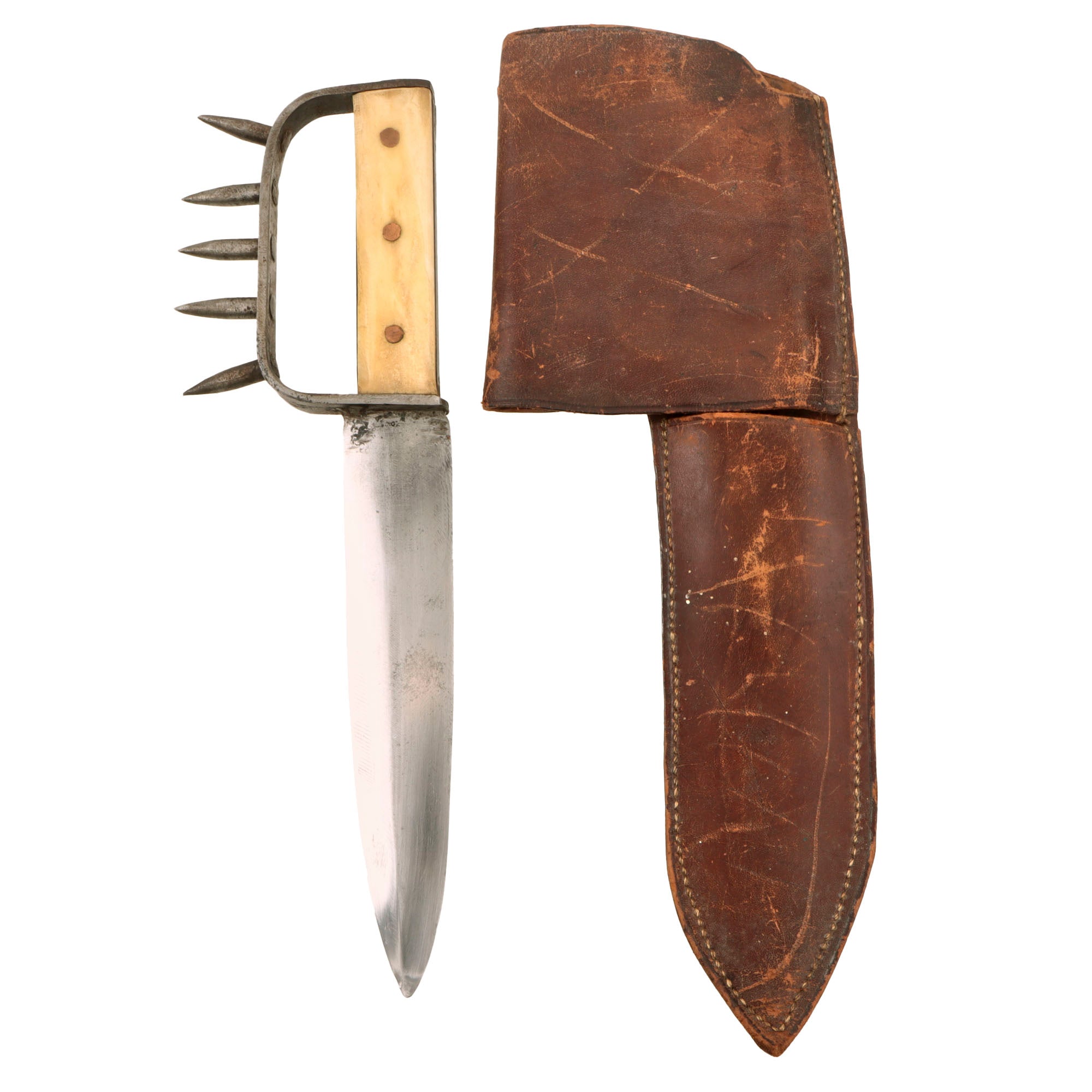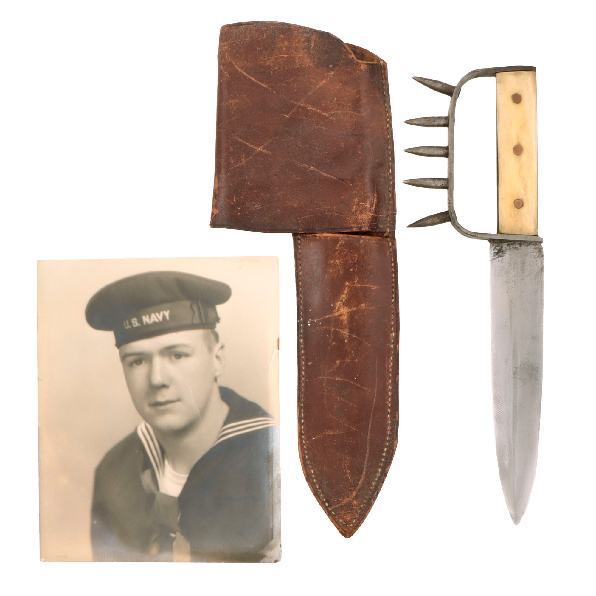 This is a very interesting and deadly custom-made knuckle fighting knife with a great custom scabbard identified by the serial number on the scabbard to Navy Seabee Motor Machinist's Mate 3rd Class Paul Russell Kerr. The knife has a bone grip, a very long double-sided blade, and a wide D-Guard with five long and sharpened spikes. The blade and D-guard are actually the same piece of metal tooled down. Another piece was added as a base for the grip, with two pieces of carved bone held in by three brass rivets. The knife comes with an original portrait of Kerr in his Naval uniform.