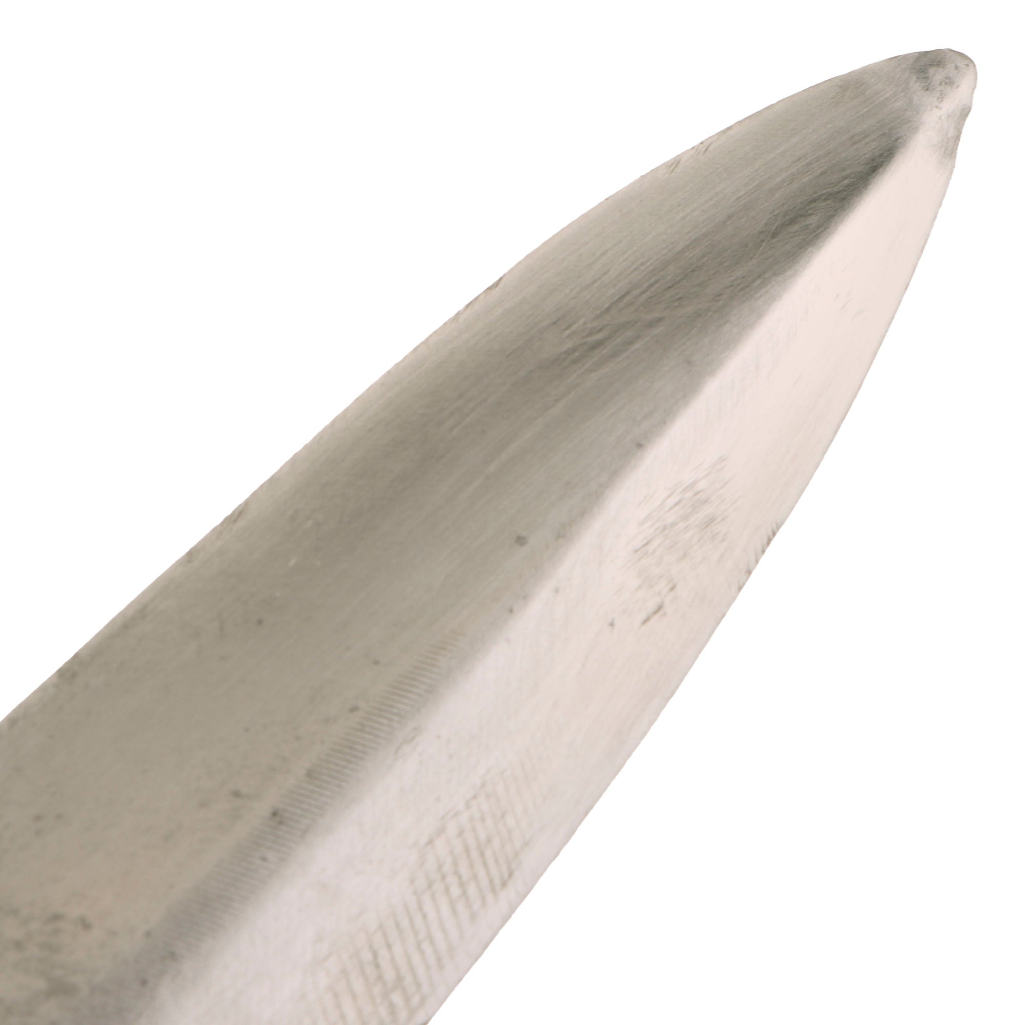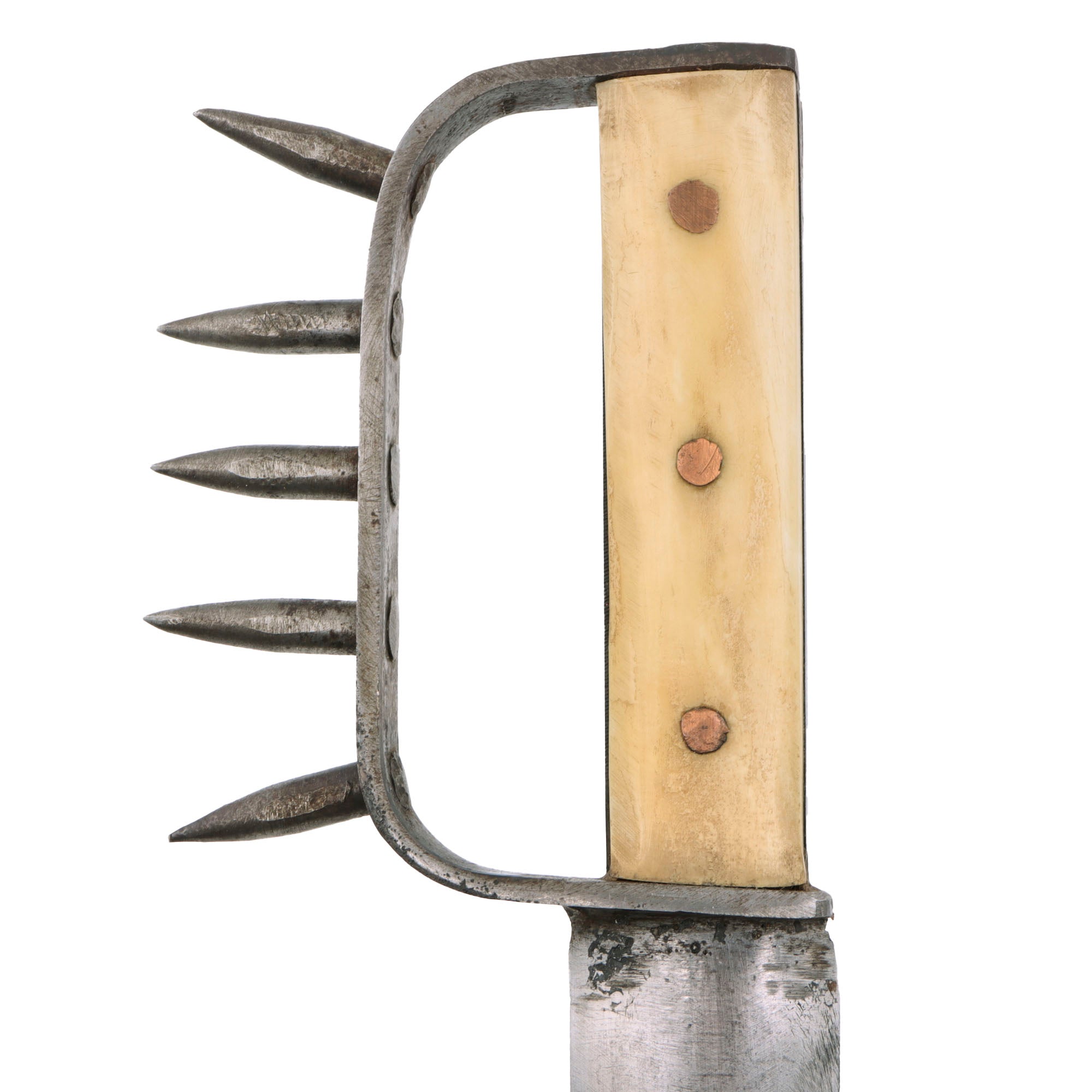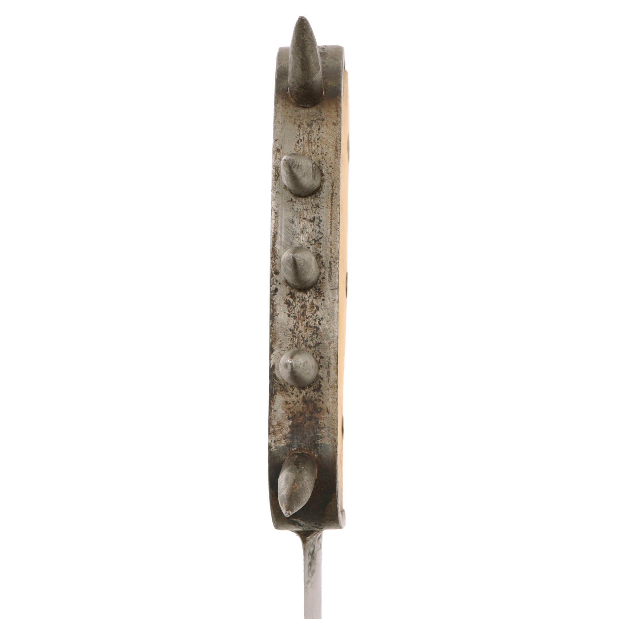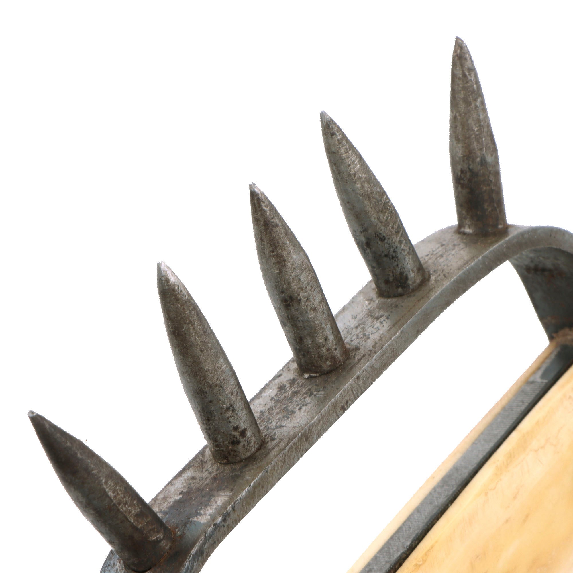 The knife sports a 9⅛” blade which is double-edged, measuring 1¾” wide at its widest. The blade has been heavily sharpened and tooled, and is extremely sharp. The spikes measure 1 ½” long and are very intimidating. There is a bulge at the pommel. The knife is 14 ⅝” overall.