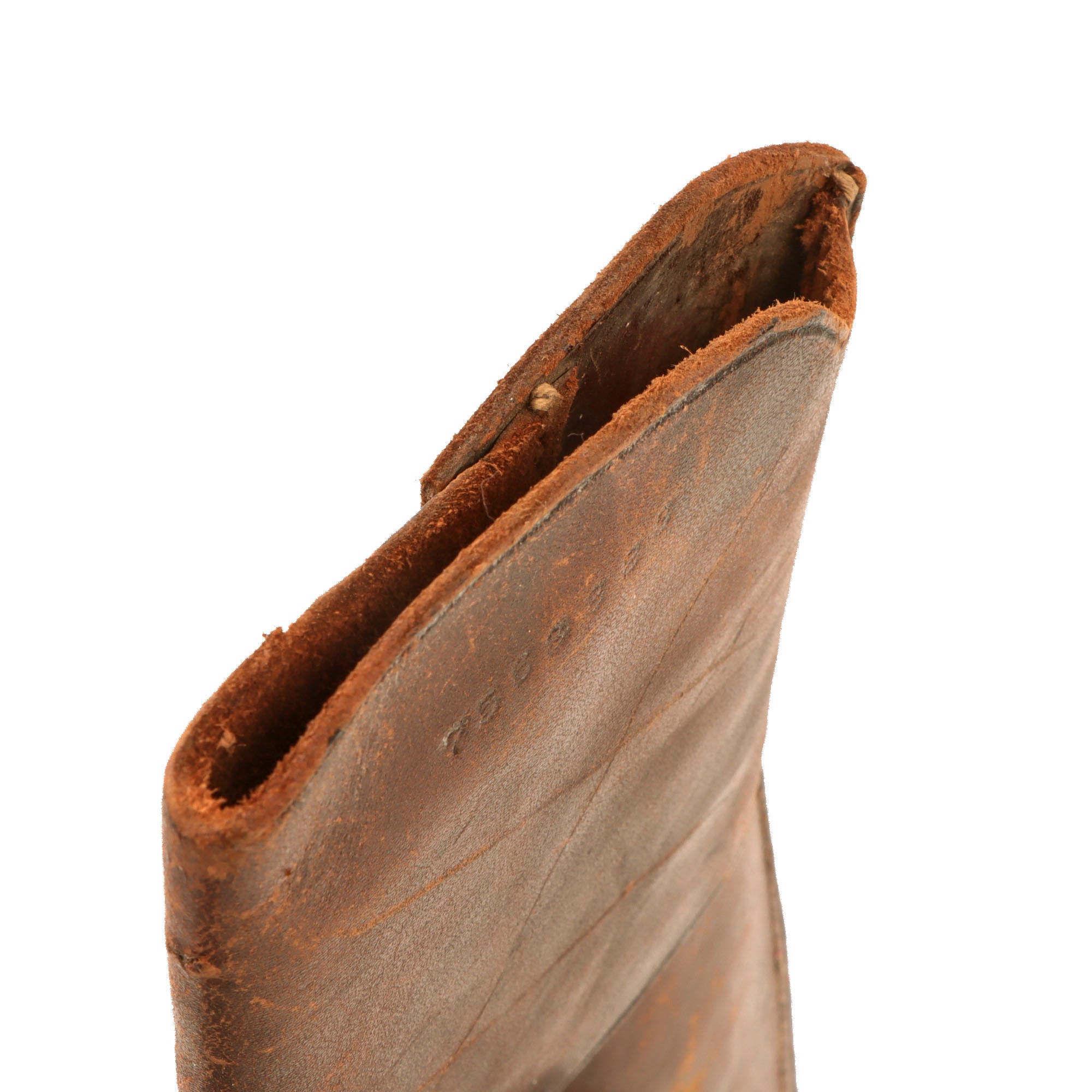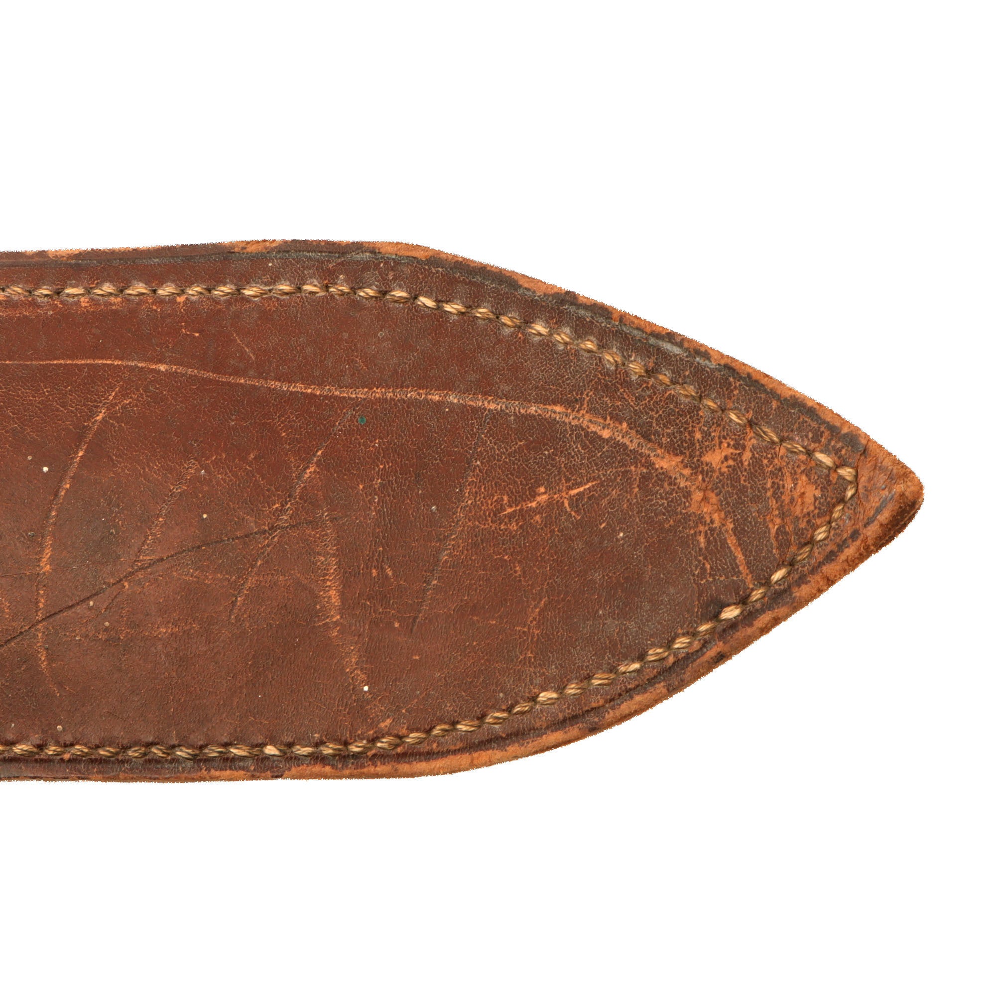 The scabbard was custom made for the knife, measuring 16 ¾” overall including the belt loop which acts as another scabbard for the spikes. It is very massive but the belt loops are in good shape. There is heavy scuffing and wear to the scabbard, but it is stamped near the top edge 7568883, Kerr’s Navy serial number.