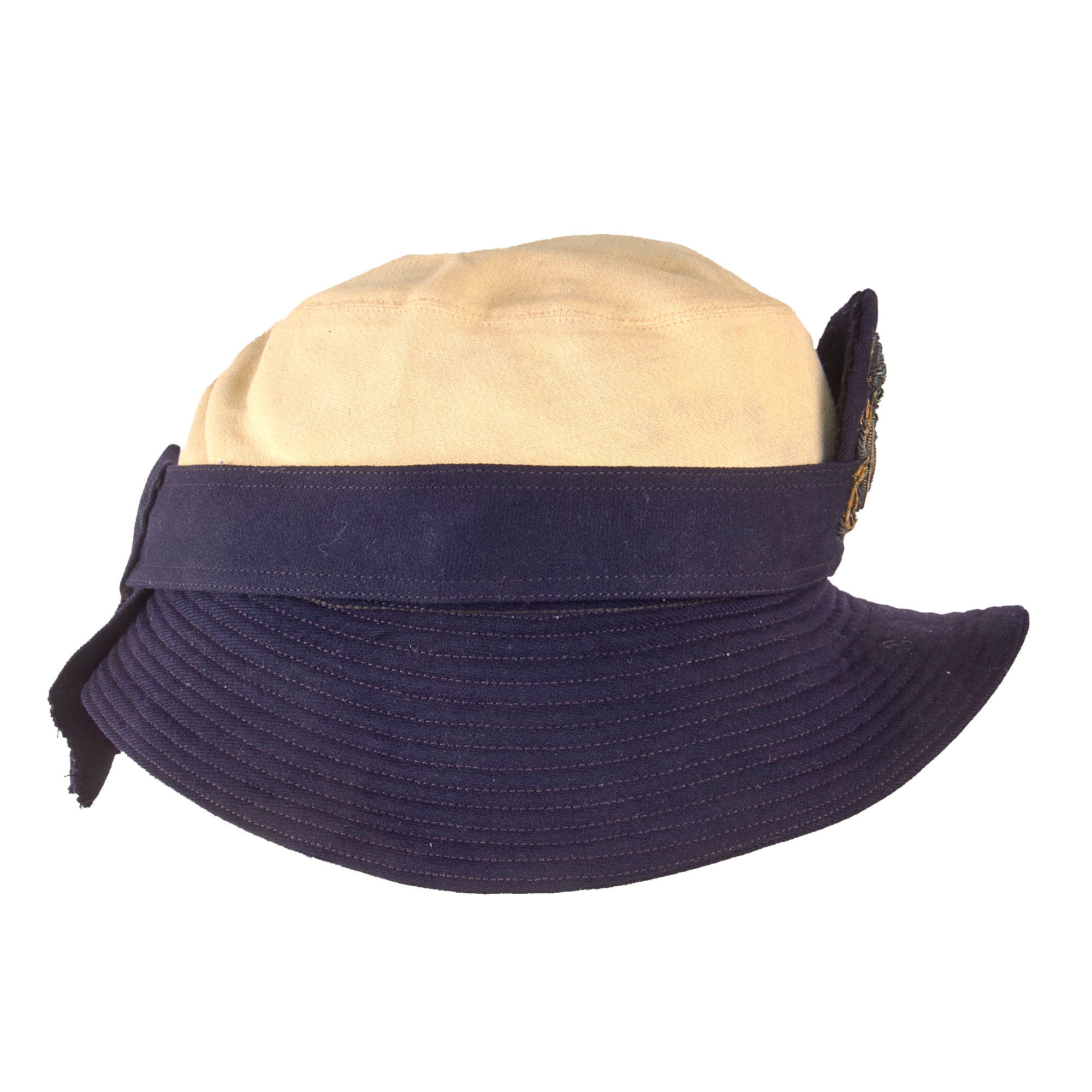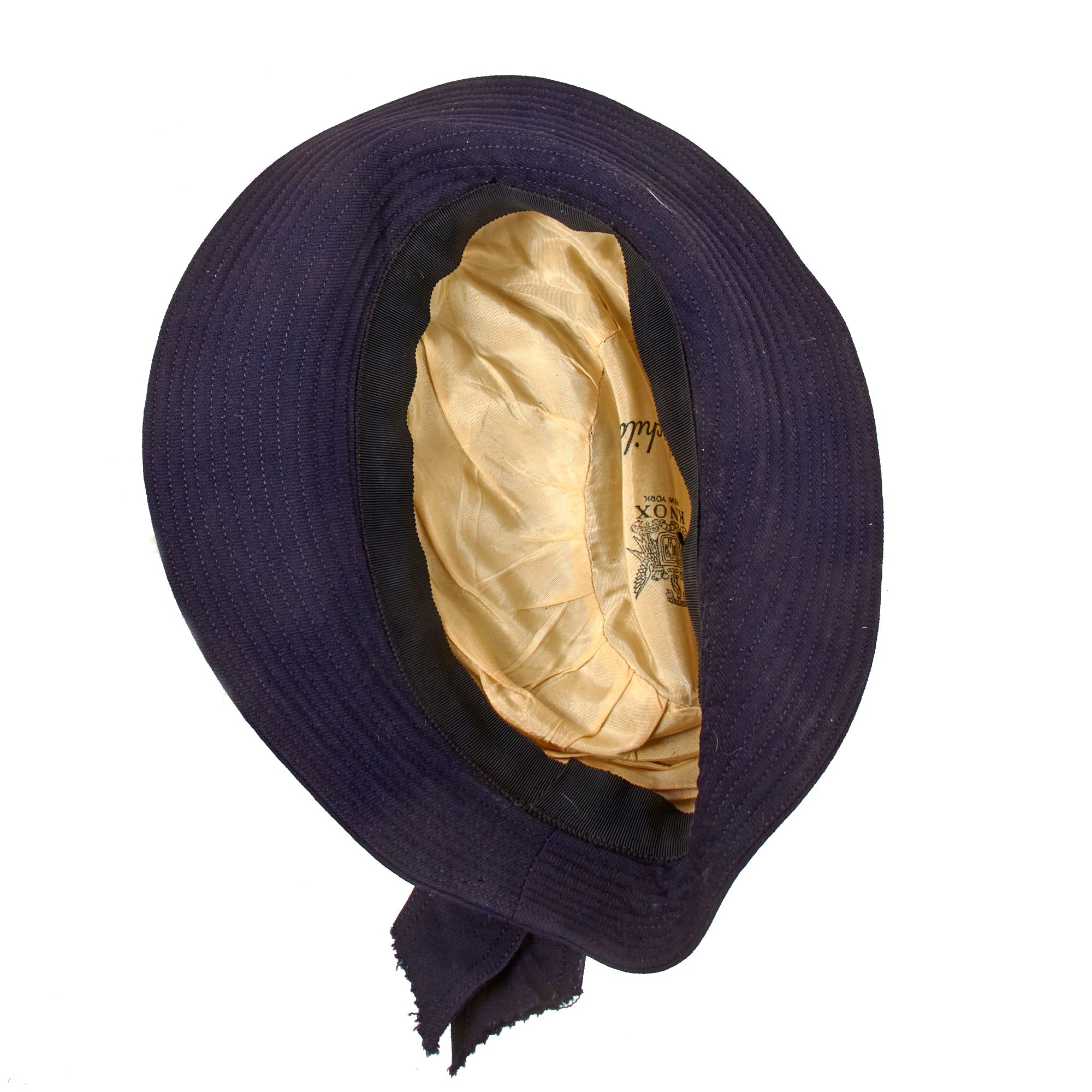 This is a very rare WWII Navy “WAVES” Female officer’s cap, with the original officer’s cap badge. This example was manufactured by Knox of New York for retail in “Rothschild’s”. There is no size marked but it is roughly a size 6 ½.