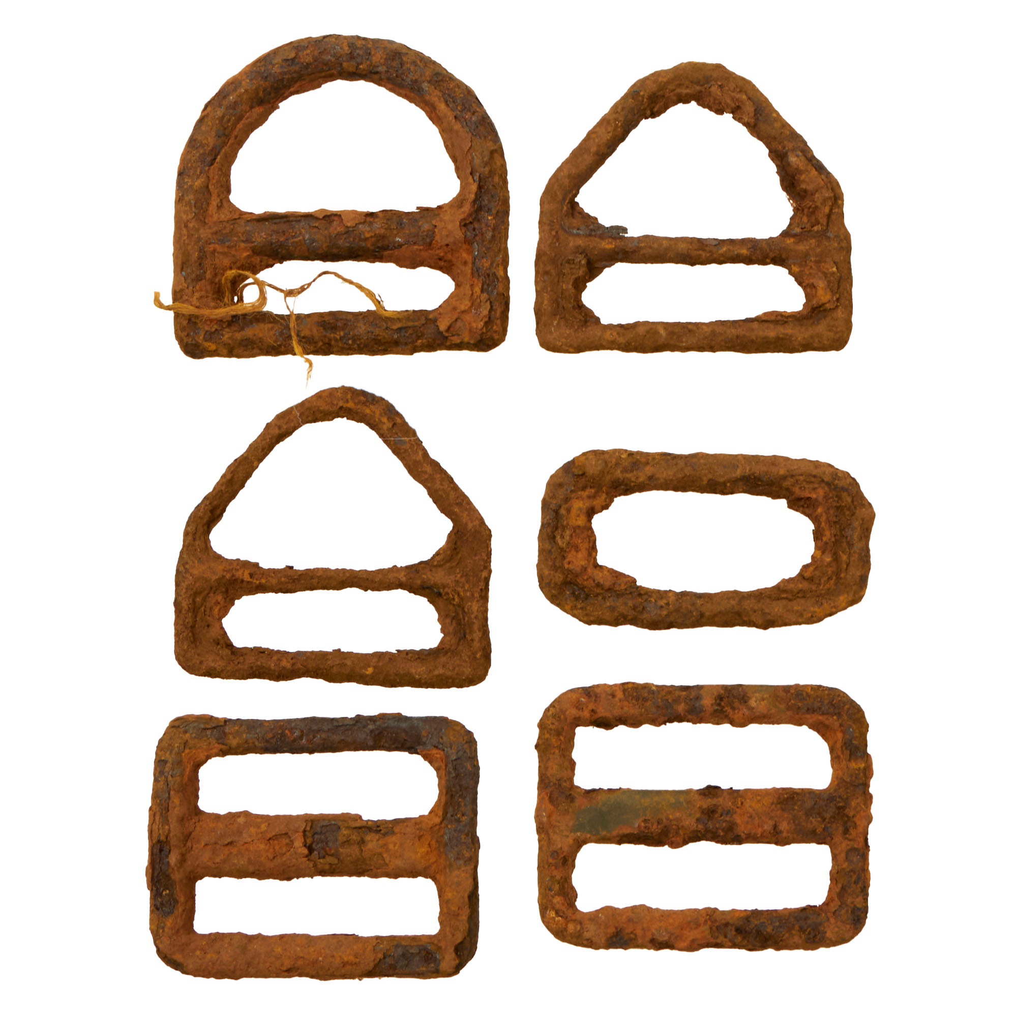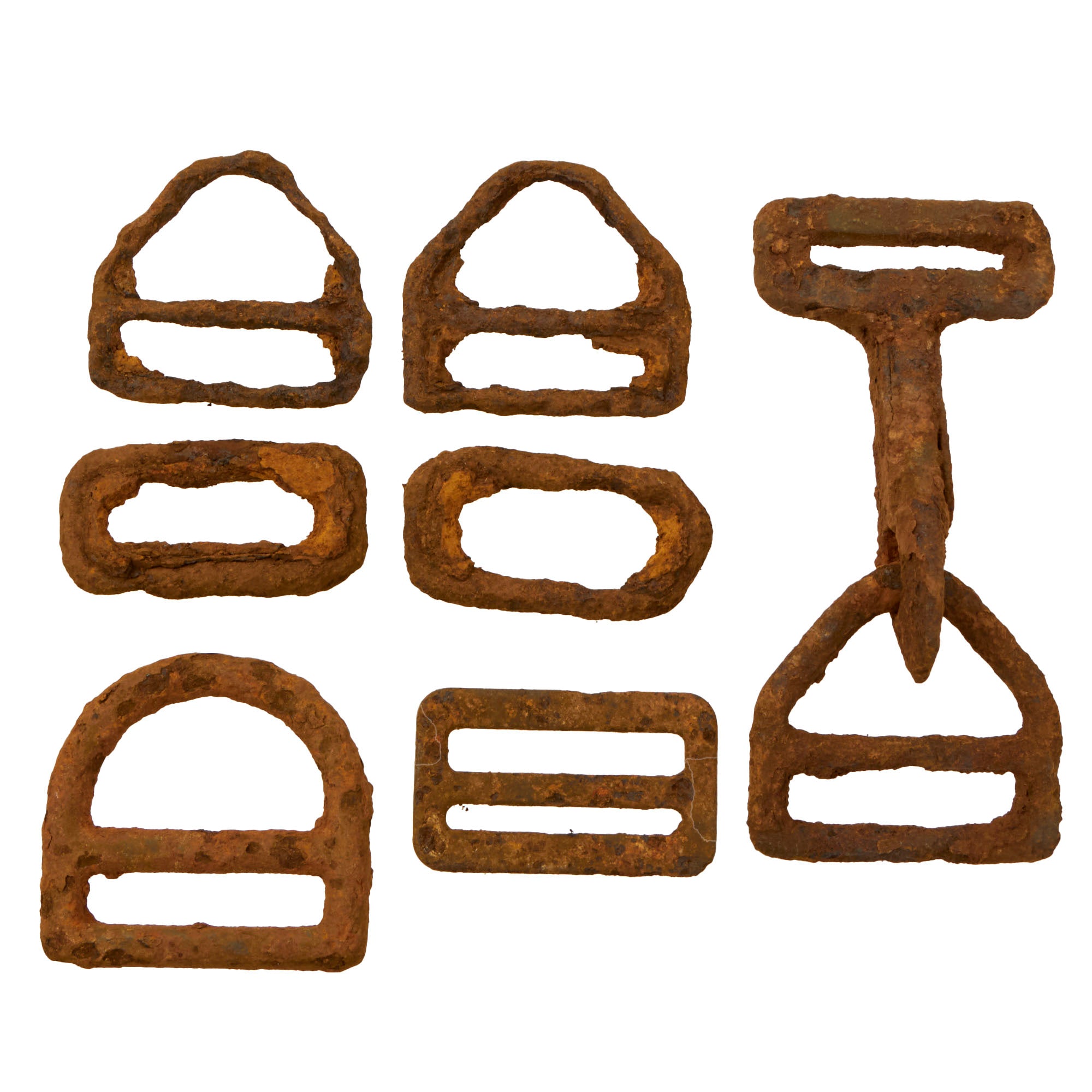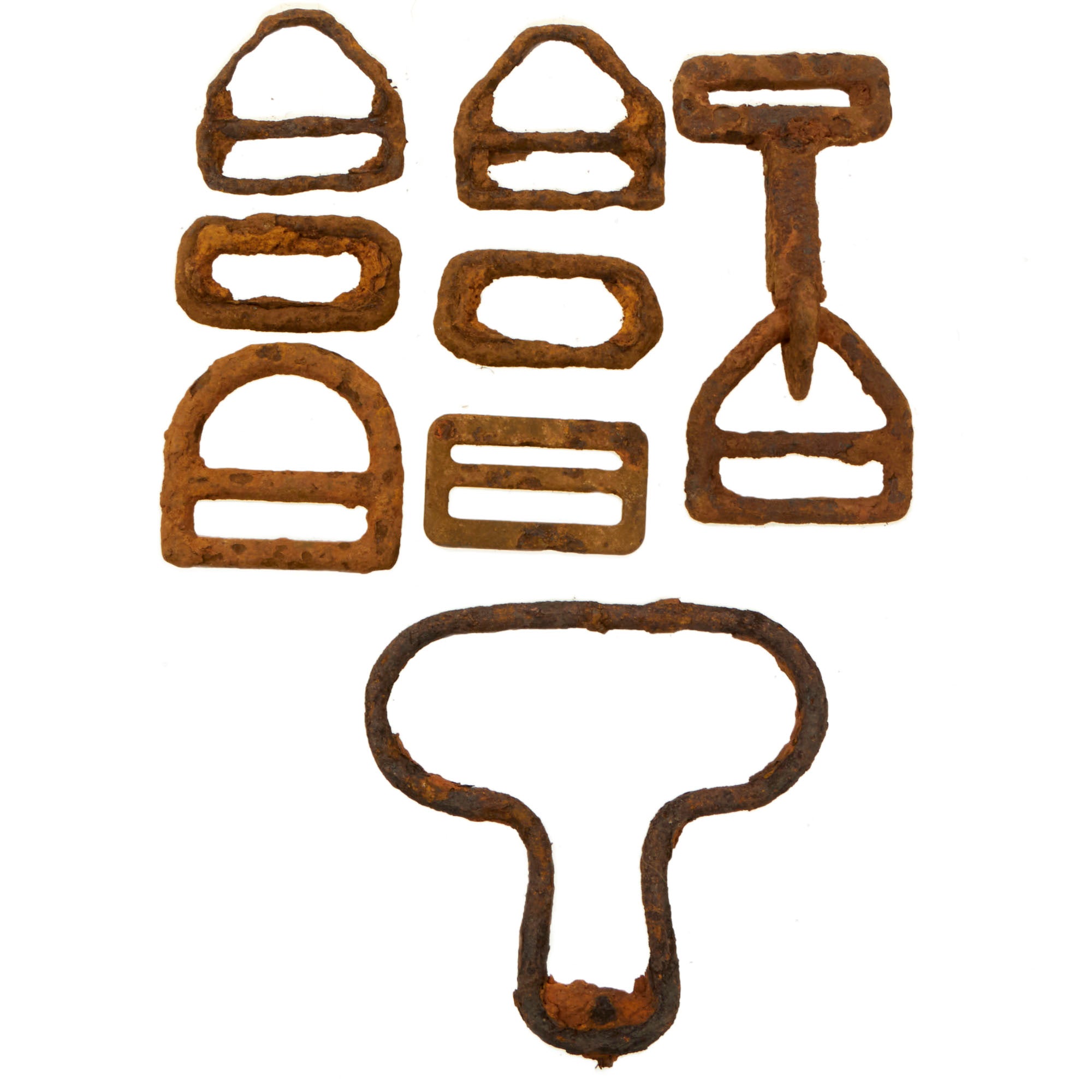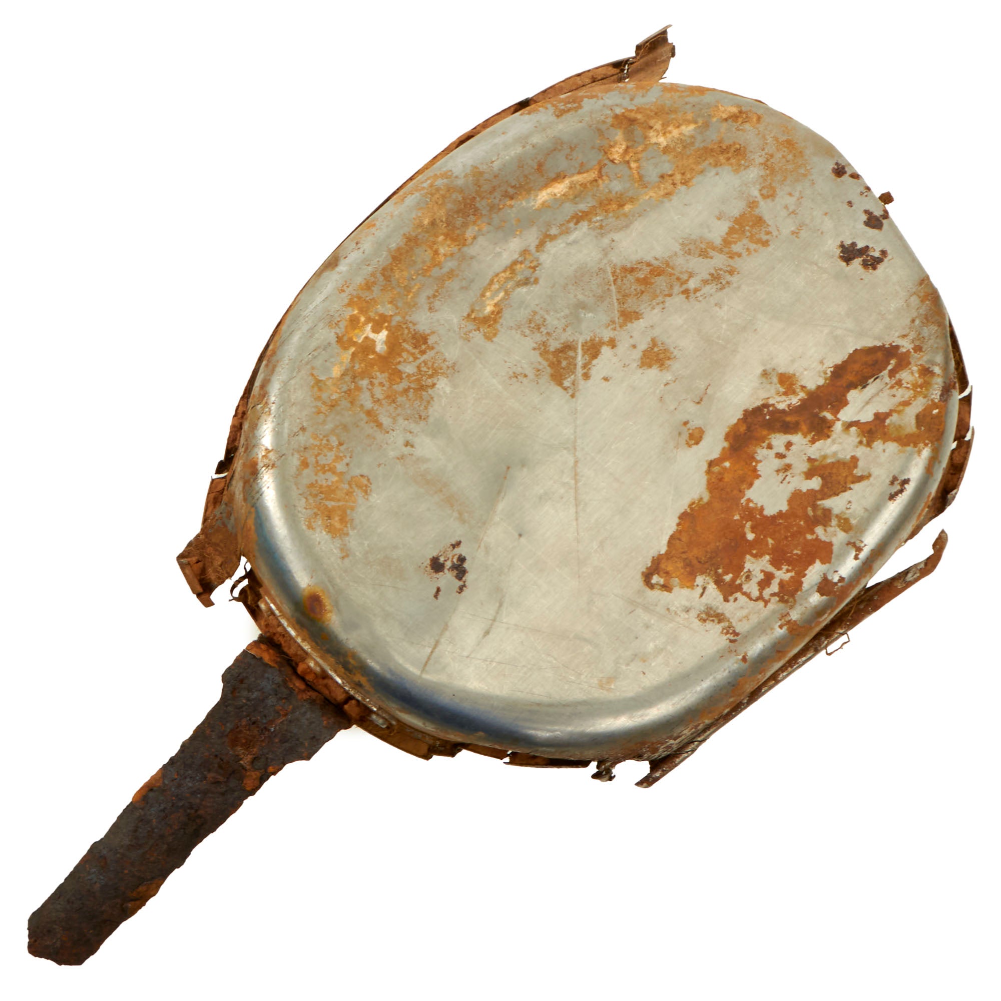 There are seventeen different parachute hooks & hook fragments. Some of the hooks retains some rigging, but most are just the heavily oxidized hook pieces on their own. The mess kit piece is heavily torn apart and has several very sharp fragments sticking out, so be careful when handling this. The handle is partially retained but very oxidized.