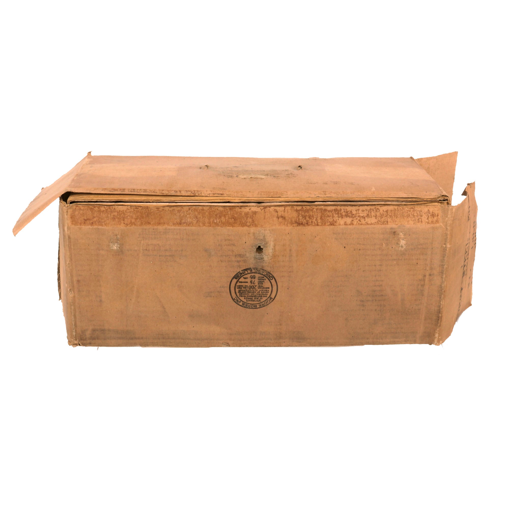 The original cardboard shipping box is in disrepair with it having broken in several places with the cardboard separating as well. The box retains a label on the front reading: